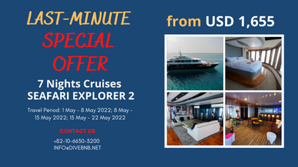8 Days/ 7 Nights Central Atolls - SEAFARI EXPLORER 2Travel Period: 1 May - 8 May 2022; 8 May - 15 May 2022; 15 May - 22 May 2022 Itinerary: Central AtollsSALE PRICE: from USD1,655Vessel: SEASAFARI EXPLORER 2PACKAGE INCLUSIONS:⦁ Full-Board Meal Plan (All meals), Snacks⦁ Airport Transfer⦁ Drinking water, tea and coffee⦁ Beach BBQ⦁ Diving package⦁ Nitrox⦁ Land excursions⦁ Cabin towels, complimentary toiletries⦁ wifi internet⦁ VAT