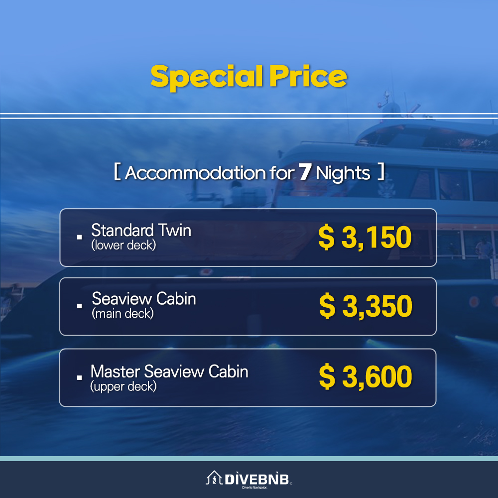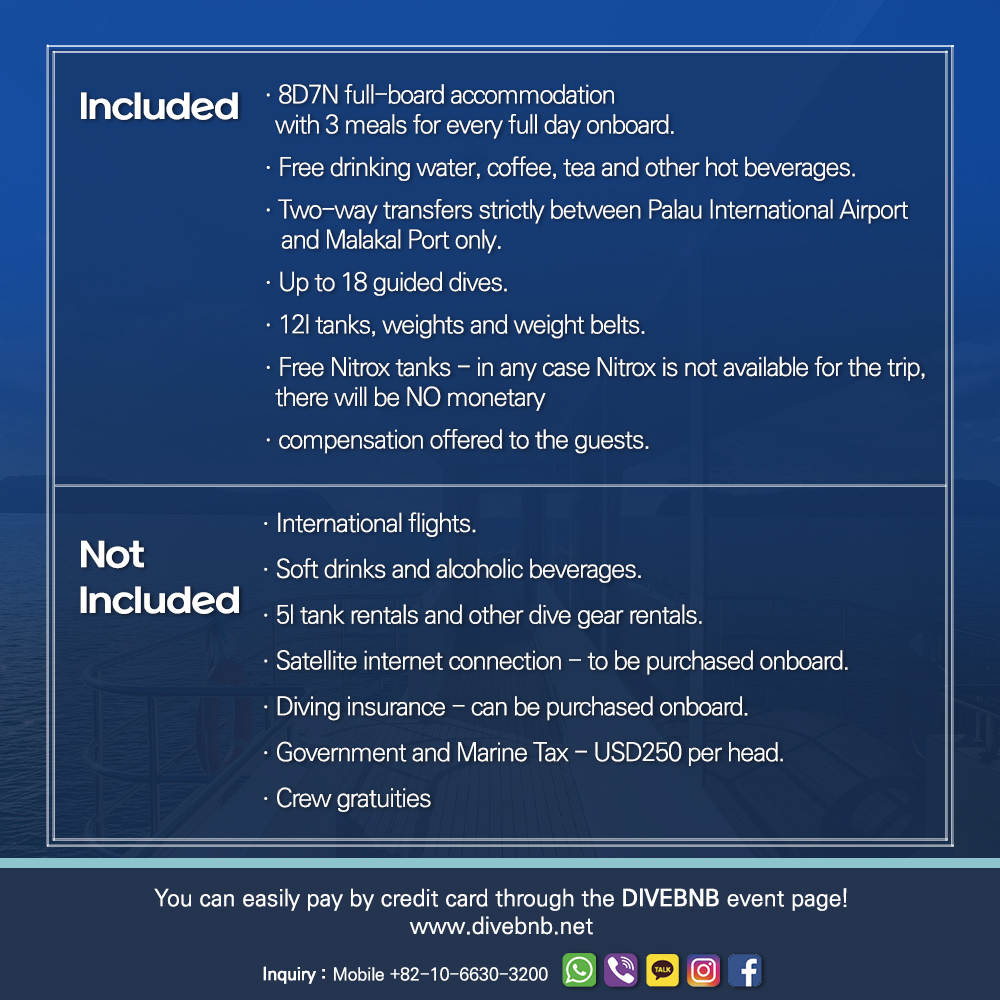 Accommodation with full-board meal plan Free drinking water, coffee, tea and other hot beverages Two-way transfers strictly between Palau International Airport and Malakal Port only Up to 18 guided dives 12l tanks, weights and weight belts Free Nitrox tanks - in any case Nitrox is not available for the trip, there will be NO monetary compensation offered to the guests