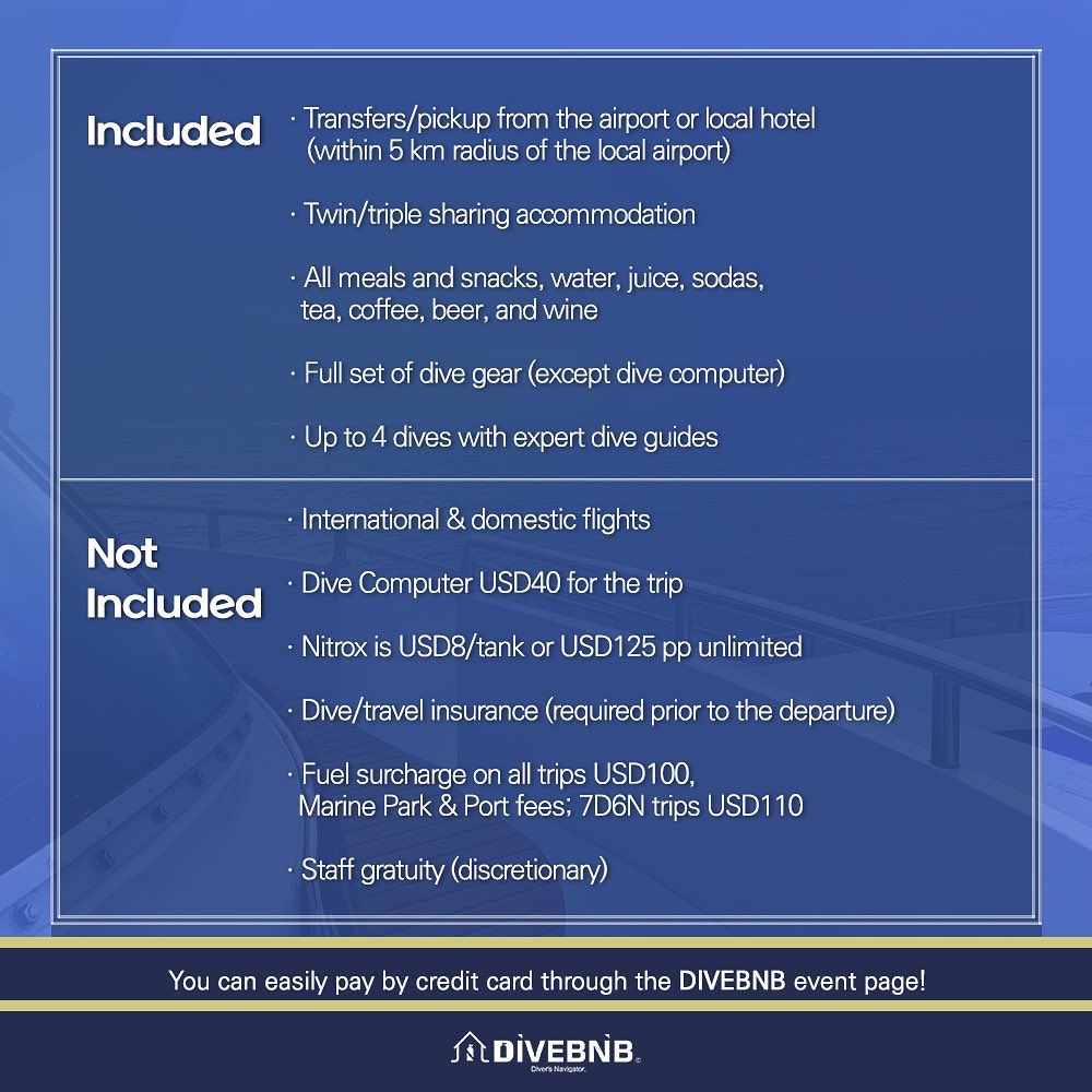 Exclusions: Nitrox $162 - commissionable if pre-booked. Transfers to/from embarkation/disembarkation * Rental equipment** Dive Insurance*** Fuel surcharge Marine Park