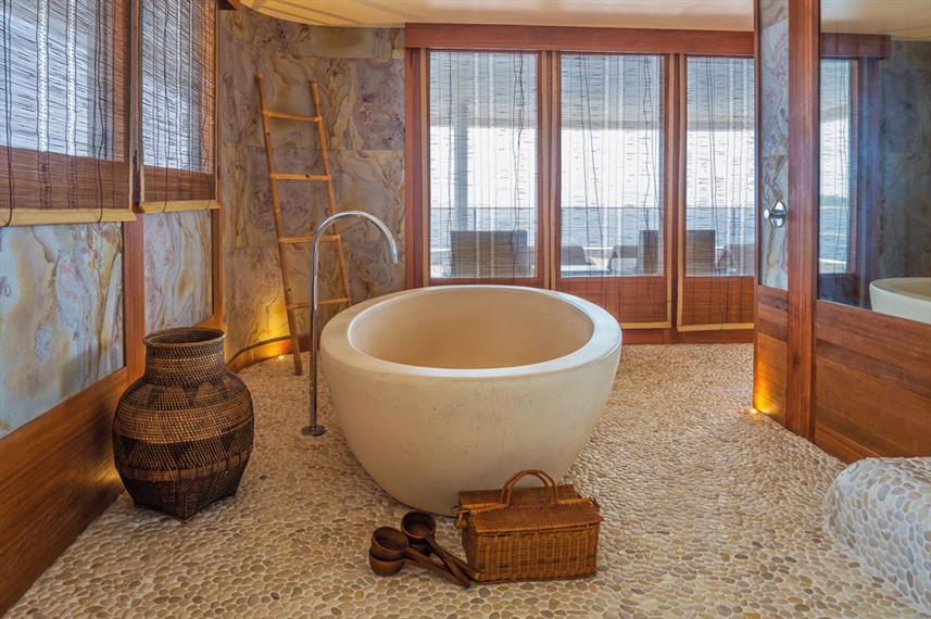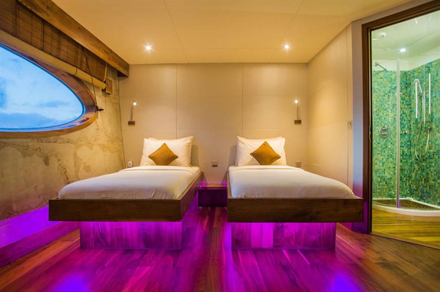Sea Star Suite - The Sea Star Suites are located on the lower deck. Sensual driftwood sculptures combine with earthy textures and jewel tones to create a relaxing ambiance. Each Sea Star Suite is generously fitted with two opening portlights. Maximum Occupancy: 2 persons Bed Configuration: Double (Cabin #10 Double and Single) Ensuite: Yes Aircondition: Yes, with control in the room Cowrie Suite - The Cowrie Suite is tucked away near the lower deck's bow. There is a queen-size bed as well as a luxurious, ruby-colored sofa that converts into a cozy second bed. The Cowrie Suite encompasses the width of the bow and features four opening portlights, as well as the largest shower on board. Maximum Occupancy: 2 persons Bed Configuration: Double and Single Ensuite: Yes Aircondition: Yes, with control in the room Dolphin Suite - The Dolphin Suites are beautifully designed and located on the main deck, each with a queen-size bed and ample seating areas. Vibrant blue fabrics compliment the nature-inspired color palette, and an oval panoramic window cut into the hull provides stunning views of the ocean. Maximum Occupancy: 2 persons Bed Configuration: Double Ensuite: Yes Aircondition: Yes, with control in the room Manta Suite - Located on the main deck, Manta Suites, are Scubaspa's luxury suites, offering comfy king-size beds with attractive lounging areas. Natural tones and materials are used in pared-back designs, and big oval panoramic windows cut into the hull provide continuous ocean vistas. Maximum Occupancy: 2 persons Bed Configuration: Double or Twin Ensuite: Yes Aircondition: Yes, with control in the room