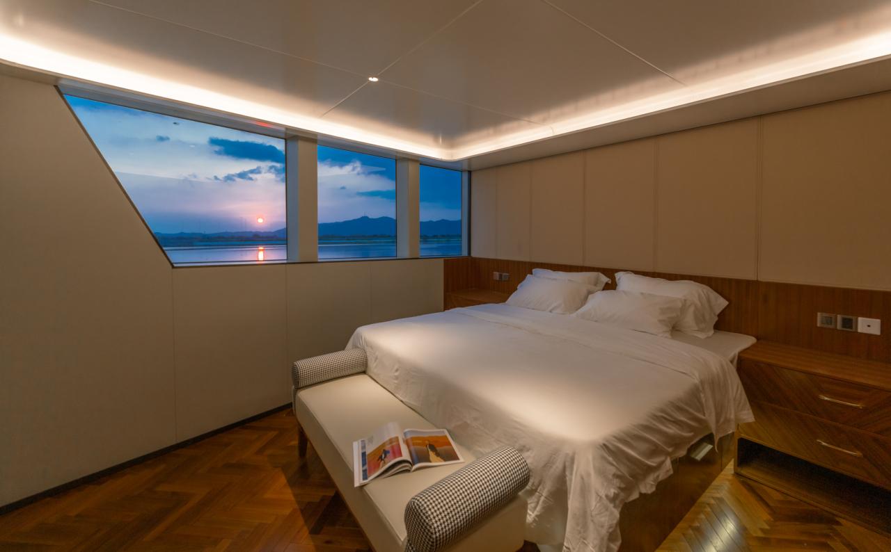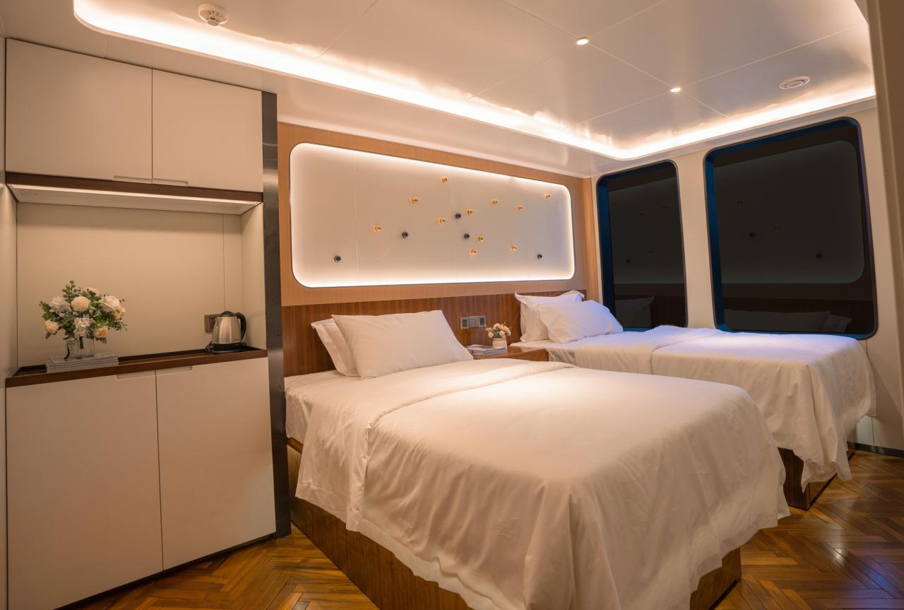 Suite - Located on the main deck, this cabin features a king/double-sized bed, ensuite bathroom with hot shower, high-definition television set with satellite television and Google cast, hassle-free keypad door lock system, and basic room amenities: 2-in-1 shampoo and bath gel, separate towel hangers for bath and face towels, clothes hooks, hair dryer, safety deposit box, USB ports for charging, inter-room communication system. Maximum Occupancy: 2 persons Bed Configuration: Double (King-sized) Ensuite: Yes Aircondition: Yes, with control in the room Master Cabin - Located on the main deck, each cabin features a king/double-sized bed, ensuite bathroom with hot shower, high-definition television set with satellite television and Google cast, hassle-free keypad door lock system, and basic room amenities: 2-in-1 shampoo and bath gel, separate towel hangers for bath and face towels, clothes hooks, hair dryer, safety deposit box, USB ports for charging, inter-room communication system. Maximum Occupancy: 2 persons Bed Configuration: Double (King-sized) Ensuite: Yes Aircondition: Yes, with control in the room Deluxe Double/Twin Cabin - Located on the upper deck, each cabin features a double/twin beds, ensuite bathroom with hot shower, high-definition television set with satellite television and Google cast, hassle-free keypad door lock system, and basic room amenities: 2-in-1 shampoo and bath gel, separate towel hangers for bath and face towels, clothes hooks, hair dryer, safety deposit box, USB ports for charging, inter-room communication system. Maximum Occupancy: 2 persons Bed Configuration: Double or Twin Ensuite: Yes Aircondition: Yes, with control in the room Deluxe Twin - Located on the upper deck, each cabin features a twin bed, ensuite bathroom with hot shower, high-definition television set with satellite television and Google cast, hassle-free keypad door lock system, and basic room amenities: 2-in-1 shampoo and bath gel, separate towel hangers for bath and face towels, clothes hooks, hair dryer, safety deposit box, USB ports for charging, inter-room communication system. Maximum Occupancy: 2 persons Bed Configuration: Twin (2 Single) Ensuite: Yes Aircondition: Yes, with control in the room