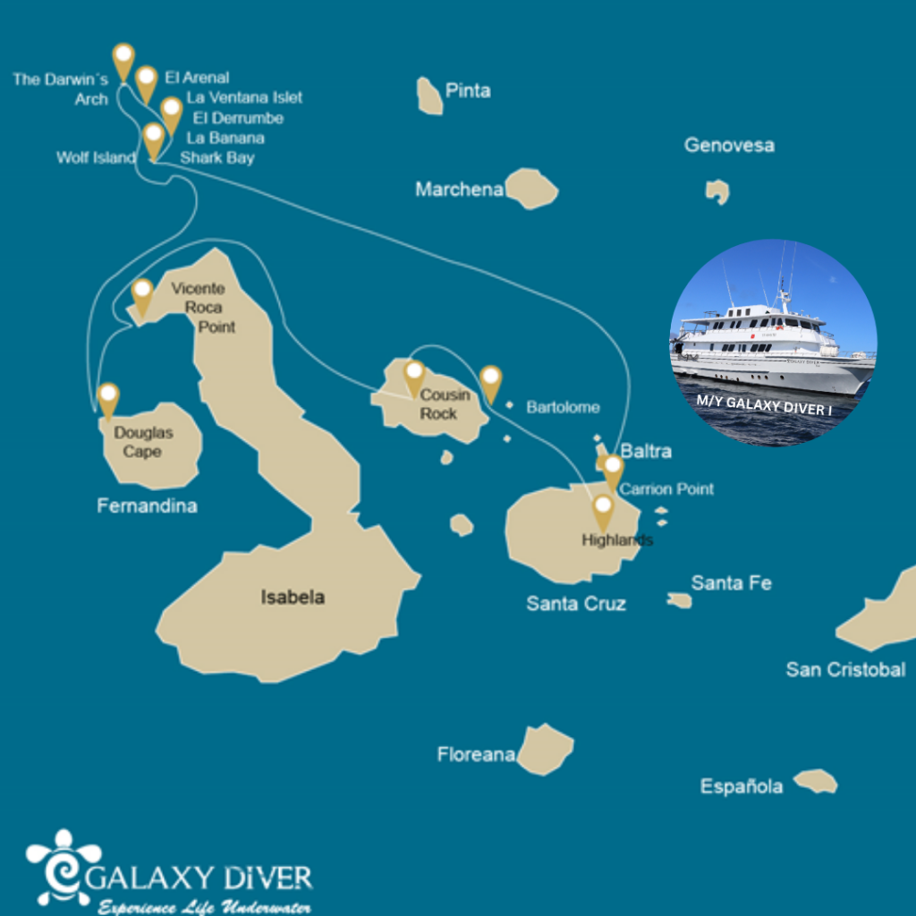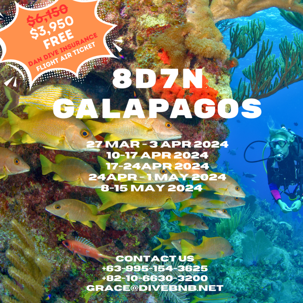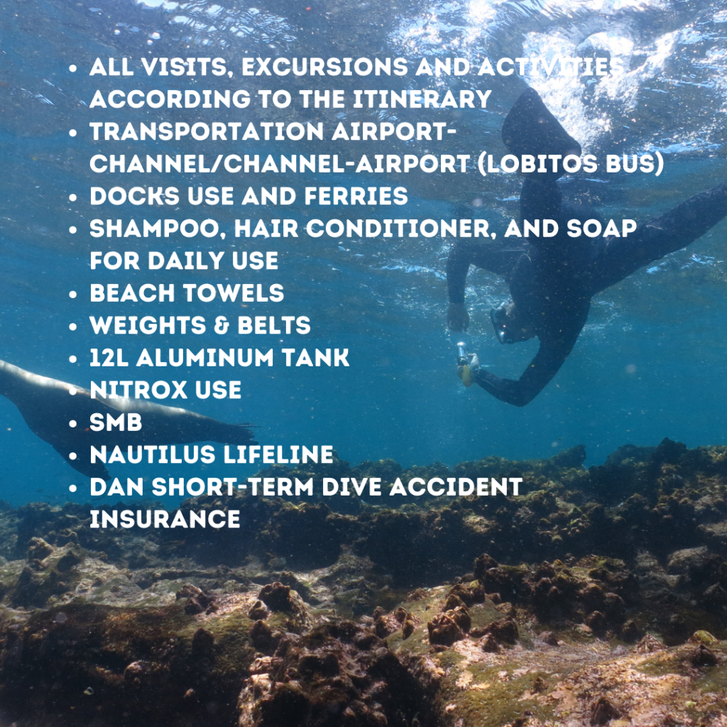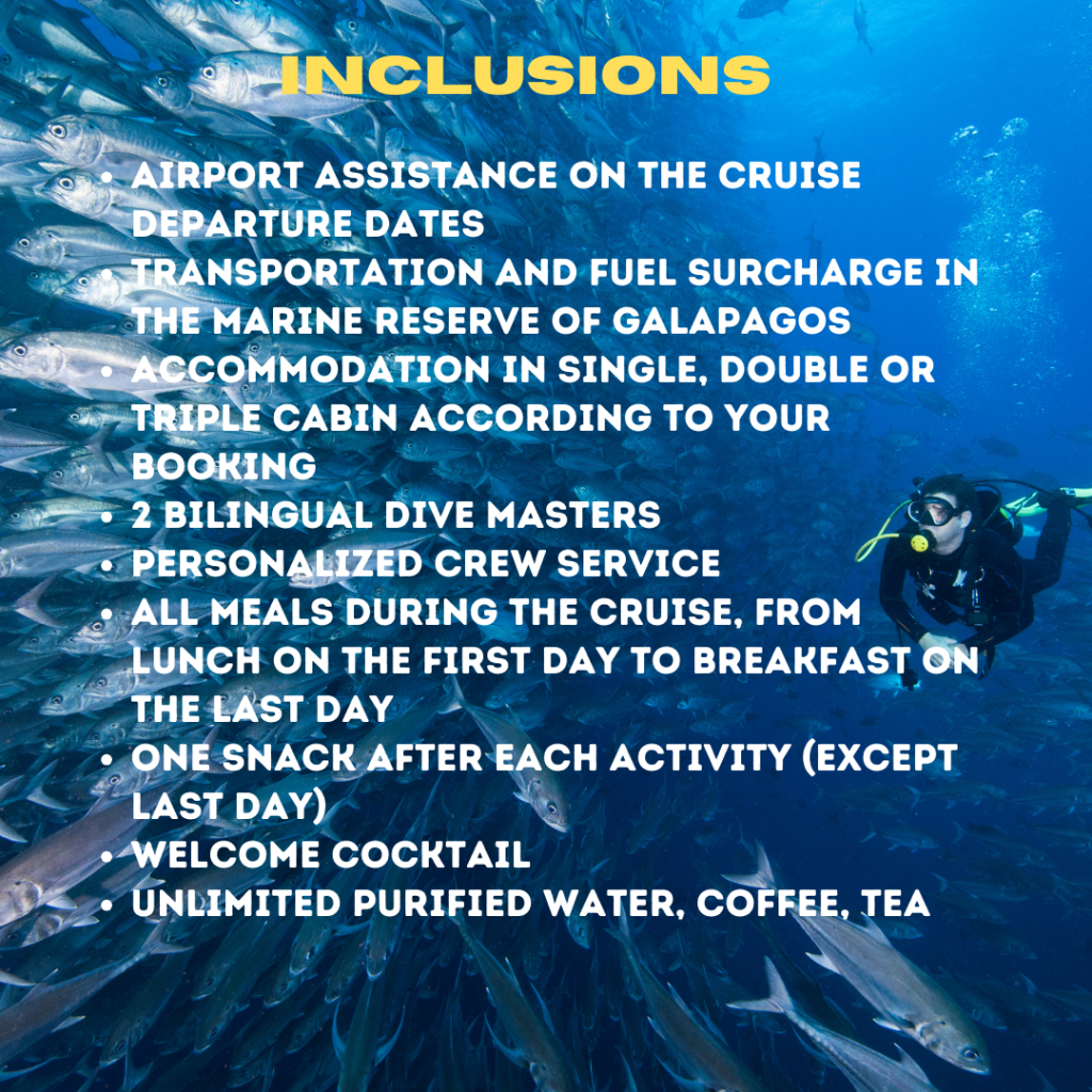 10-17 Apr 202417-24Apr 202424Apr - 1 May 2024Package Inclusions:Domestic Air TicketsAirport assistance on the cruise departure datesTransportation and fuel surcharge in the Marine reserve of GalapagosAccommodation in single, double or triple cabin according to your booking2 Bilingual Dive MastersPersonalized crew serviceAll meals during the cruise, from lunch on the first day to breakfast on the last dayOne snack after each activity (except last day)Welcome cocktail Unlimited purified water, coffee, teaAll visits, excursions and activities according to the itineraryTransportation Airport-Channel/Channel-Airport (Lobitos Bus)Docks use and ferriesShampoo, hair conditioner, and soap for daily useBeach towels Weights & Belts12L aluminum tankNitrox useSMBNautilus LifelineDAN Short-Term Dive Accident InsuranceNot Included: International flights to/from EcuadorGalapagos National Park entrance fee ($100 per person)Transit Control Card ($20 per person)Alcoholic drinksTips and gratuitiesPersonal expensesTravel insurance (highly recommended)Dive equipment (wetsuit, BCD, regulator, fins and booties)Insurance for equipmentOptionals (hood, gloves, reef hooks)Nitrox course