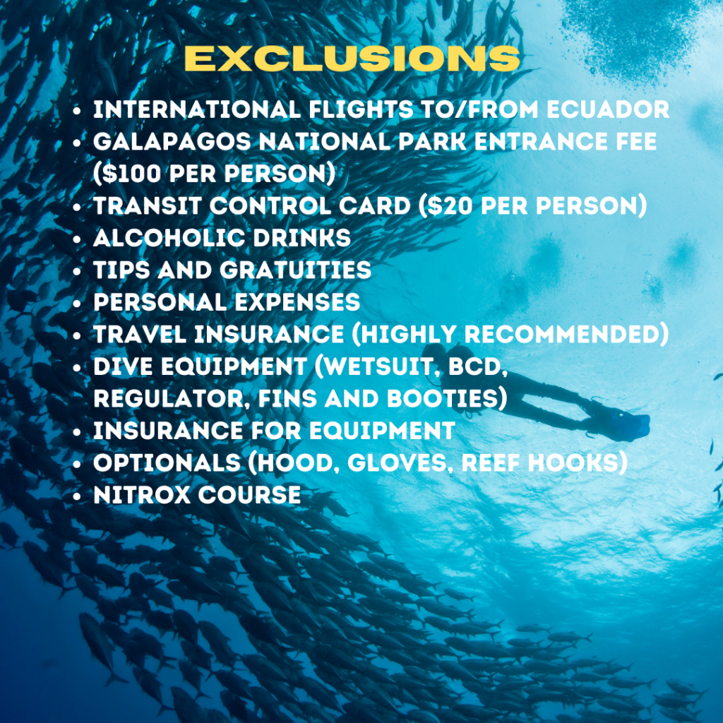 Local flight to/from Galapagos Galapagos National Park Entrance fee Galapagos Transit card Alcoholic drinks Tips Local Taxes Travel, health and dive Insurance (refer to your trip type) Service not specified Additional for Diving Departures exclusions: Consider to bring your own dive kit or rent it through your travel advisor (Wrist computer, BCD, regulator, mask, snorkel and fins)