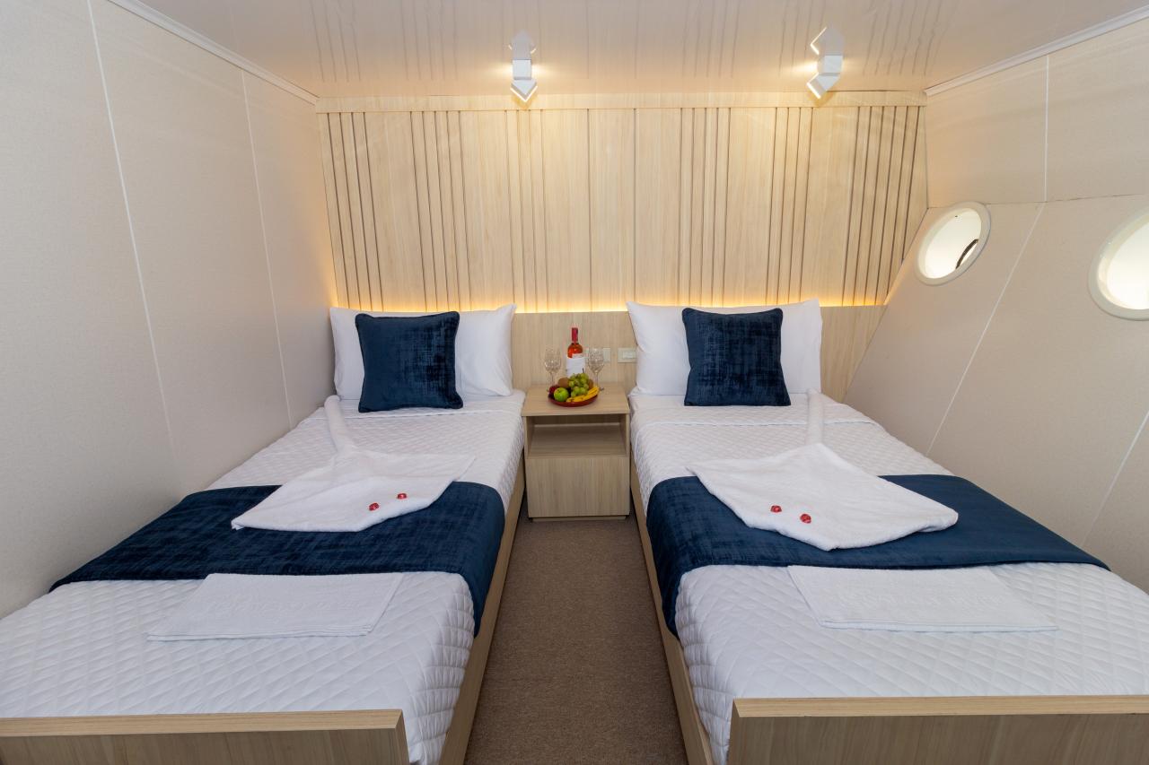Main Deck Cabin - It has a private bathroom, hot and cold water, air conditioning, a hair dryer, an electric towel dryer, an internal phone, a safe box, a closet, and a speaker. Maximum Occupancy: 2 persons Bed Configuration: Double or Twin Ensuite: Yes Aircondition: Yes, with control in the room Upper Deck Cabin - Double twin cabins with a pulldown bed can be converted to triple cabins. These cabins include a private bathroom, hot/cold water, air conditioning, a hair dryer, an electric towel dryer, an internal phone, a safe box, a closet, and a speaker. Maximum Occupancy: 2 persons Bed Configuration: Double Ensuite: Yes Aircondition: Yes, with control in the room Lower Deck Cabin - Each cabin has a private bathroom, hot and cold water, air conditioning, a hair dryer, an electric towel dryer, an internal phone, a safe box, a closet, and a speaker. Maximum Occupancy: 2 persons Bed Configuration: Double or Twin Ensuite: Yes Aircondition: Yes, with control in the room