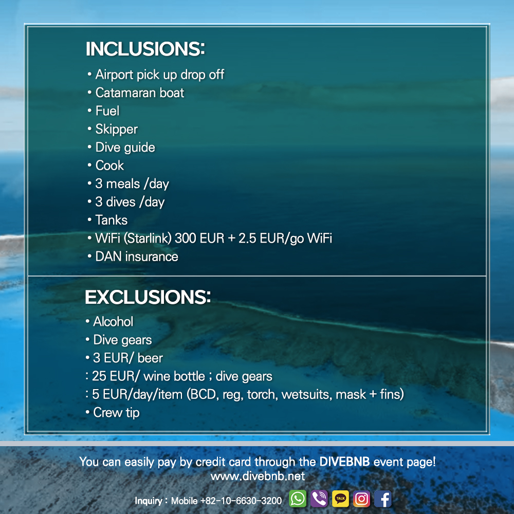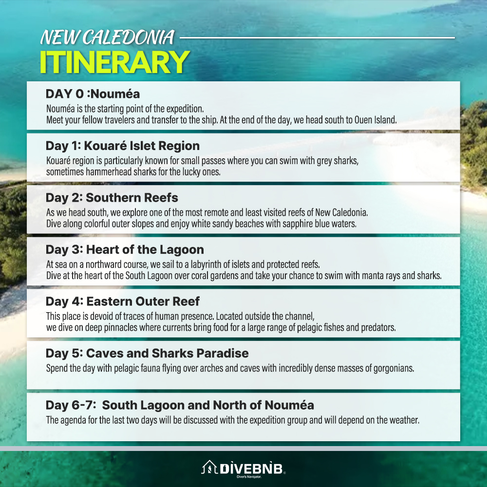 7 Day Voyage - UNESCO Heritage Site, Untouched Islets Pristine Reefs w/ MegafaunaITINERARYDAY 0:NouméaNouméa is the starting point of the expedition.Meet your fellow travelers and transfer to the ship. At the end of the day, we head south to Ouen Island.Day 1: Kouaré Islet RegionKouaré region is particularly known for small passes where you can swim with grey sharks, sometimes hammerhead sharks for the lucky ones.Day 2: Southern ReefsAs we head south, we explore one of the most remote and least visited reefs of New Caledonia. Dive along colorful outer slopes and enjoy white sandy beaches with sapphire blue waters.Day 3: Heart of the LagoonAt sea on a northward course, we sail to a labyrinth of islets and protected reefs.Dive at the heart of the South Lagoon over coral gardens and take your chance to swim with manta rays and sharks.Day 4: Eastern Outer ReefThis place is devoid of traces of human presence. Located outside the channel,we dive on deep pinnacles where currents bring food for a large range of pelagic fishes and predators.Day 5: Caves and Sharks ParadiseSpend the day with pelagic fauna flying over arches and caves with incredibly dense masses of gorgonians.Day 6-7: South Lagoon and North of NouméaThe agenda for the last two days will be discussed with the expedition group and will depend on the weather.