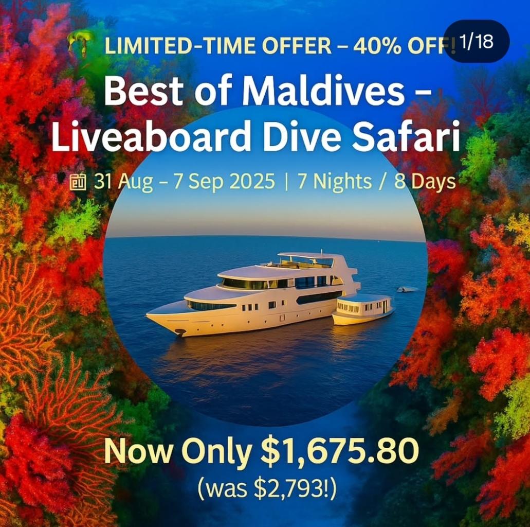 LIMITED-TIME OFFER – 40% OFF!Best of Maldives – Liveaboard Dive Safari 31 Aug – 7 Sep 2025 | 7 Nights / 8 DaysLiveaboard: AdoraNow Only $1,675.80 (was $2,793!)Dive into the heart of the Maldives with this all-inclusive package!Experience vibrant reefs, thrilling marine life, and world-class hospitality aboard the luxurious Adora. What’s Included:• Roundtrip Airport Transfers (arrival & departure days only)• A/C Cabins with Ensuite Bathrooms & Room Service• All Meals: Breakfast, Lunch, Dinner + Snacks (Buffet Style)• Unlimited Water, Tea & Coffee• ~18 Dives with Pro Local Dive Guides (Night dive weather-dependent)• Dive Equipment: 12L DIN/INT, SMB, Reef Hooks, Weights & Belts• Free Nitrox for Certified Divers• Traditional Fishing Gear Use• Island Excursion + BBQ Dinner (Weather Permitting)• Hulhumale Sightseeing (Time & Weather Permitting)• Onboard WIFI (Speeds May Vary)All Prices in USDInclusive of 10% Service Charge & 16% T-GSTT-GST increases to 17% from July 2025Mandatory Green Tax: $12/night (Payable on board)Book Now at www.divebnb.netWhatsApp: +63-995-154-3625Spaces are limited – don’t miss out on this unforgettable Maldives adventure!#Maldives #MaldivesDiving #LiveaboardLife #ScubaDiving #DiveTrip #DivingVacation #UnderwaterAdventure #TropicalEscape #divebnb #liveaboarddiving #divedestinationsandexcursions