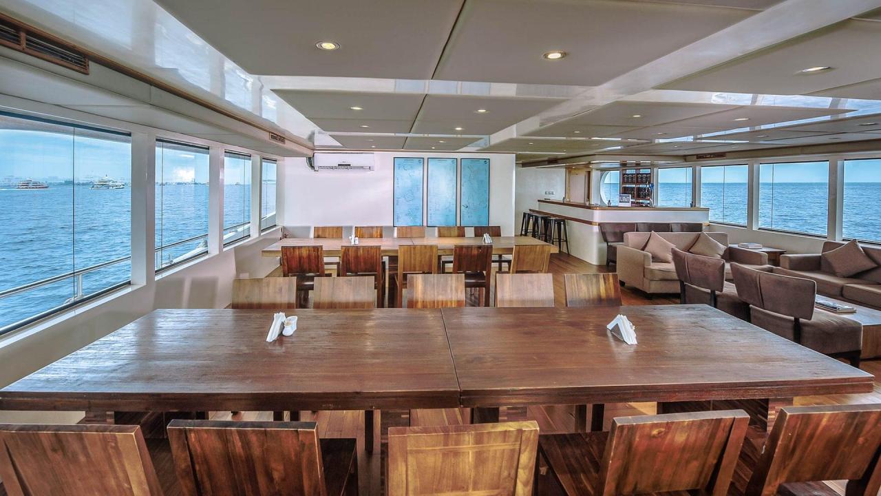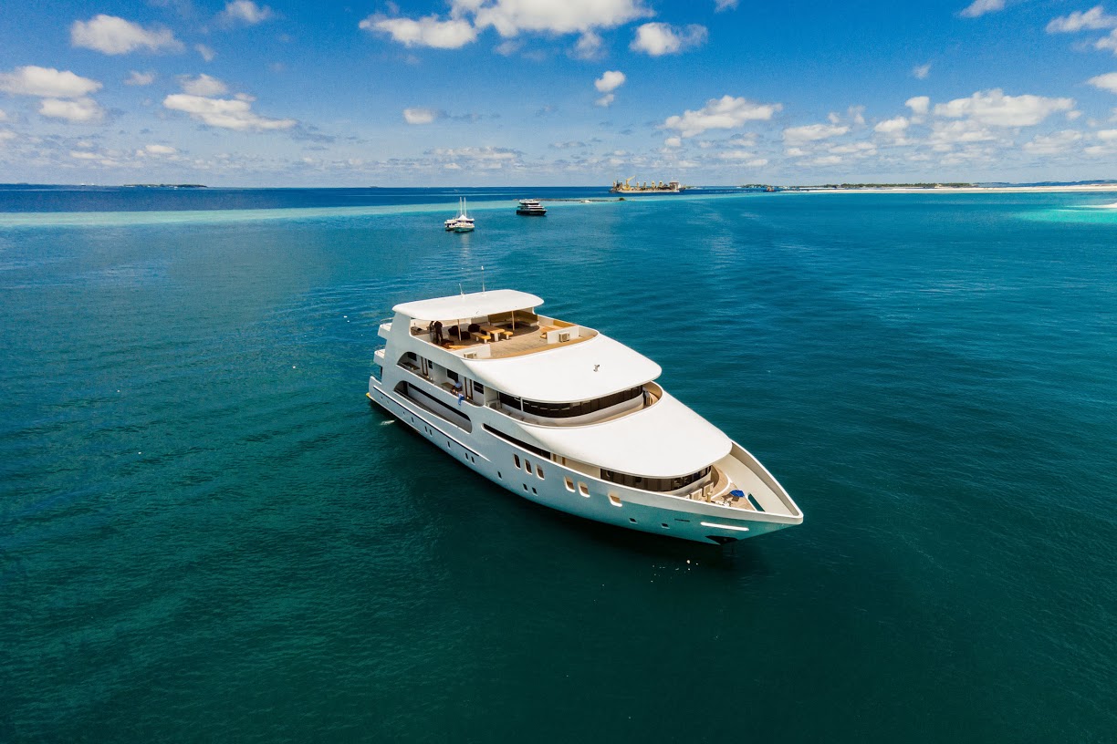All taxes including GST and Green tax Airport “meet-and-greet”, transfers to and from the airport before noon on arrival and departure days only Accommodation in air-conditioned cabins with outside window, en-suite bathroom (hot water), towels and room service Full board meals: breakfast, lunch and dinner served as a buffet Water, tea & coffee available 24h 17 dives per week (1 night dive); note: dive restriction applies for flying time Diving equipment: 12 lit Aluminum DIN/INT, lead belts, escorting diving boat, instructor and experienced, local dive guide (Padi) Free Nitrox (only for certified divers) Other additions include Excursions and city visit to Malé capital or Hulhumalé Use of fishing gear— local-style including hook, fishing line, weight and baits 1 island visit + 1 beach dinner depending on availability and weather conditions