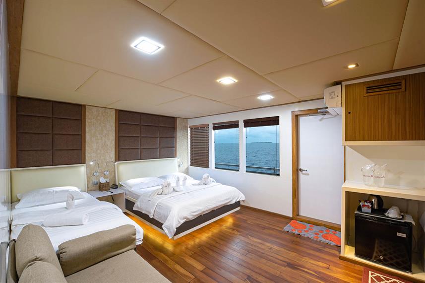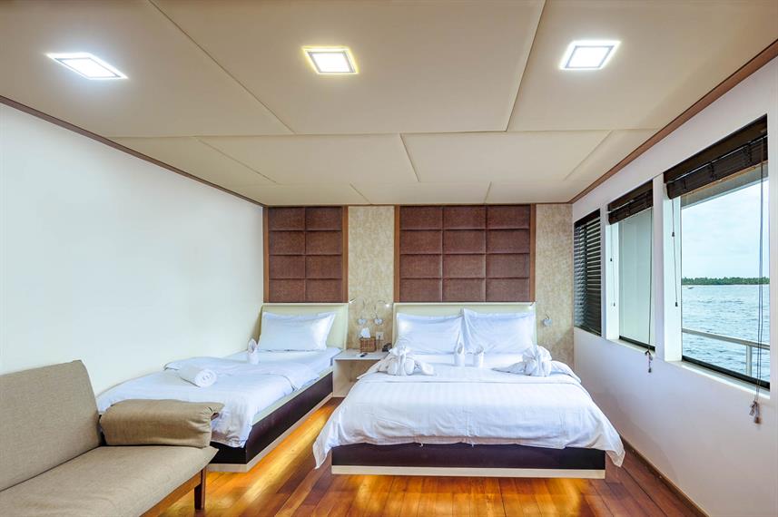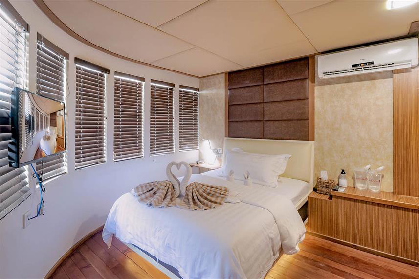 Standard Rooms (Lower Deck) - 6 Standard Rooms each room has 1 double size bed and 1 twin bed. All cabins is fully air-conditioned, with private bathrooms hot and cold showers and hand basins. (small ones in lower deck cabins) Bedding & towels provided Cabinet, shelves & mirror Reading lights TVs with movie and music channels Minibar Space for luggage Room service 24-hour, 220v electricity supply 3-pin square pin plug types - adaptors are available Life jackets. Size: 9 m² Beds: 1 Double Size Bed & 1 Twin Bed Max Occupancy: 2 Shareable: Yes Private bathroom: Yes Air Conditioning: Yes Superior Room (Middle Deck) - 1 Superior Room room has 1 double size bed, fully air-conditioned, a private bathroom with a hot and cold shower, hand basin. Bedding & towels provided Cabinet, shelves & mirror Reading lights TVs with movie and music channels Minibar Space for luggage Room service 24-hour, 220v electricity supply 3-pin square pin plug types - adaptors are available Life jackets. Size: 9 m² Beds: 1 Double Size Bed Max Occupancy: 1 Shareable: No Private bathroom: Yes Air Conditioning: Yes Ocean View (Upper Deck) - 4 Deluxe Room this Ocean View Suites room has its own balcony, with 1 double size bed and 1 twin bed, fully air-conditioned, with private bathrooms, hot and cold showers, hand basins. Bedding & towels provided Cabinet, shelves & mirror Reading lights TVs with movie and music channels Minibar Space for luggage Room service 24-hour, 220v electricity supply 3-pin square pin plug types - adaptors are available Life jackets. Size: 9 m² Beds: 1 Double Size Bed & 1 Twin Bed Max Occupancy: 2 Shareable: Yes Private bathroom: Yes Air Conditioning: Yes