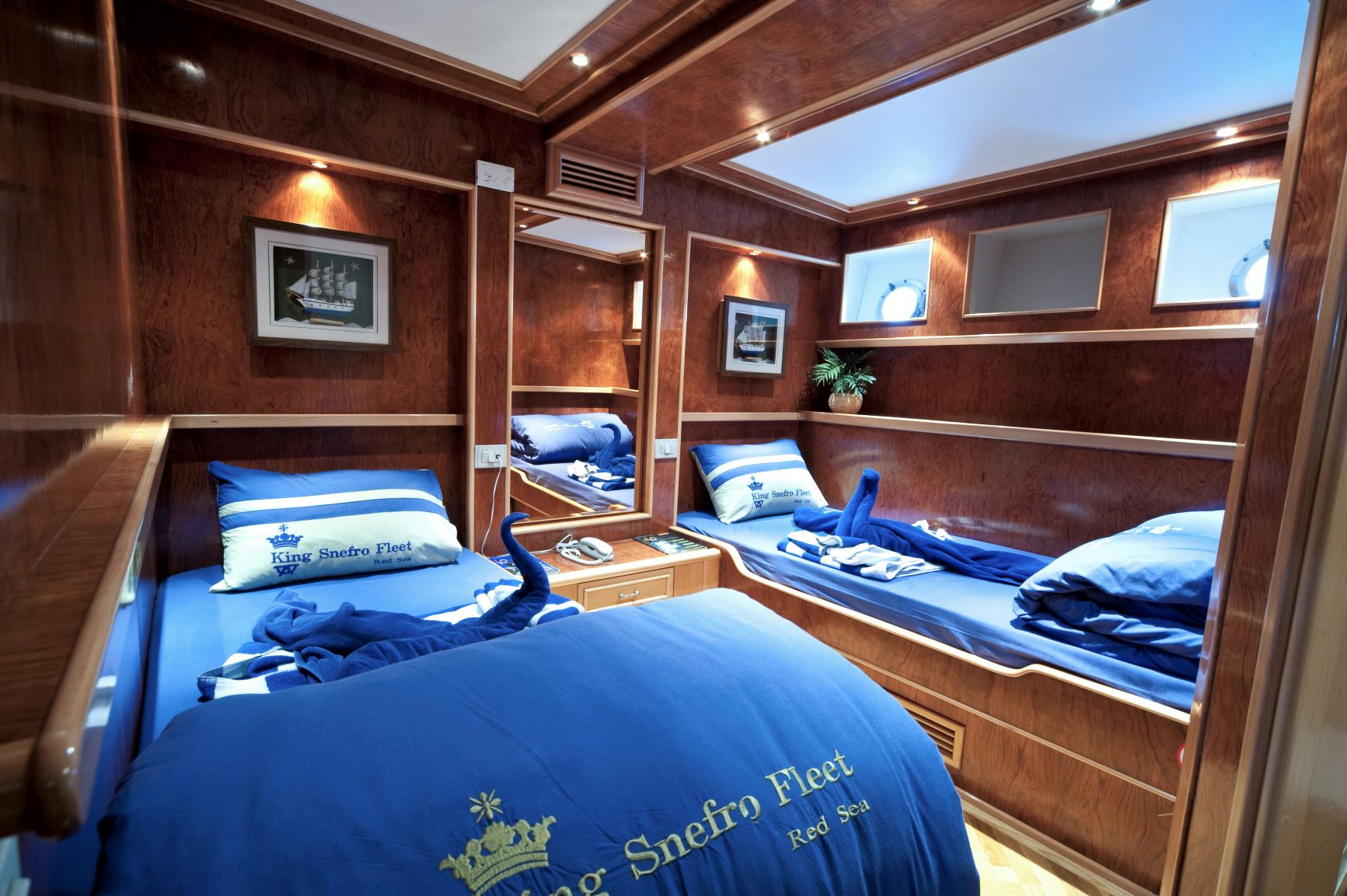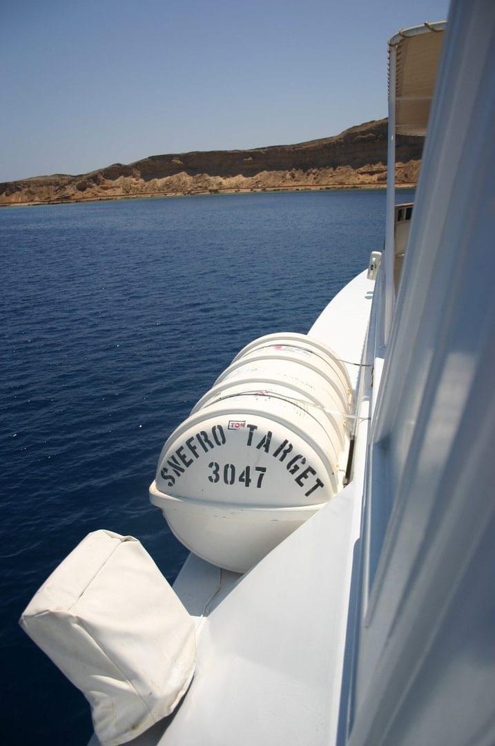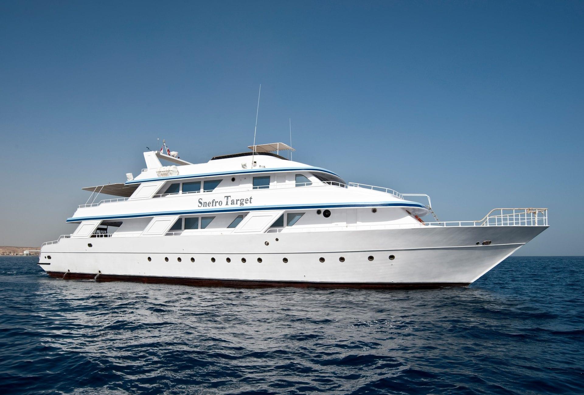 Snefro Target, at 37 meters in length, is one of the luxury class boats in the fleet, but she is the only one with Area 1 and Area 2 licenses, allowing her to go throughout the Red Sea. To comfortably accommodate 20 guests, she has 7 twin berth cabins on the lower deck, 2 double bed cabins on the upper deck, and a master suite on the main deck, just like her sister vessel Snefro Love.All cabins are air-conditioned, with en-suite bathrooms, personal safety deposit boxes, a central music system, and an internal telephone system. In addition, all double-bed cabins are equipped with a minibar. The dining and leisure areas are very spacious, air-conditioned, and loaded with modern entertainment equipment and a central music system. The spacious salon on the main deck invites you to relax or you can choose the lounge on the upper deck. Daily meals are served in buffet style offering Egyptian and international cuisine, but they cater to special dietary requests. Snacks, fruit, water, coffee, tea, and soft drinks are offered throughout the day. To make your relaxation time enjoyable, there are 3 impressive sun decks on the upper and high deck, divided into shaded and sunny areas.The spacious dive deck is outfitted with fresh-water showers and two facilities, as well as plenty of space for kitting up. Two air compressors and the Nitrox compressor are positioned below the deck and are completely silent when in use. Nitrox is free for divers who have Nitrox certification. Regular air quality checks are performed by EN12021:1998 norms.The boat is outfitted with life jackets, life rafts (2 x 25 person), fire extinguishers, smoke detectors, and a fire alarm system, as well as a first-aid package and oxygen (demand and free flow). GPS, chart plotter, radar, echo sounder, EPRIB, HF Radio (long distance), and VHF radio are all navigation and safety equipment that fulfill international requirements.Snefro Target is ISO-certified for Recreational Diving Service Providers (EUF: S 000061 until 30.06.2021), a member of the Chamber of Diving and Watersports (CDWS: SSSB 0043 S), and departs from Sharm El Sheikh (New Marina, El Wataneya) on all Mini Safaris, Sinai Classic, Sinai Wreck & Reef, Deep North Marine Park, and Sharm-Brothers routes. Southern routes departing from Hurghada or Port Ghalib might be requested.Because Snefro Target is the identical sister vessel to Snefro Love, both boats can be interchanged on certain itineraries.