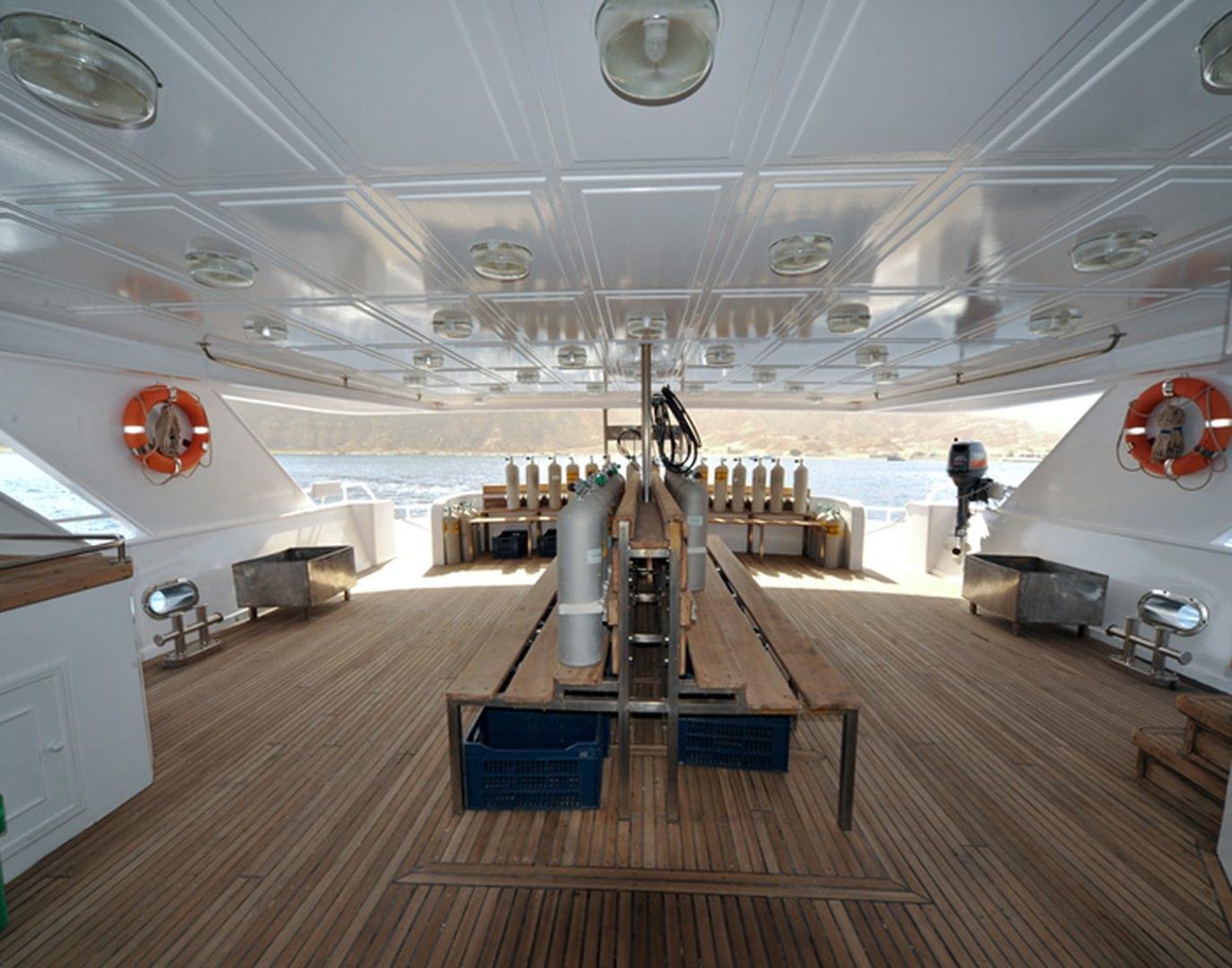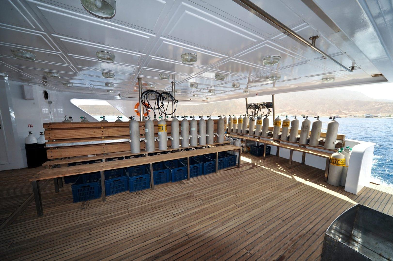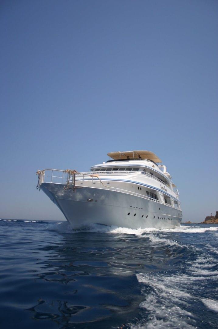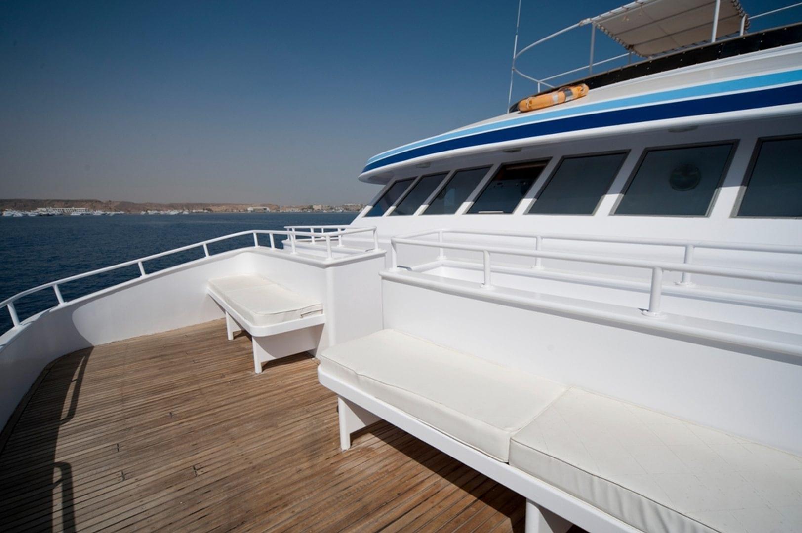 Snefro Target, at 37 meters in length, is one of the luxury class boats in the fleet, but she is the only one with Area 1 and Area 2 licenses, allowing her to go throughout the Red Sea. To comfortably accommodate 20 guests, she has 7 twin berth cabins on the lower deck, 2 double bed cabins on the upper deck, and a master suite on the main deck, just like her sister vessel Snefro Love.All cabins are air-conditioned, with en-suite bathrooms, personal safety deposit boxes, a central music system, and an internal telephone system. In addition, all double-bed cabins are equipped with a minibar. The dining and leisure areas are very spacious, air-conditioned, and loaded with modern entertainment equipment and a central music system. The spacious salon on the main deck invites you to relax or you can choose the lounge on the upper deck. Daily meals are served in buffet style offering Egyptian and international cuisine, but they cater to special dietary requests. Snacks, fruit, water, coffee, tea, and soft drinks are offered throughout the day. To make your relaxation time enjoyable, there are 3 impressive sun decks on the upper and high deck, divided into shaded and sunny areas.The spacious dive deck is outfitted with fresh-water showers and two facilities, as well as plenty of space for kitting up. Two air compressors and the Nitrox compressor are positioned below the deck and are completely silent when in use. Nitrox is free for divers who have Nitrox certification. Regular air quality checks are performed by EN12021:1998 norms.The boat is outfitted with life jackets, life rafts (2 x 25 person), fire extinguishers, smoke detectors, and a fire alarm system, as well as a first-aid package and oxygen (demand and free flow). GPS, chart plotter, radar, echo sounder, EPRIB, HF Radio (long distance), and VHF radio are all navigation and safety equipment that fulfill international requirements.Snefro Target is ISO-certified for Recreational Diving Service Providers (EUF: S 000061 until 30.06.2021), a member of the Chamber of Diving and Watersports (CDWS: SSSB 0043 S), and departs from Sharm El Sheikh (New Marina, El Wataneya) on all Mini Safaris, Sinai Classic, Sinai Wreck & Reef, Deep North Marine Park, and Sharm-Brothers routes. Southern routes departing from Hurghada or Port Ghalib might be requested.Because Snefro Target is the identical sister vessel to Snefro Love, both boats can be interchanged on certain itineraries.