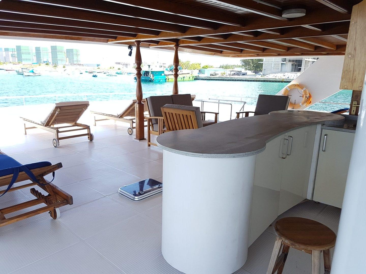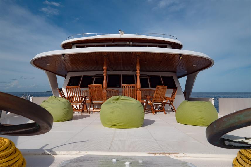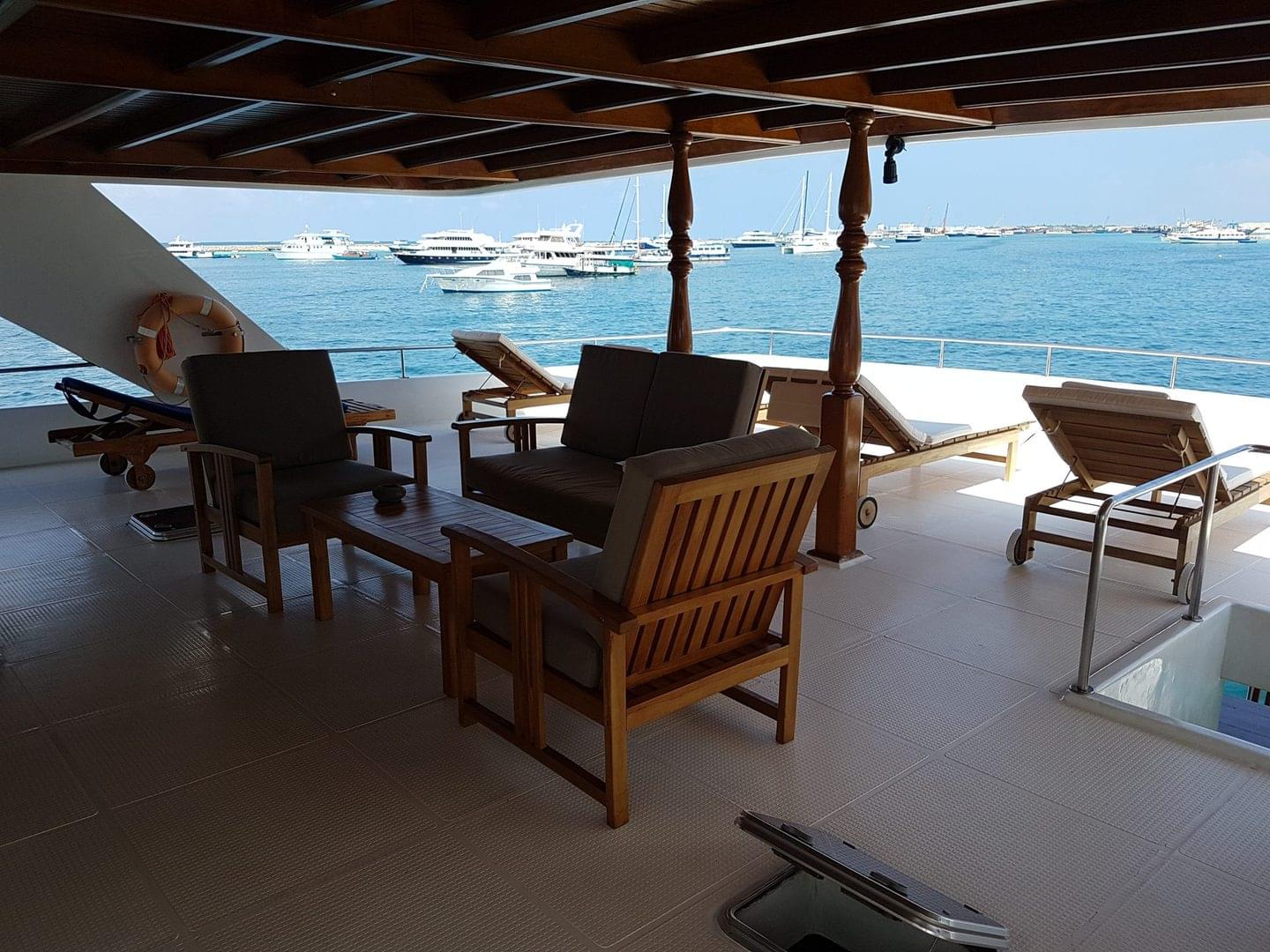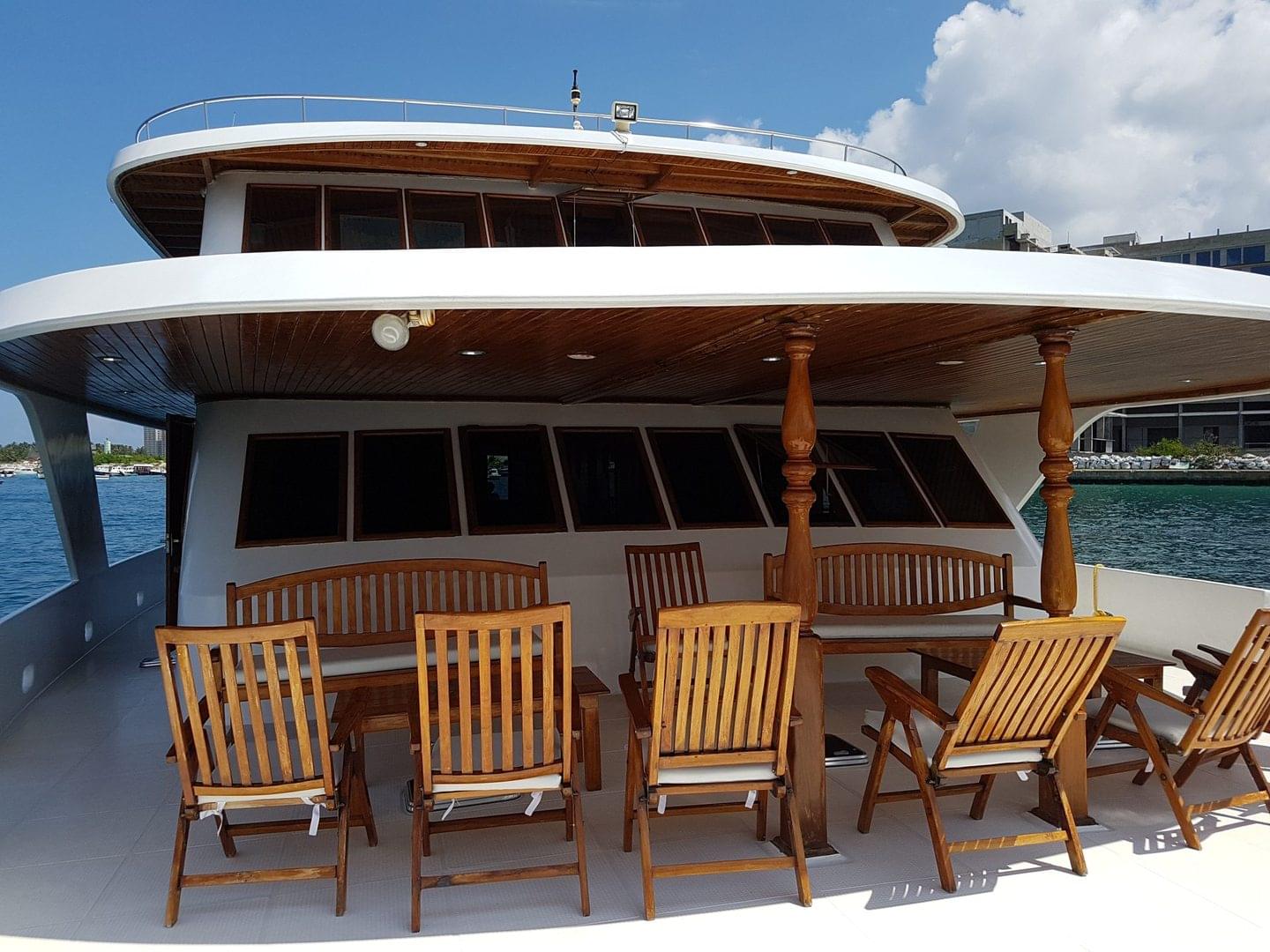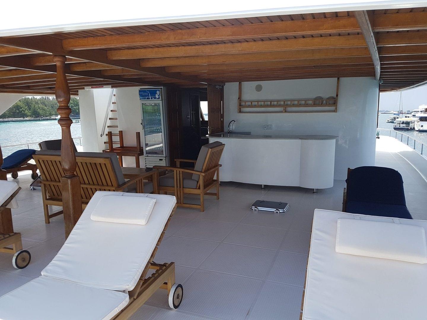 Year built:2002 Length:30m Beam:10m Top speed:10 knots Cruising speed:9 knots Max guests:18 Number of cabins:10 Number of bathrooms:10 Tenders:1 dhoni diving, 1 skiff Water capacity:6000 liters Fuel capacity:10 tons Freshwater maker:6 tons per day AirCon in each room Bar Outdoor Dining 3 decks Beer tapping system Charging station and special photographer storage space