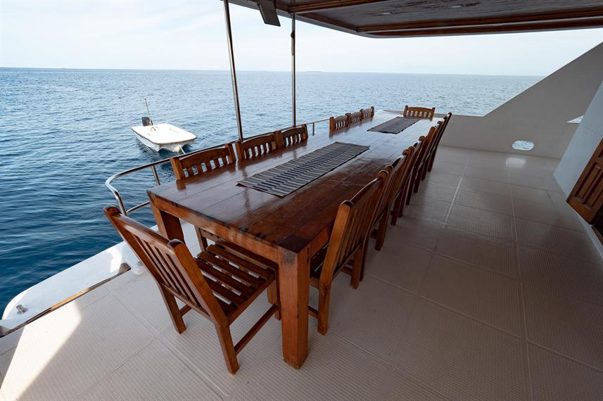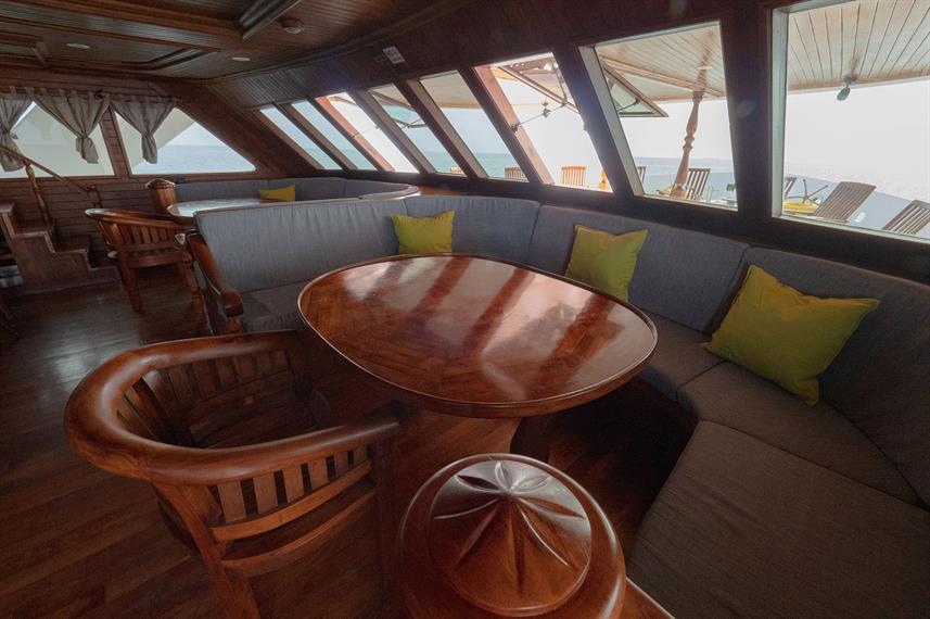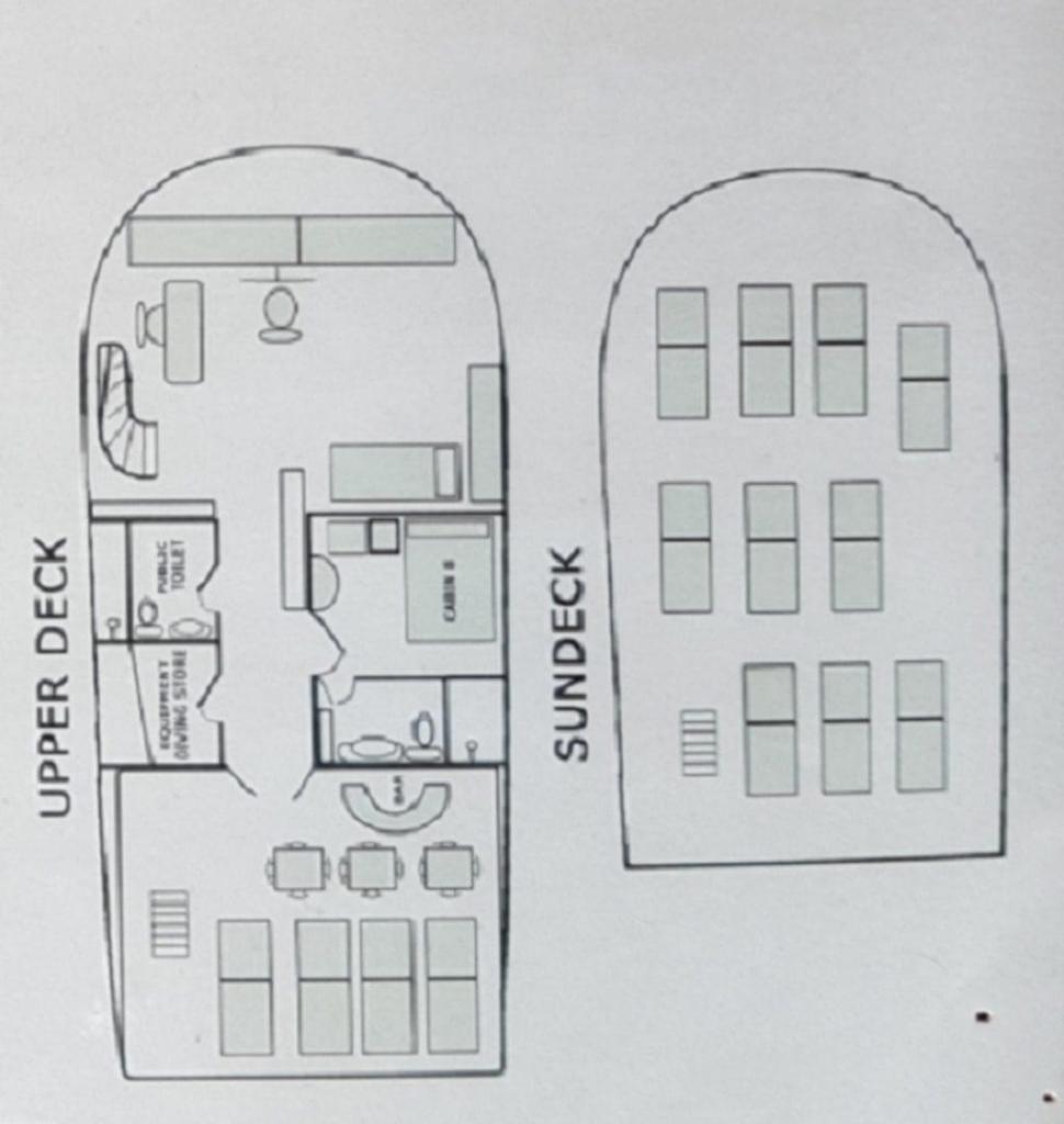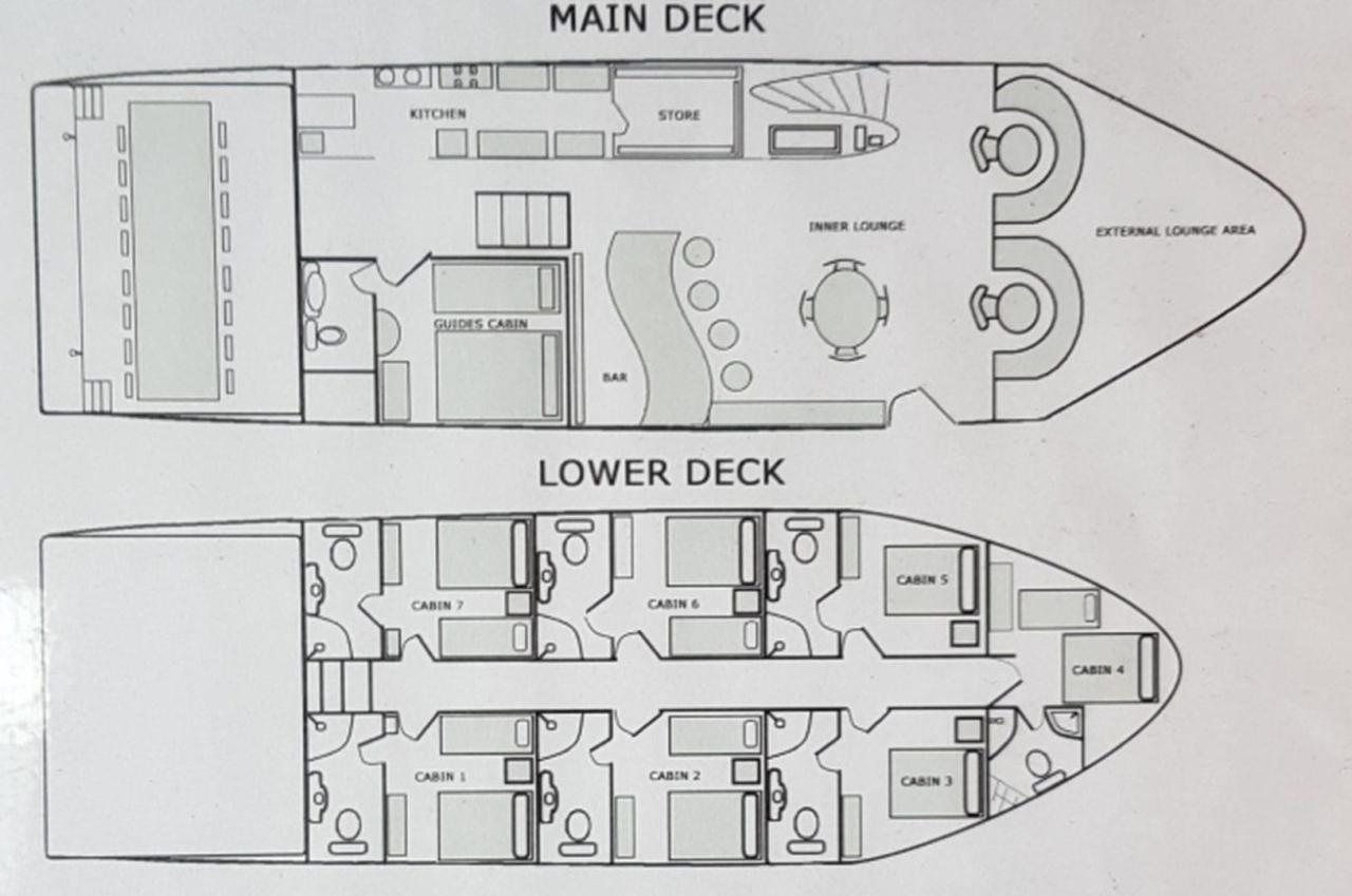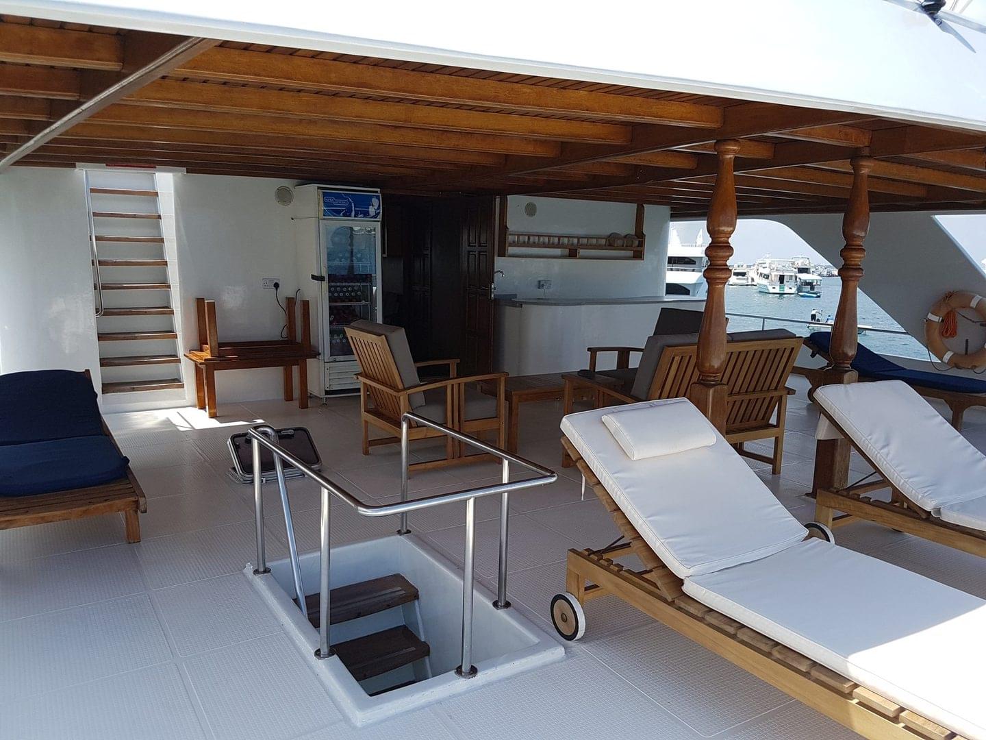 Year built:2002 Length:30m Beam:10m Top speed:10 knots Cruising speed:9 knots Max guests:18 Number of cabins:10 Number of bathrooms:10 Tenders:1 dhoni diving, 1 skiff Water capacity:6000 liters Fuel capacity:10 tons Freshwater maker:6 tons per day AirCon in each room Bar Outdoor Dining 3 decks Beer tapping system Charging station and special photographer storage space