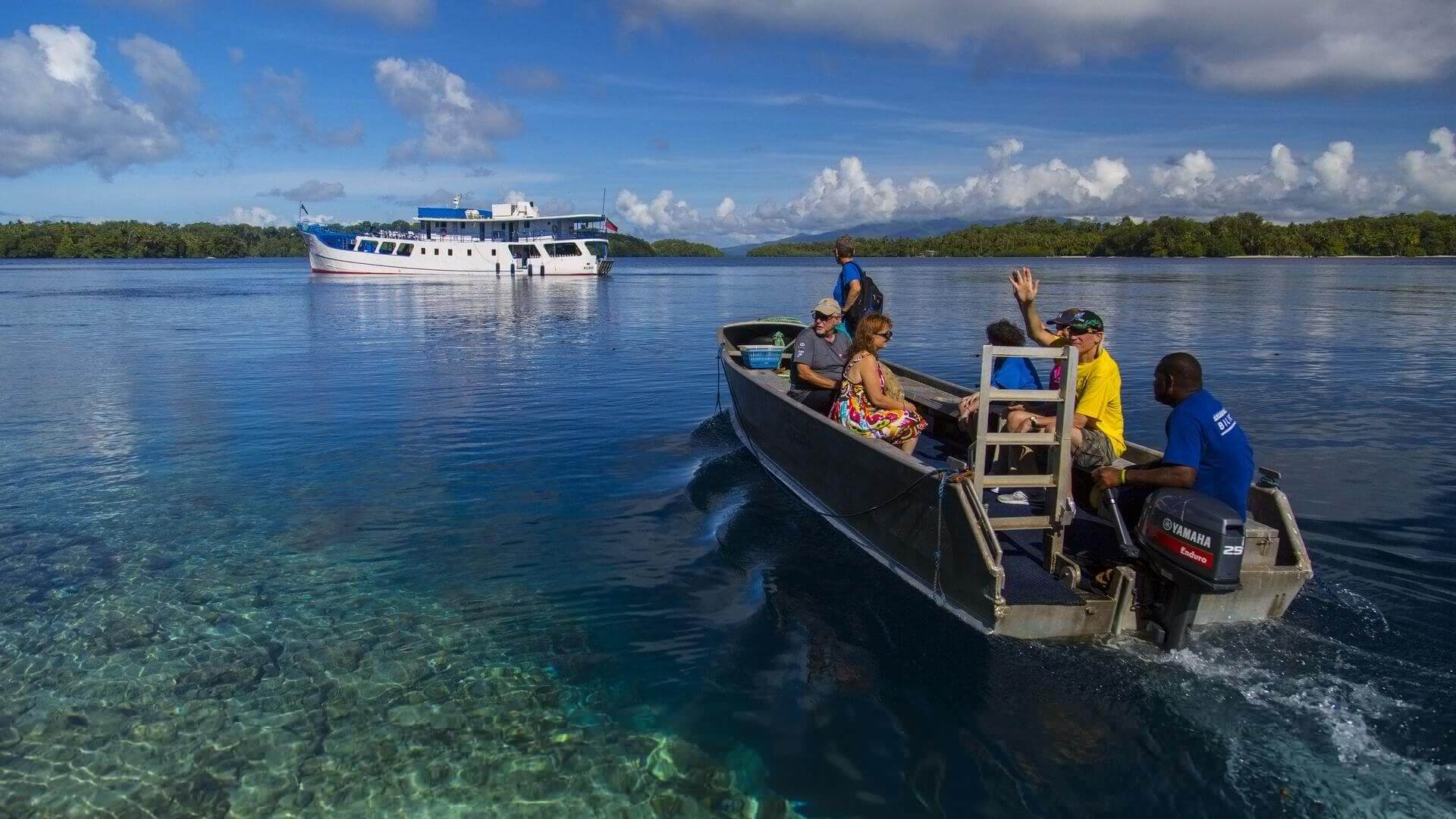 Boat Specifications: Construction Steel Length 125 ft Beam 24 ft Voltages 415 V three-phase 240 V single-phase (Australian style) 110 V charging outlets (US style) Tonnage 280 Full Safety Equipment Main Engine 350 HP 3406 Turbo Charged Caterpillar Diesel Generators 2 × 130kW Cabins 10 staterooms all with en-suite (8 cabins with double bed & single bunk) Special Features Large Screen Ultra HD TV Nitrox System Desalinator Fully Air Conditioned Cabins Large camera tables Separate rinse bins for photo gear Separate photo room Inclusions: Transfers in Honiara Unlimited diving En-suite bathrooms Meals and snacks Easy dive tender service Air conditioned accommodation Drinking water, teas and coffee Weights and belt 2 cabins with twin beds 4 dives a day plus a night dive Tanks and air fills