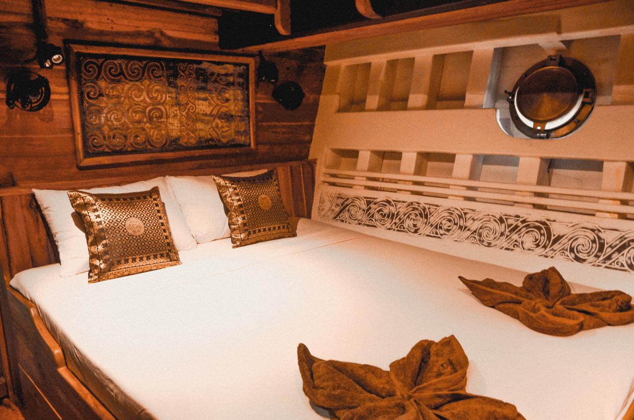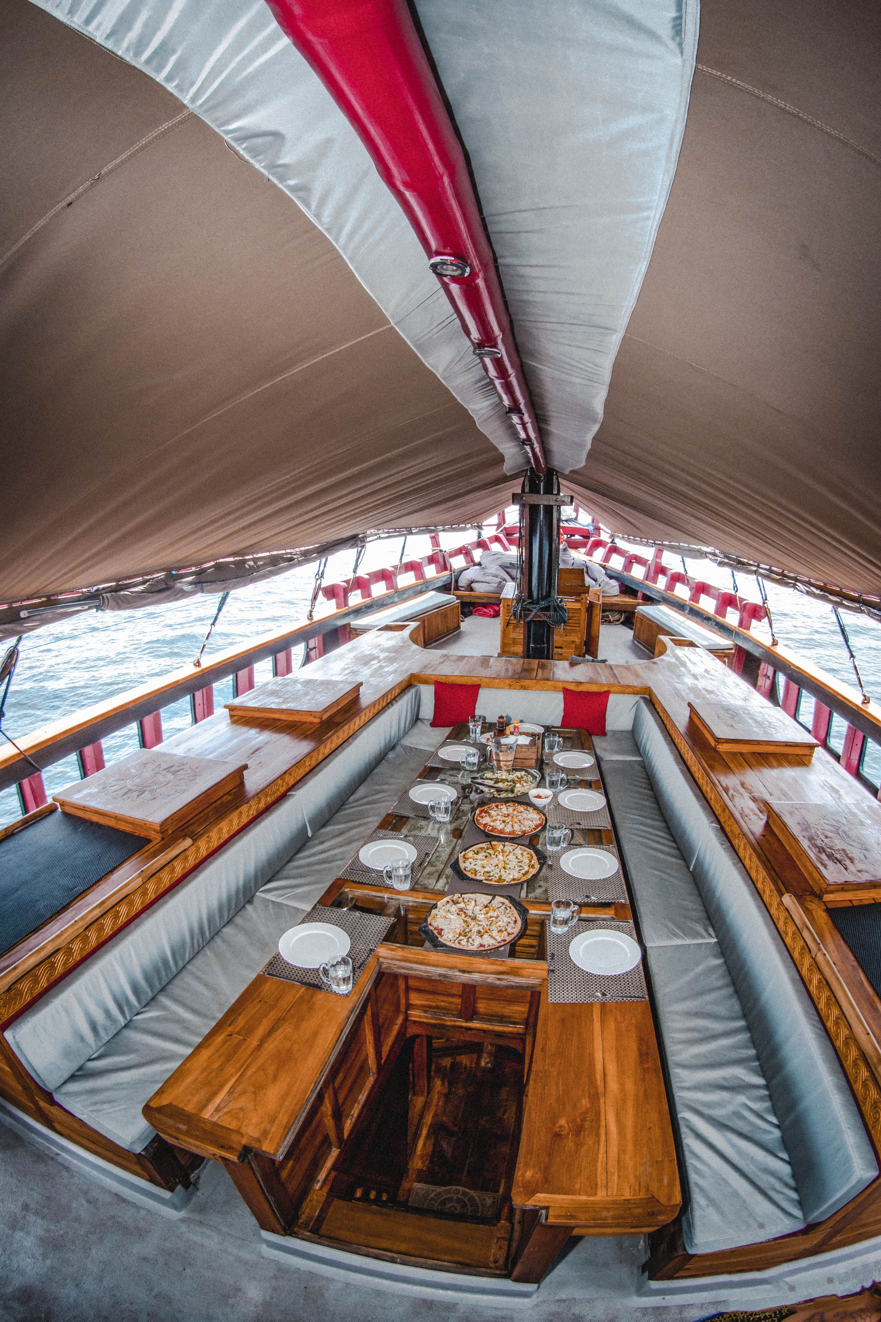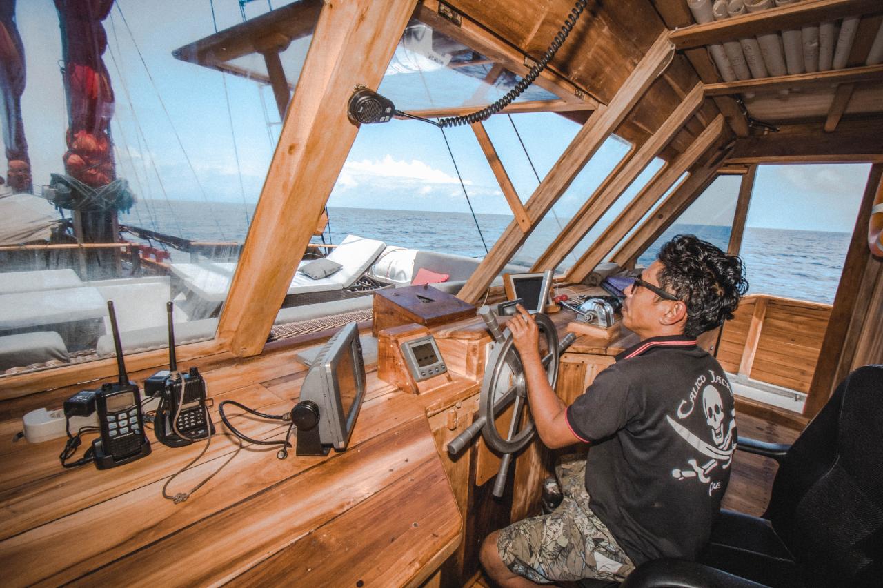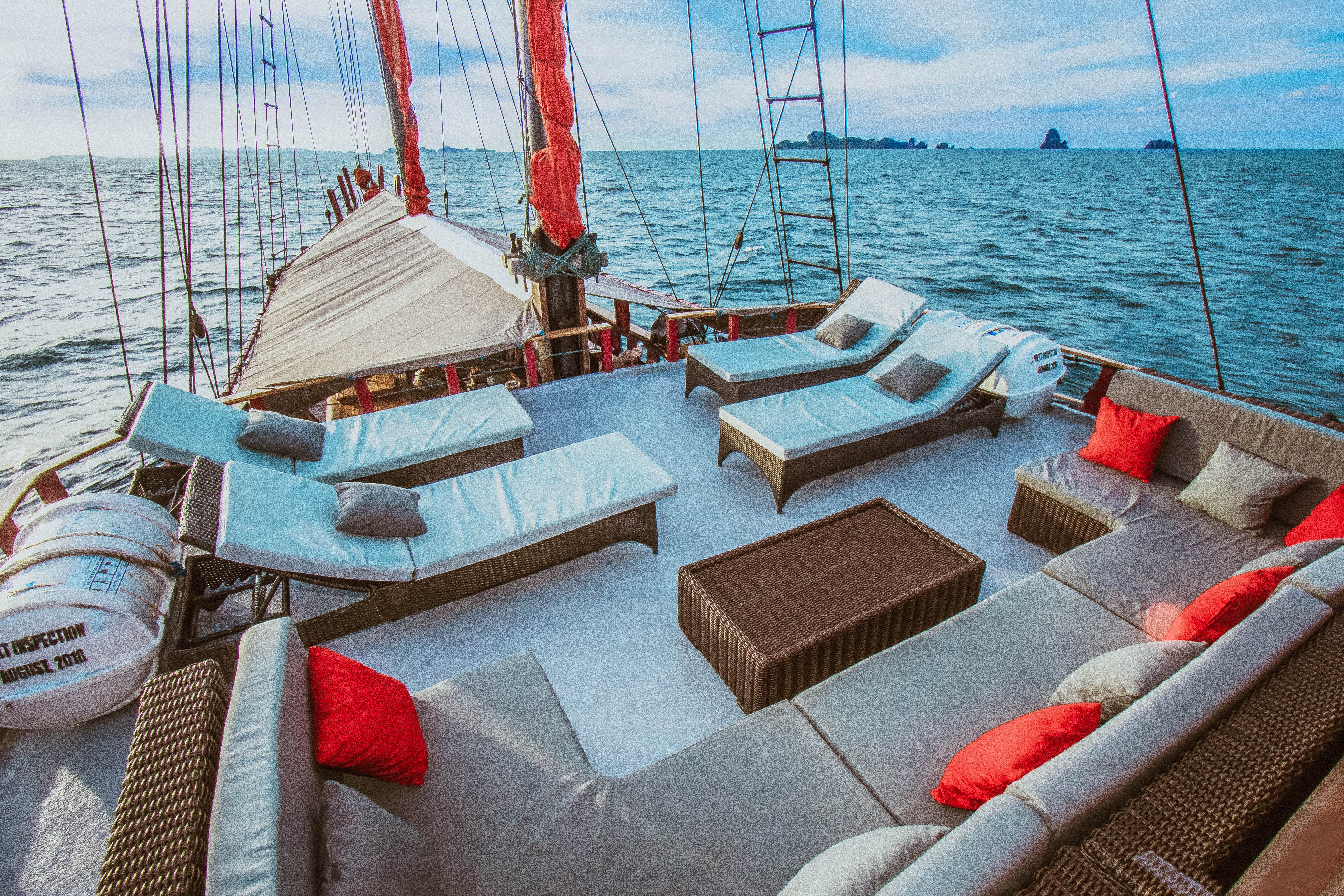 Specification: Cruise Speed: 7 to 8 knots Top Speed 12 knots Engine: 2 x 220 Hp Mitsubishi Diesel Fresh water purifier: 5 tons a day Fresh water storage: 5 tons Voltage: 12V and 220V overall Maximum total passengers: 10 people Crew: 8 + 2 Dive Guide + 1 Cruise Director Length (LOA): 30 m (98 ft) Kill: 15 m (45 ft) Beam: 7 m (20 ft) Mast: 2×20 m (60 ft) Sail Area: 300m2 (900ft2) Tonnage: 90 tons Wet: 2.5 m (8 ft) Navigation & Safety: 2x Life raft: Cap. 20 + Fox Life jacket: 20 items Life Ring Booster x 5 Fire extinguisher x 12 EPIRP Flare Oxygen tank First aid medical supplies Satellite phone