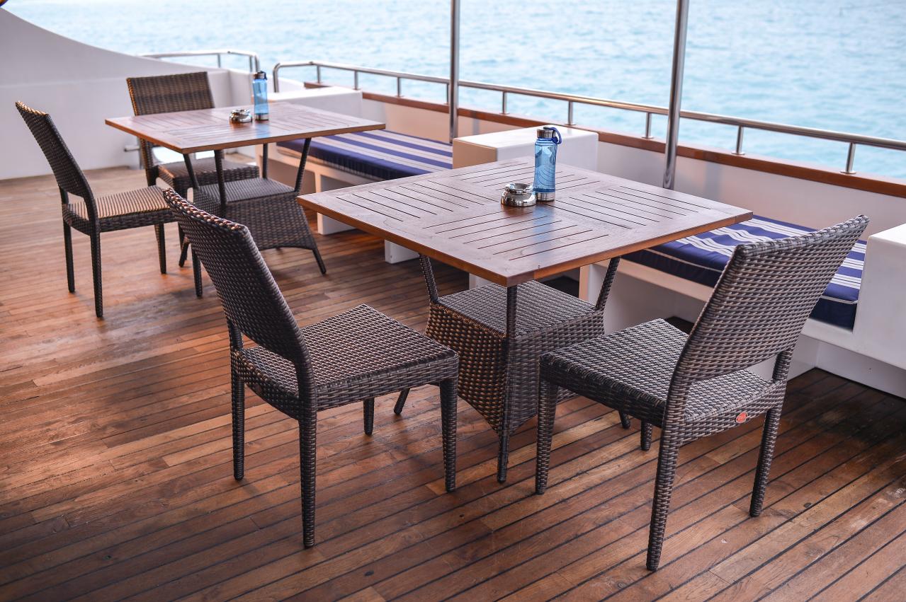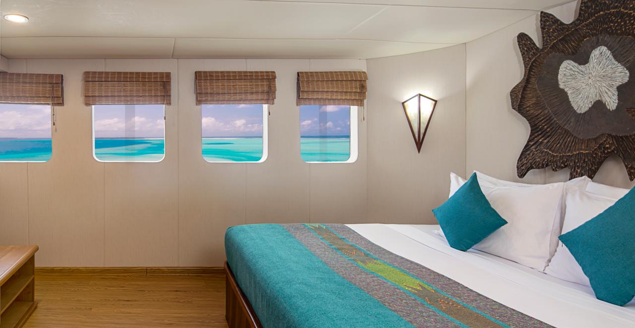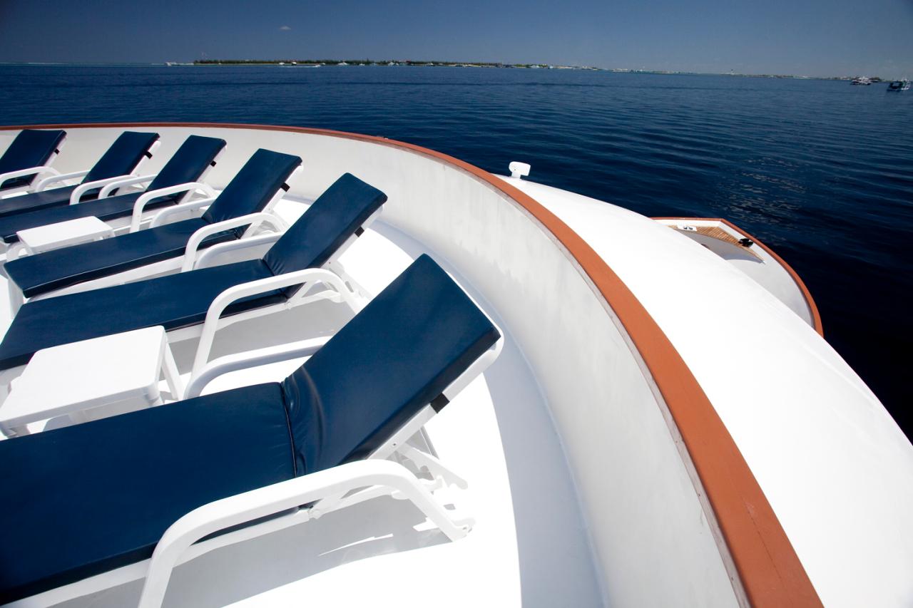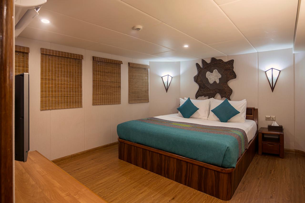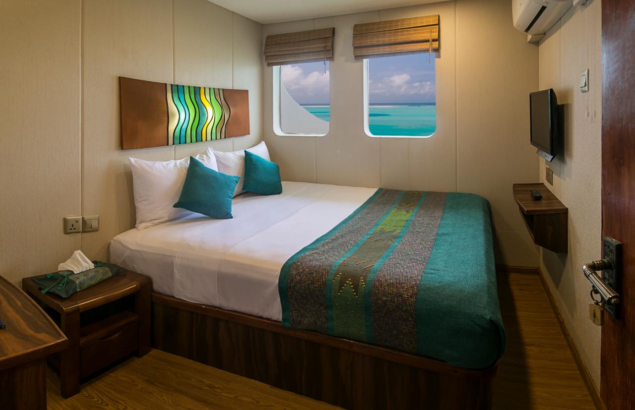 Standard Cabin - The SALSA, SCUBA, SURF, SMILE, SNORKEL, and SKI standard rooms are situated on the cabin deck beneath the main deck. Four of these standard accommodations are particularly spacious and have two convertible single beds into double beds. Each of the other two standard cabins has a single bed and a semi-bunk bed. Maximum Occupancy - 2 persons Bed Configuration: Double or Twin Ensuite: Yes Aircondition: Yes, with control in the room Main Deck Double Cabin - Two cabins with queen-sized double beds, TVs, and DVD/MP3 players are situated on the main deck. Maximum Occupancy - 2 persons Bed Configuration: Double Ensuite: Yes Aircondition: Yes, with control in the room Deluxe Cabin - A large cabin with a queen-size double bed, a flat-screen TV with DVD/MP3 player, and three windows that look out onto the turquoise waters of the Maldives is located opposite the suite on the upper deck. This cabin is called the STAR. Maximum Occupancy - 2 persons Bed Configuration: Double Ensuite: Yes Aircondition: Yes, with control in the room Suite - On the upper deck is the SUN cabin, a particularly spacious suite measuring more than 20 m2. A king-sized bed, a large flat-screen TV with a DVD/MP3 player, a large wardrobe, and storage space are all included in the suite. A lovely view of the sea is provided by the five windows. Maximum Occupancy - 2 persons Bed Configuration: Double Ensuite: Yes Aircondition: Yes, with control in the room