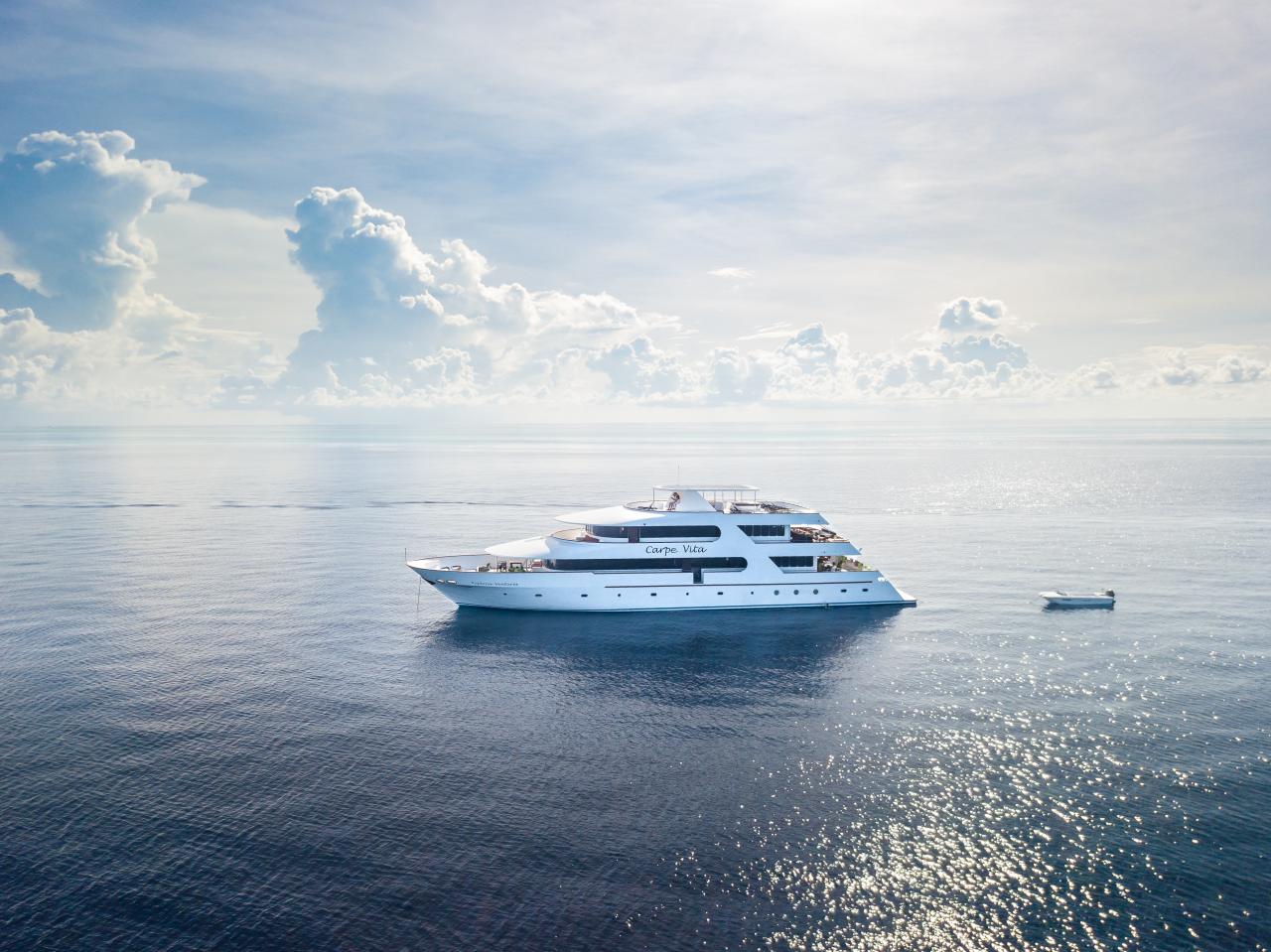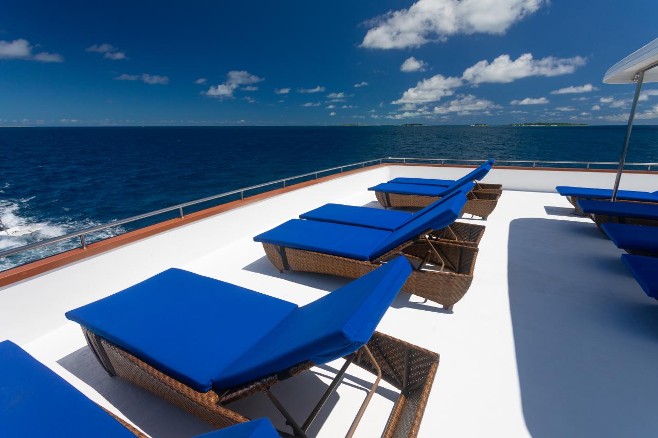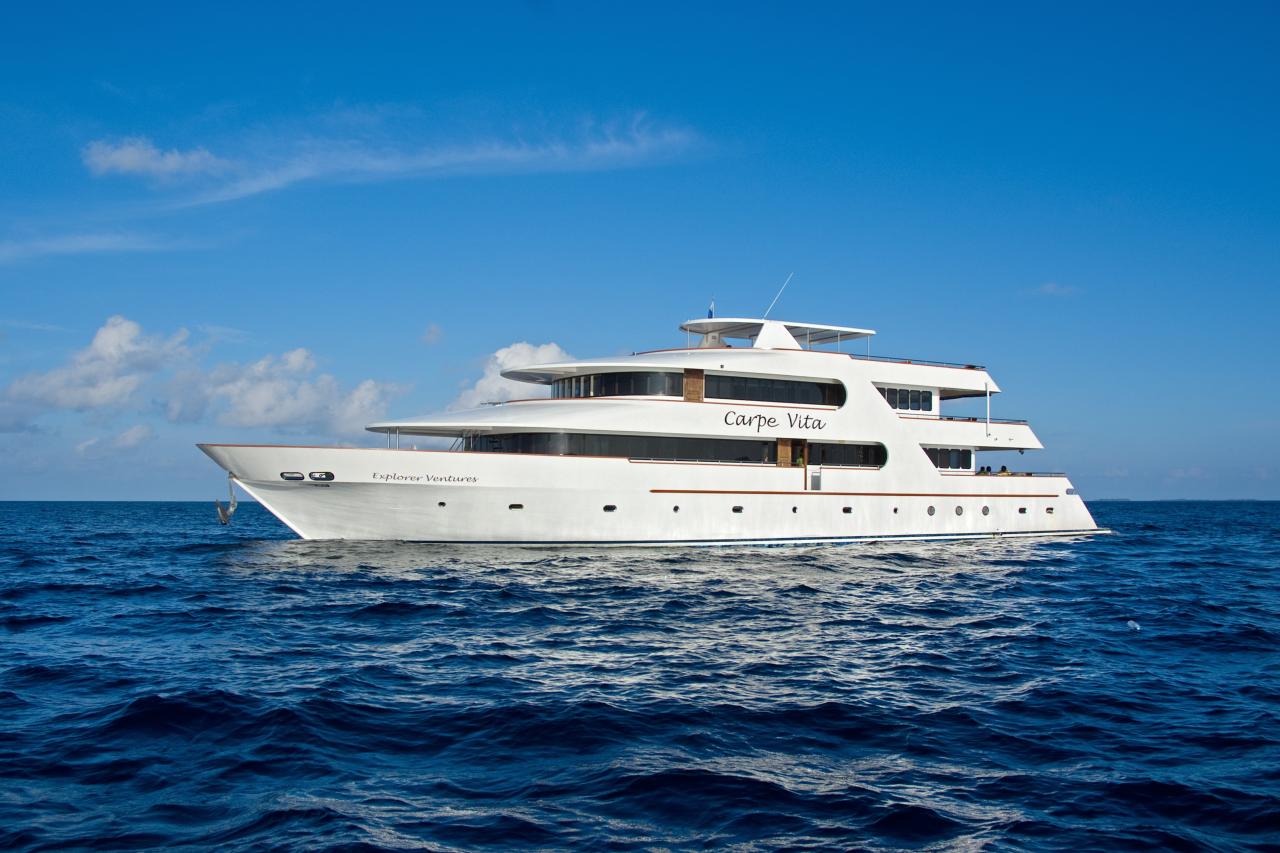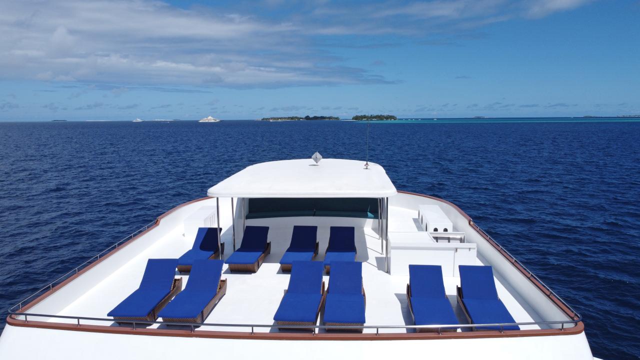MV Carpevita is a 38-meter-long motor safari yacht with a wooden hull. Like Carpe diem, she has a total of 10 rooms on three decks and can accommodate up to 20 divers. On the lower deck, there are six standard rooms, 1 boardroom + 1 dive team room, an engine room, and a crew room. On the main deck, you can find the lounge/restaurant space that serves coffee/tea/buffet tables all day. There is also a comfortable seating area with large flat-screen TVs, DVD/MP3 players, in-house sound systems, libraries, and plug points for laptops. Outside the lounge, there is another seat with a comfortable cushion in the shade, where you can enjoy the beautiful colors of the Indian Ocean while cruising and enjoying afternoon tea. You can also find on the main deck the gallery and spacious cold room, linen warehouse, dive rental storage area, a business center with the Internet and all business center facilities, a camera table, camera charging table, public toilet, platform behind the main deck, two water shower facilities installed, and 2 comfortable superior rooms. In the dining area, stairs ultimately lead you to a wide sun deck. This deck is partially shaded and has a Jacuzzi in the middle, and a lounge chair to catch that nice tan. From the outside as well as from the inside a staircase will lead you to the upper deck and bridge area with a sofa seating area to accompany the captain while driving the boat, a shaded outer seating area in front of the bridge, and a nice view, two beautiful and very spacious VIP suites, main open-air restaurants and bars offer semi-buffet meals prepared by top chefs and offer a wide selection of alcoholic beverages.