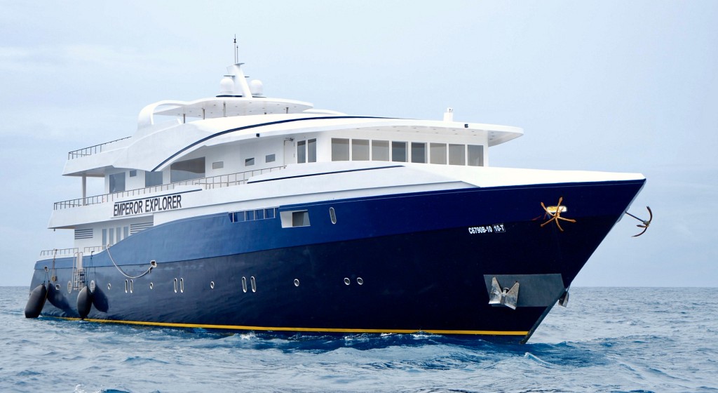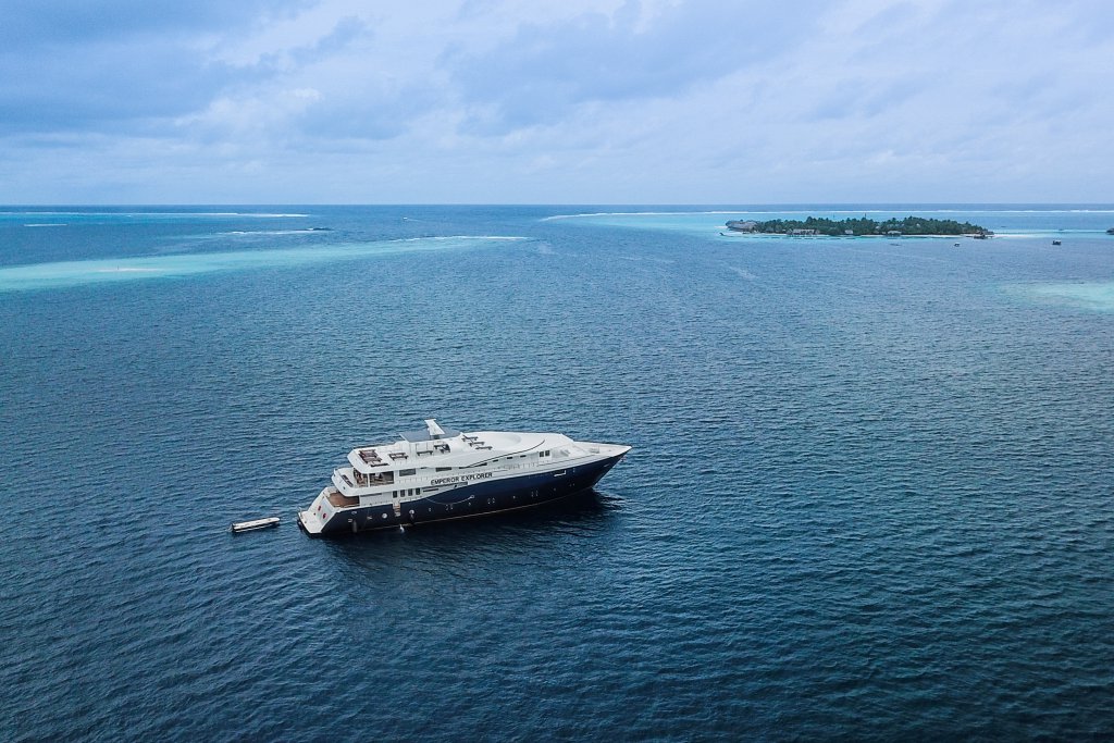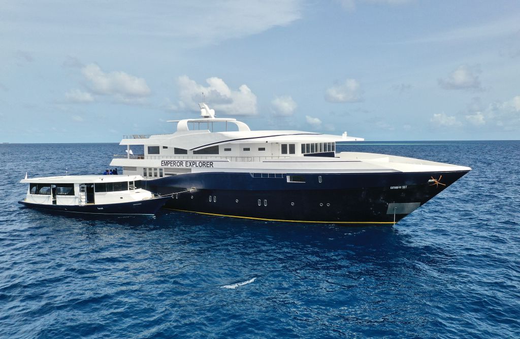 Emperor is a contemporary, spacious liveaboard where fine accommodation and service are standard. This 42-metre boat easily accommodates 26 guests in 13 well-appointed ensuite cabins all with aircondition. Add to that her spa, spacious diving, and relaxation areas and she's a winner.Enjoy an open-air dining area at the stern of the main deck. Several sofas and tables await you inside the air-conditioned saloon for relaxing or watching TV. A complimentary glass of wine is served with dinner. The upper deck boasts a covered, open area ideal for watching photos and footage from your diving or just relaxing, star gazing, and soaking up the wonderful Maldivian ambiance. The sundeck is perfect for catching those sunrays or having a reviving nap.