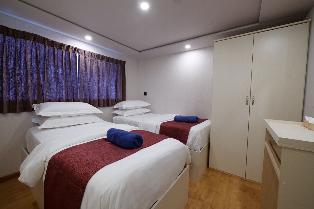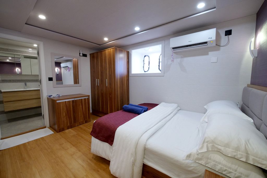 Lower Deck Twin - Twin cabin located at the lower deck at approximately 11–12 square meters in size with portholes. Each cabin has a double and a single bed, individual air conditioning, and a flat-screen TV (USB connection). It has an ensuite bathroom with a shower at 4-5 square meters, 2 cabin towels per guest are provided and hair dryers are available upon request. Maximum Occupancy: 2 persons Bed Configuration: Double and Single/Double Ensuite: Yes Aircondition: Yes, with control in the room Lower Deck Double - Double bed cabin located at the lower deck at approximately 9 square meters in size with port holes. Each cabin has a double bed, individually controlled aircon, and a flat-screen TV (USB connection). It has an ensuite bathroom with a shower at approximately 4.5 square meters, 2 cabin towels are provided per guest, and hairdryers are available upon request. Maximum Occupancy: 2 persons Bed Configuration: Double Ensuite: Yes Aircondition: Yes, with control in the room Main Deck Suite Cabin - Located on the main deck at approximately. 18 square meters with windows. Each cabin has a king-sized double and single bed, individually controlled aircon, and a flat-screen TV (USB connection). It has an ensuite bathroom with a shower at approximately 5 square meters, 2 cabin towels are provided per guest, and hairdryers are available upon request. Maximum Occupancy: 2 persons Bed Configuration: King-sized Double and Single Ensuite: Yes Aircondition: Yes, with control in the room Upper Deck Suite Double - Located on the upper deck at approximately 14.5 square meters with windows. Each cabin has a king-sized double bed, individually controlled aircon, and a flat-screen TV (USB connection). It has an ensuite bathroom with a shower at approximately 5.5 square meters, 2 cabin towels are provided per guest, and hairdryers are available upon request. Maximum Occupancy: 2 persons Bed Configuration: King-sized Double Ensuite: Yes Aircondition: Yes, with control in the room Upper Deck Twin - Located on the upper deck at approximately 9 square meters with windows, a double and single bed, individually controlled aircon, and flat-screen TV (USB connection). It has an ensuite bathroom with a shower at approximately 4 square meters, 2 cabin towels are provided per guest, and hairdryers are available upon request. Maximum Occupancy: 2 persons Bed Configuration: Double and Single Ensuite: Yes Aircondition: Yes, with control in the room