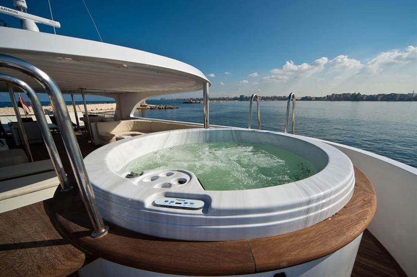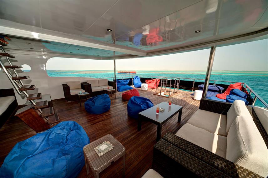 The new 40m MY Odyssey liveaboard Egypt is a tastefully furnished vessel with 13 staterooms that can accommodate up to 26 guests.Each cabin is modern, airy, and spacious, with one double and one single bed. Each cabin provides a lot of storage space, reading lamps, air conditioning, and private bathrooms. The exquisite dining room with a drinks station is on the main deck and leads onto the well-equipped dive deck. The upper deck houses the comfortable interior salon and bar area with a flat-screen TV and entertainment system, as well as the outdoor covered lounge terrace with sofas and beanbags.