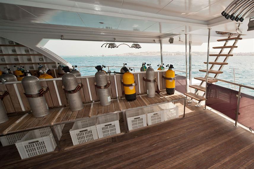 Engines: MAN of 1100 HP each Generators: Perkins: 2 X 150 KVA and 1 X 65 KVA Compressors: Bauer nitrox is available in 32% Zodiacs: 85 horsepower Yamaha Cabins - 8 cabins with twin beds and 5 cabins with double beds all with air conditioning Diving Equipment: 12L aluminum in Din or INT, 15L available on request Radar, GPS, radio, telephone, and satellite internet. Water maker Complete pharmacy, oxygen therapy, fife rafts