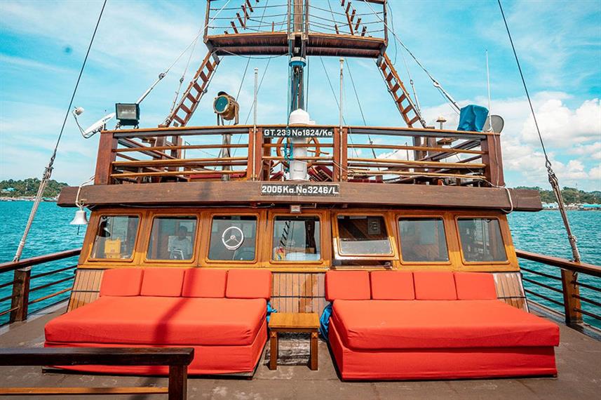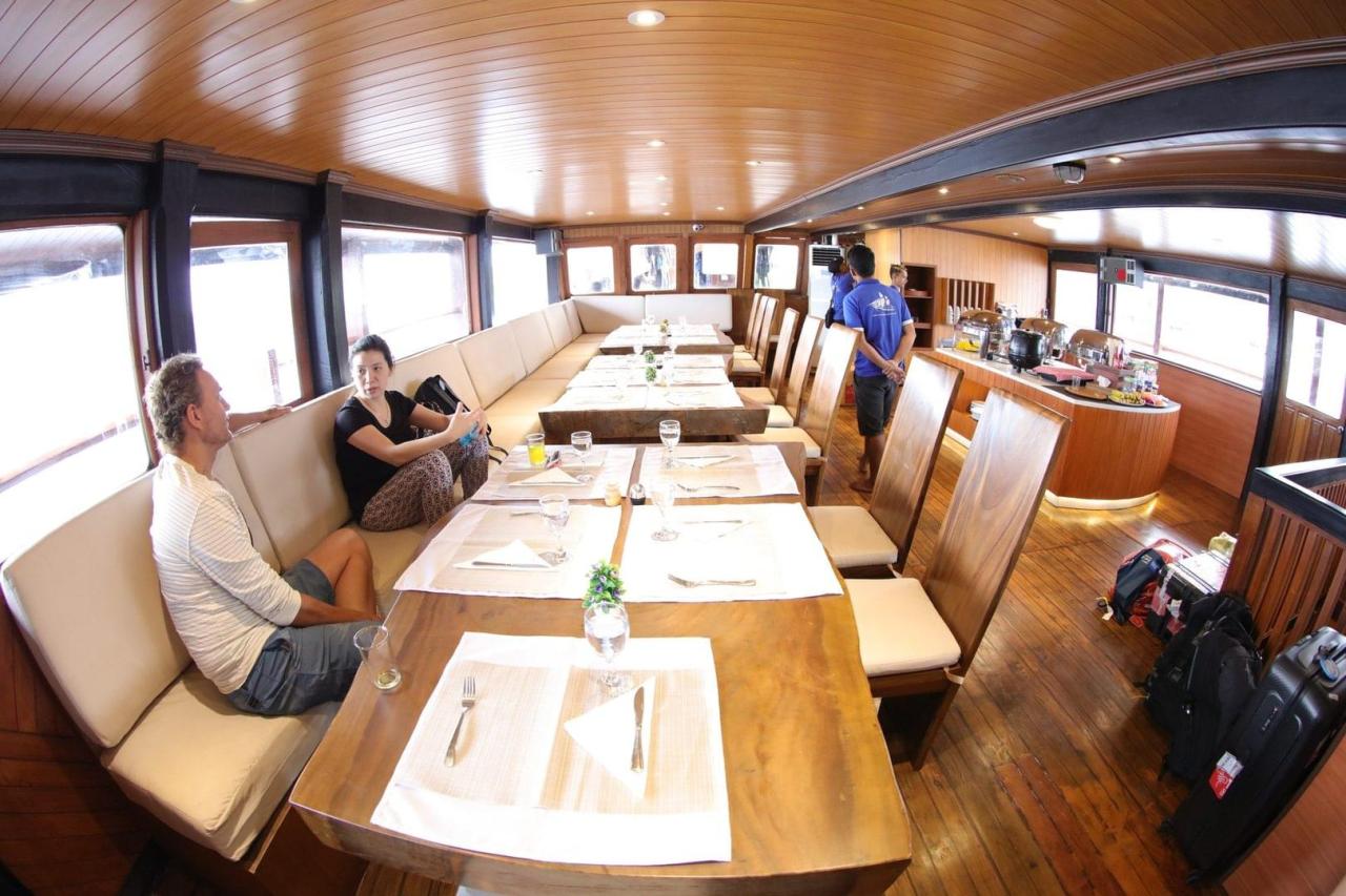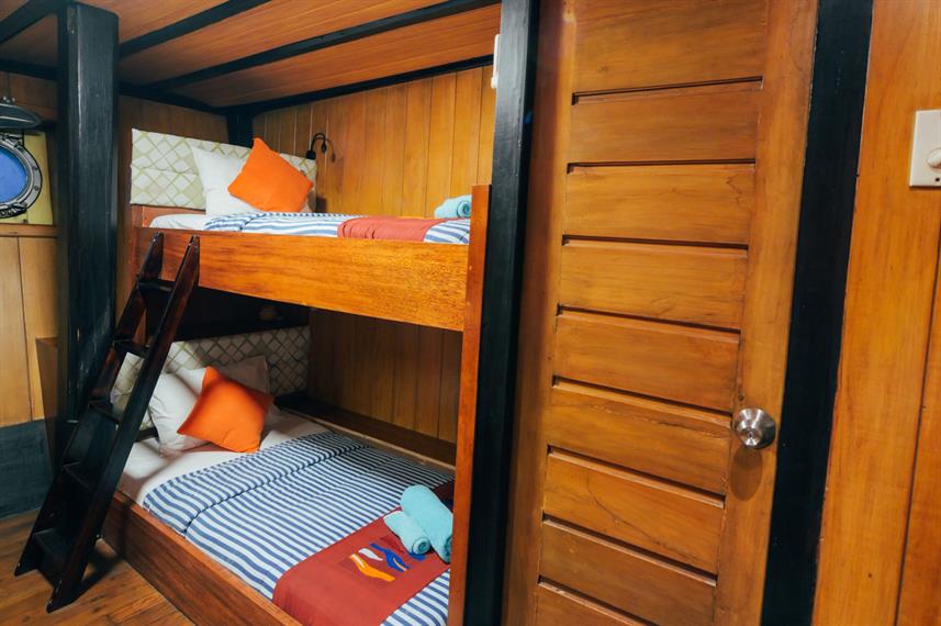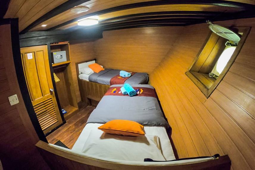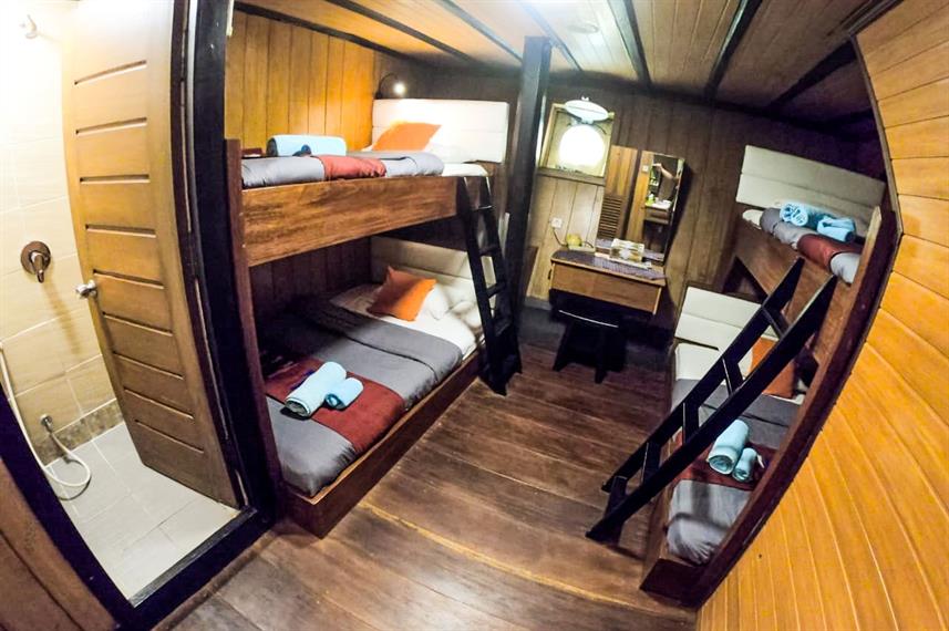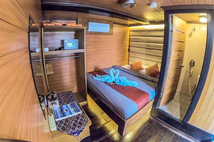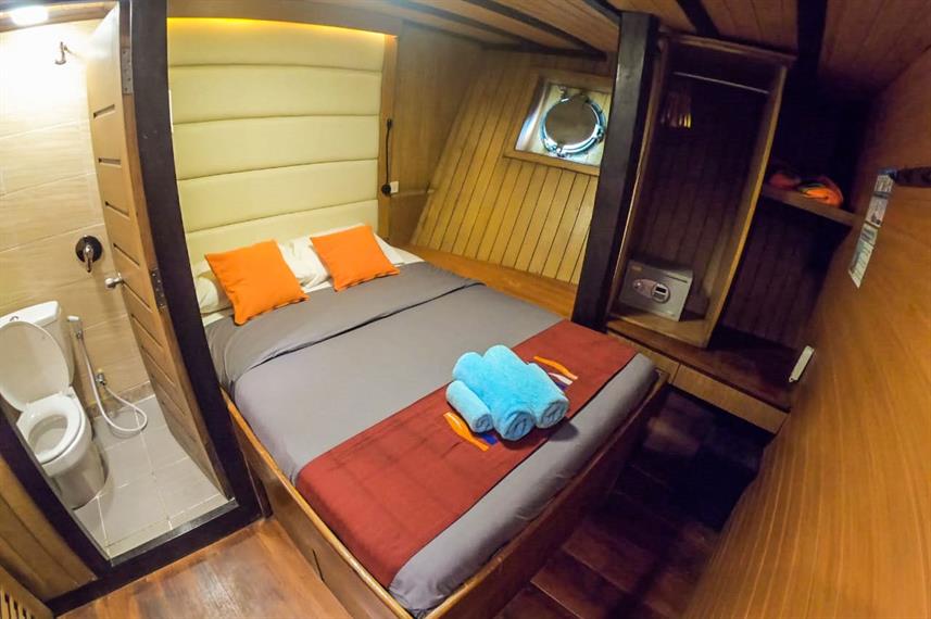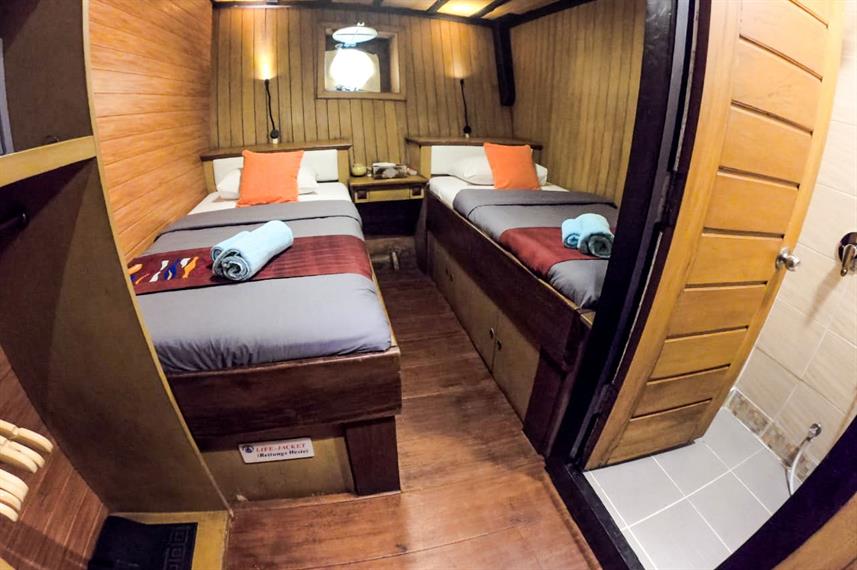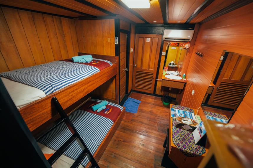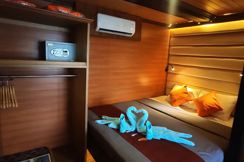 Lower Deck Single Cabin - Located on the lower deck, this modest bunk chamber can accommodate only one guest. Maximum Occupancy: 1 person Bed Configuration: Single Ensuite: Yes Aircondition: Yes, with control in the room Lower Deck Twin Cabins - Located on the lower deck, each cabin has 2 single beds, private bathroom, basin, hot and cold shower, and an air conditioner. Maximum Occupancy: 2 persons Bed Configuration: Twin (2 Single) Ensuite: Yes Aircondition: Yes, with control in the room Lower Deck Double Cabin - Located on the lower deck, each cabin has a deluxe double bed, private bathroom, basin, hot and cold shower, and air conditioner. Maximum Occupancy: 2 persons Bed Configuration: Double Ensuite: Yes Aircondition: Yes, with control in the room Middle Deck Double Cabin - 4 cabins are located behind the dinning room/restaurant, each cabin has a double bed with private bathroom, basin, hot and cold shower and multi split air conditioner, TV and water heater Maximum Occupancy: 2 persons Bed Configuration: Double Ensuite: Yes Aircondition: Yes, with control in the room