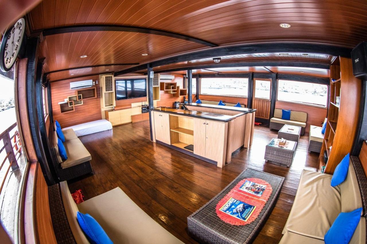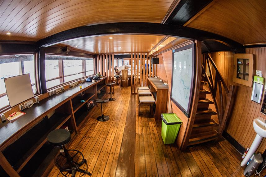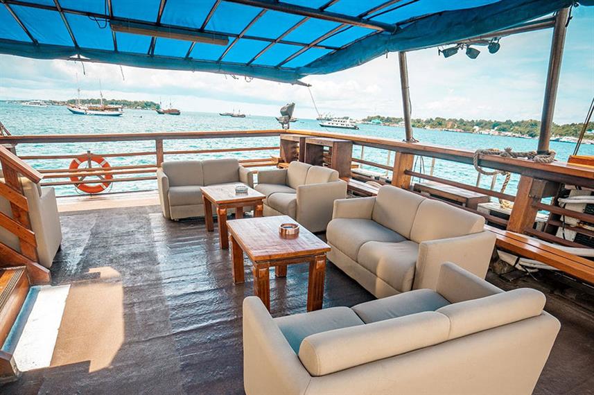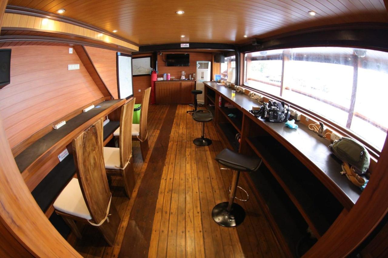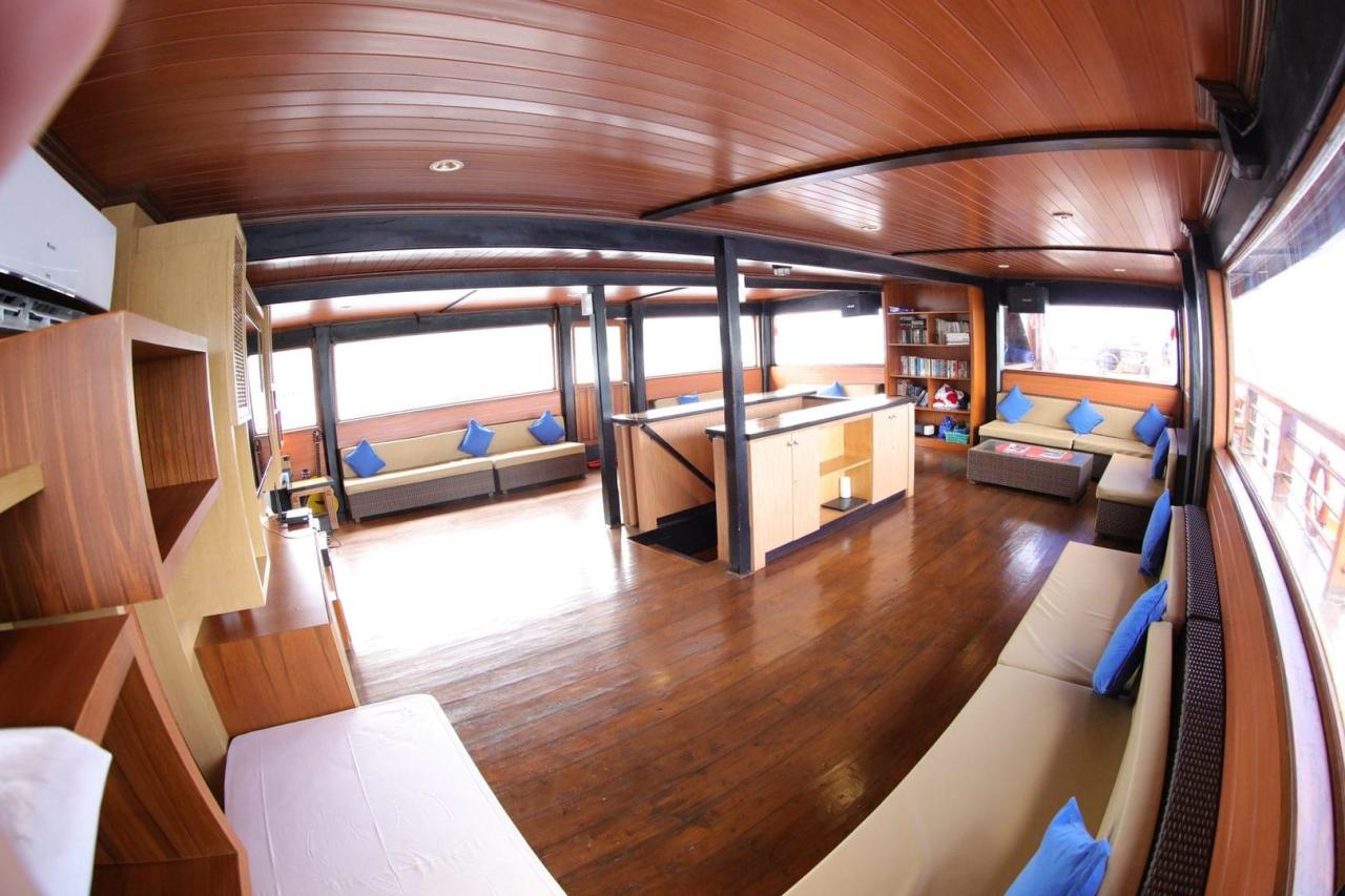 The 34m Sea Safari 8 was constructed in the classic Indonesian Phinisi style, giving a comfortable platform for exploring the Indonesian archipelago. Sea Safari 8 features 12 air-conditioned guest cabins, each with an en suite bathroom and a flat-screen television. It also features a big air-conditioned café with a television and DVD player, as well as a dedicated place for camera maintenance and setup.Upstairs, a wide and comfortable interior lounge with 42” LCD TV and entertainment system.