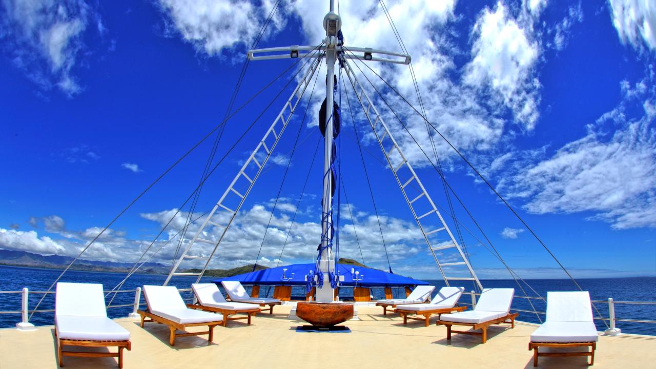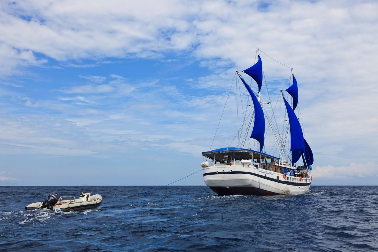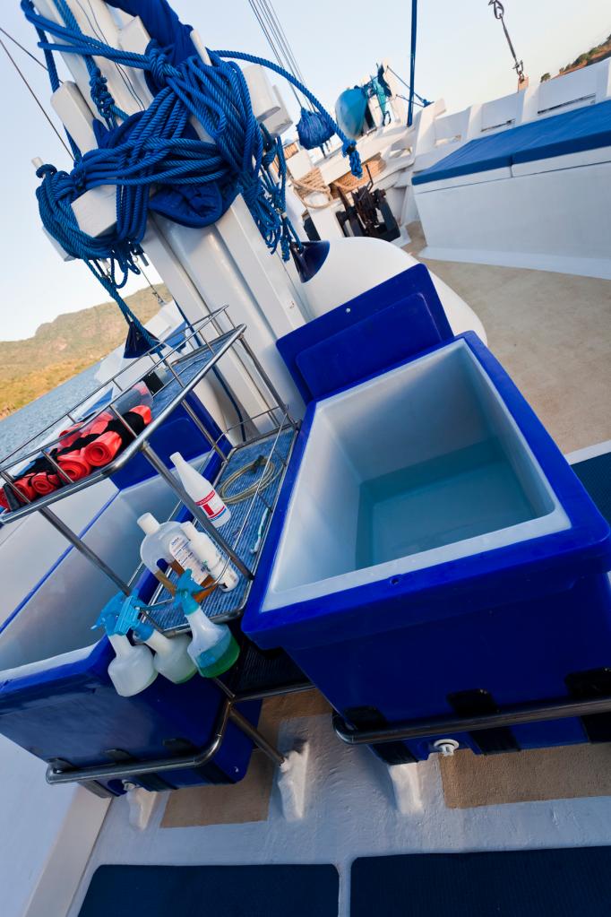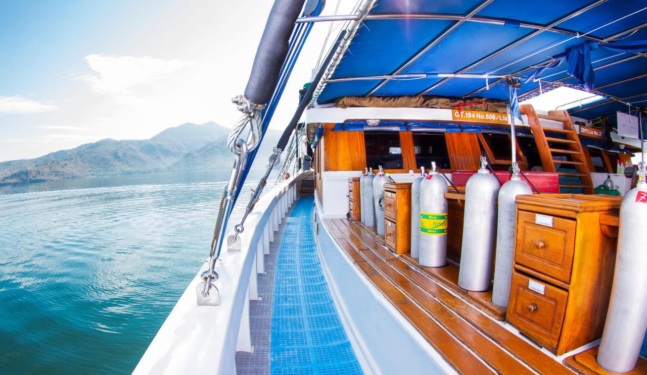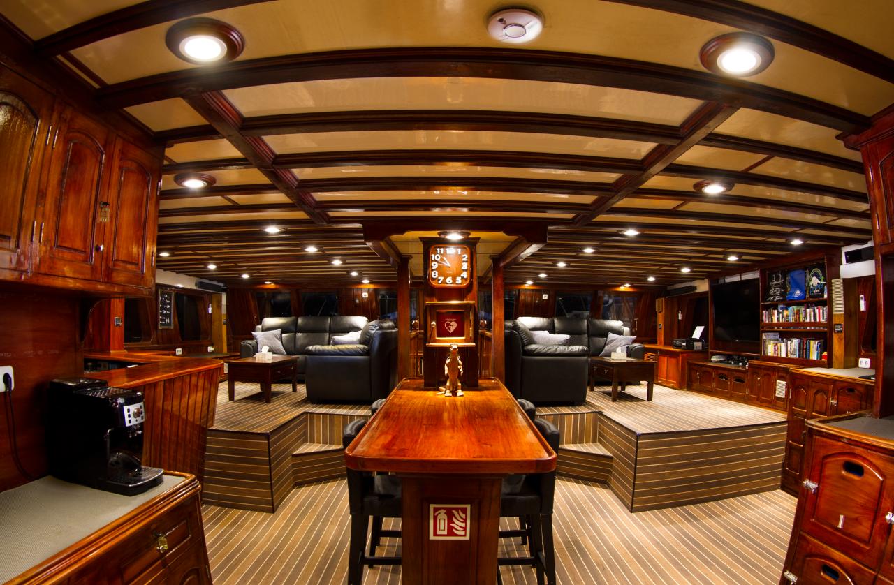 Technical: Length: 40m Width: 9.7m Engines: 2 Generators: 3 Hull: Wood Fresh water maker: Yes Vessel facilities: Guests: 16 Twin Cabins: 6 Double Cabins: 2 Ensuite bathrooms: Yes Air-conditioning: Yes Towel change: Yes Saloon: Yes Sundeck: Yes Diving facilities: Dive school: Yes Equipment rental: Yes Nitrox membrane: Yes Rebreather friendly: Yes Charging station: Yes Photography friendly: Yes Compressors: 2 x MCH 13 Tenders: 2 Guides: 4 Safety First aid: Yes First aiders: Yes Emergency Oxygen: Yes Oxygen administrators: Yes Life Jackets: Yes Life Rafts: Yes VHF ship to tender radios: Yes Fire fighting equipment: Yes AED: Yes Smoke detectors: Yes