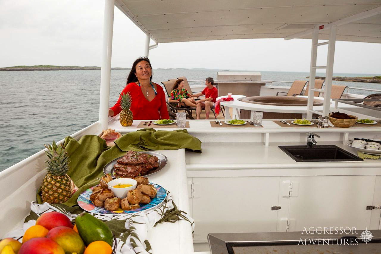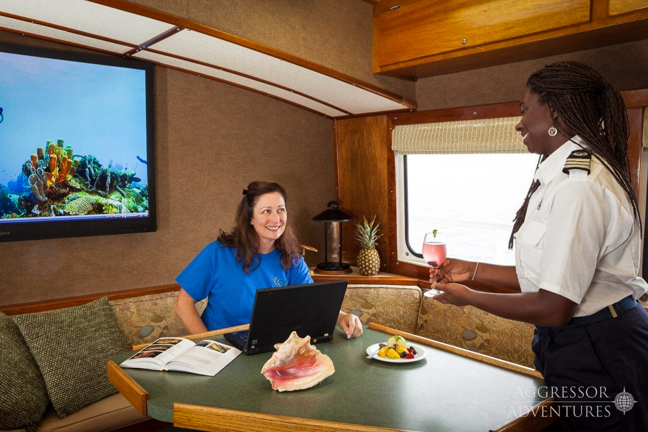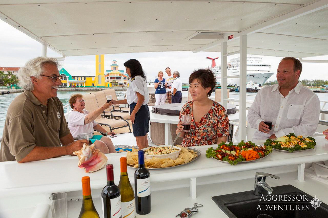 The Bahamas Aggressor is a 100-foot wide-beamed yacht. She is powered by diesel, cruises at 12 knots, and has 110-volt power onboard. She was designed and propelled for comfort, safety, and stability. All cabins have standard US outlets and USB hookups for charging electronic equipment. There are 5 deluxe guestrooms with a double and single bunk and 1 quad cabin with two sets of twin beds. In all cabins, climate control is accessible.The Bahamas Aggressor accommodates 14 guests in comfort and privacy. She features a large, air-conditioned salon and dining area, as well as a sun deck with a hot tub, lounge, deck chairs, an outdoor stereo system, a shaded cocktail deck, a grill, and a guest photo editing computer. Among the diving amenities are individual dive lockers, a camera table with low-pressure air hoses, and two hot, freshwater showers.The package price includes all meals, snacks, and beverages.