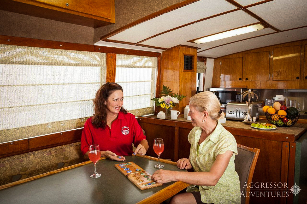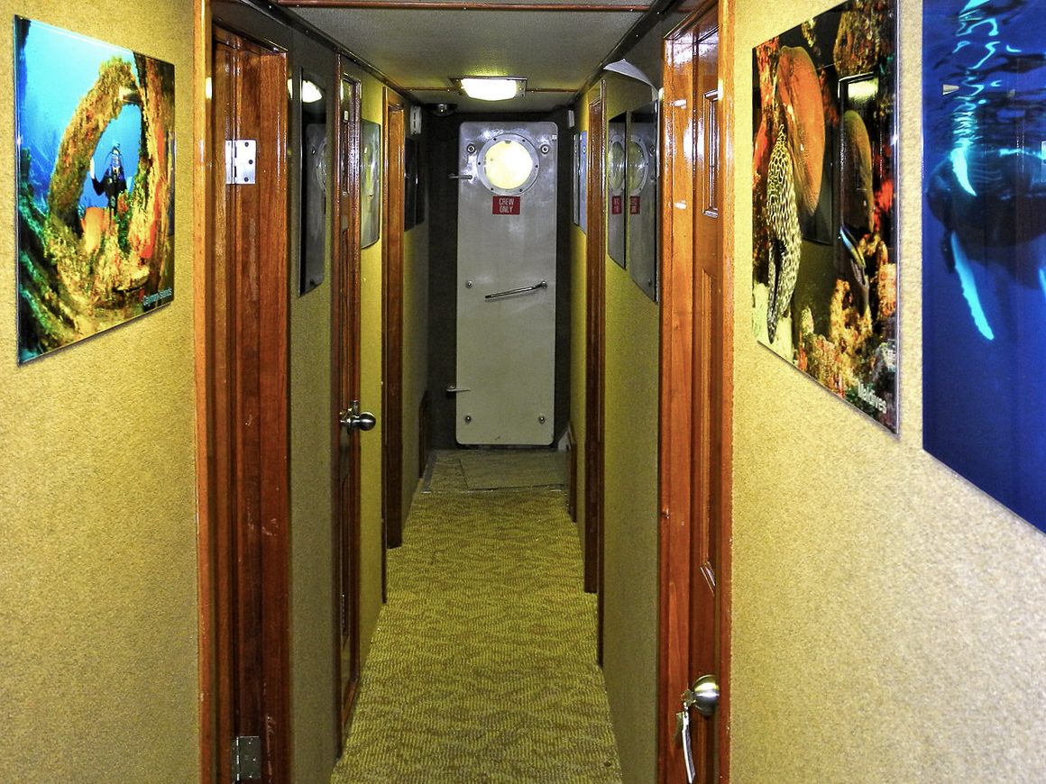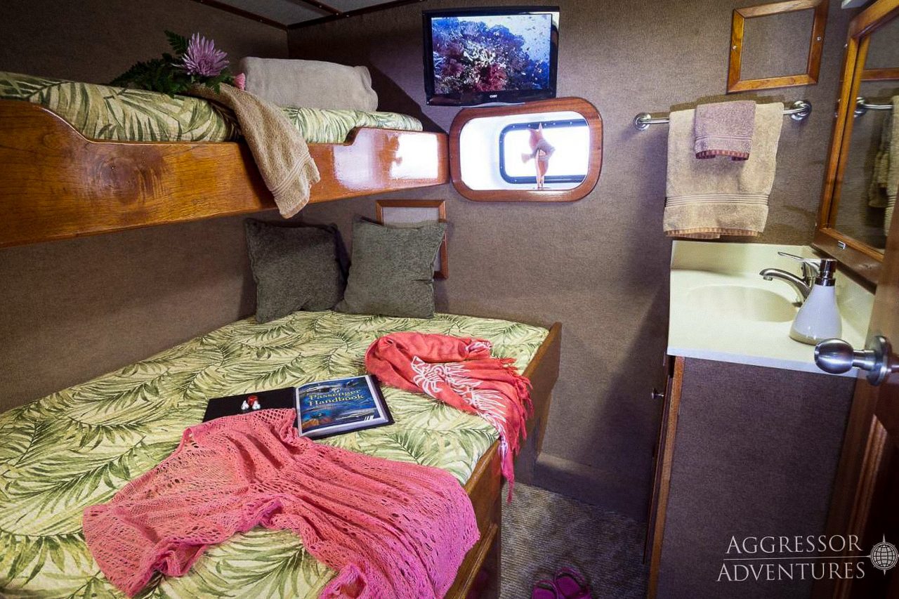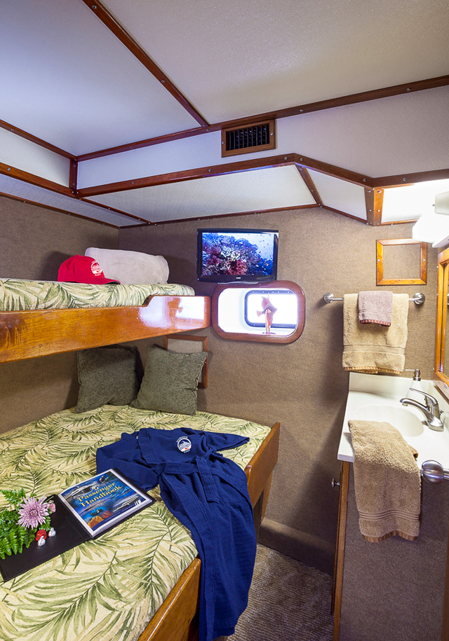A comfortable stateroom with a port hole, double bed (lower) and twin bed (upper) bunk-style with a private head and shower. Your stateroom is the perfect place to read a book, nap in between dives and fully recharge for the next day.