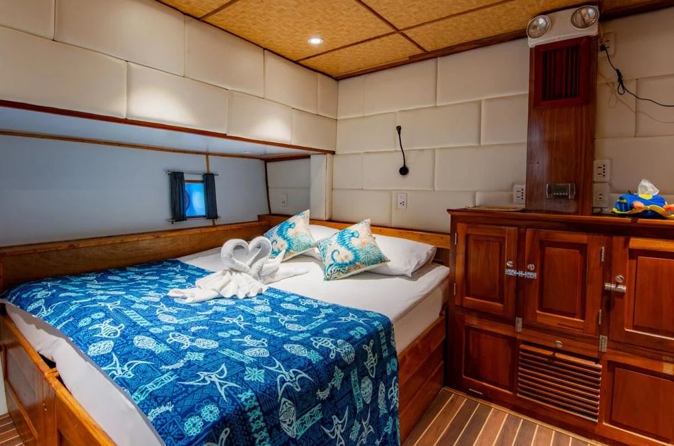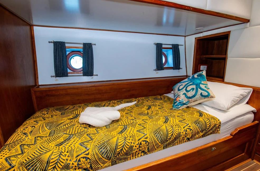 Premium Double Cabin - The Palau Siren offers two fixed double-bed cabins located at the bow, each thoughtfully designed for comfort and convenience. These cabins feature individually controlled air-conditioning, generous storage space, and en-suite bathrooms with hot water. To enhance the onboard experience, guests are also provided with bathrobes and towels for added luxury.Maximum Occupancy: 2 PersonsBed Configuration: DoubleEnsuite: YesAircondition: Yes, with control in the room