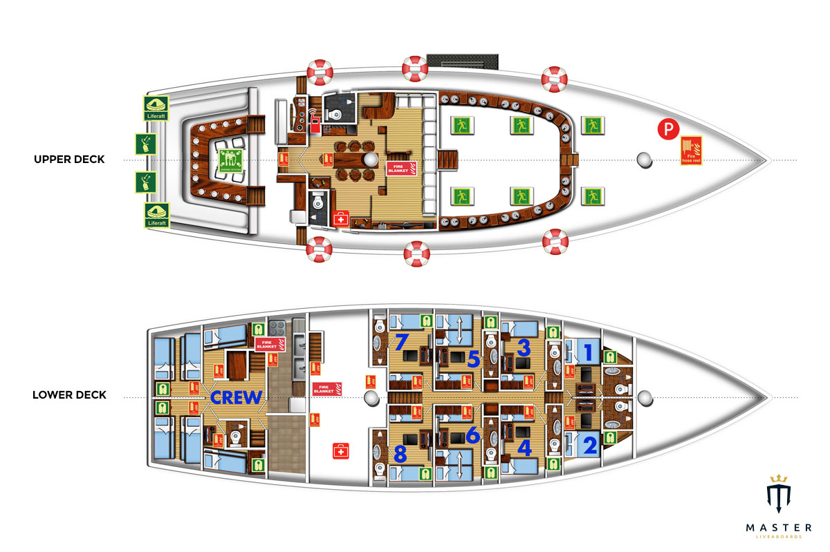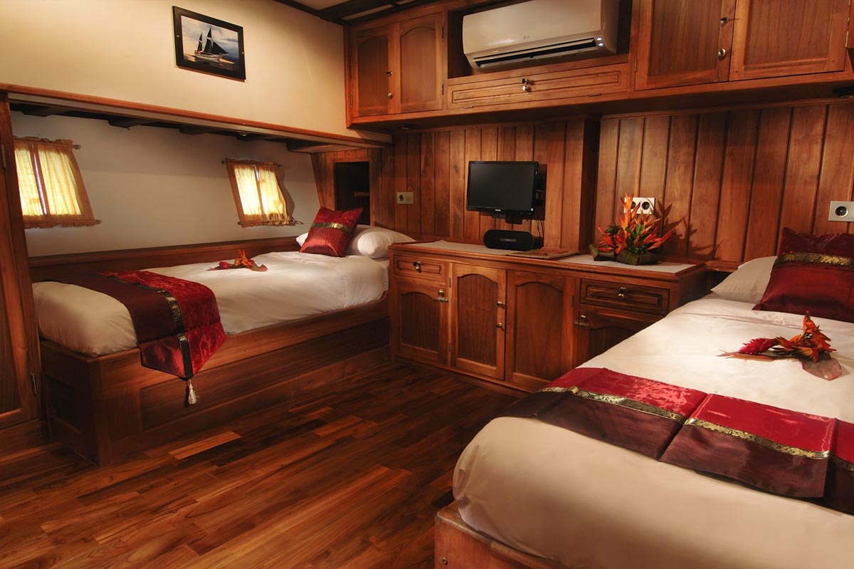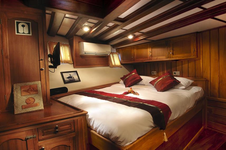 Premium Twin Cabin - Four fixed twin bed cabins and two flexible double/twin bed cabins are available on the lower deck; each is air-conditioned and features ample storage space as well as private ensuite bathrooms with hot water. Bathrobes and towels are provided for extra luxury. Maximum Occupancy: 2 persons Bed Configuration: Twin and/or double Ensuite: Yes Aircon: Yes, with control in the room Premium Double Cabin - There are two fixed double bed cabins on the lower deck; each is air-conditioned and includes ample storage space as well as a private ensuite bathroom with hot water. Bathrobes and towels are provided for extra luxury. Max. occupancy: 2 Bed Configuration: Double Ensuite: Yes Aircon: Yes, with control in the room