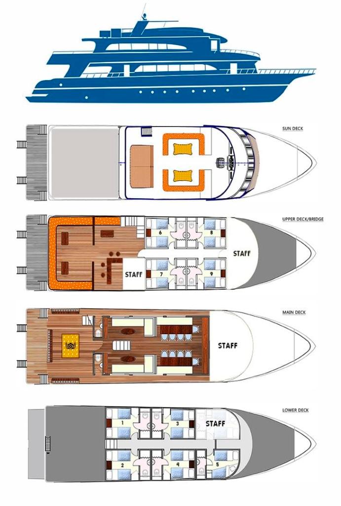 Lower Deck Cabin - There are five twin cabins (Cabin 1 - Cabin 5)on the lower deck. Each with two single beds, an independent air conditioning unit, an ensuite bathroom, and a shower. Maximum Occupancy: 2 persons Bed Configuration: Twin (2 Single) Ensuite: Yes Aircondition: Yes, with control in the room Upper Deck Cabin - There are four cabins on the upper deck (Cabins 6 to Cabin 9). Each cabin has two single beds, a scenic view of the ocean, an independent air conditioning unit, an ensuite bathroom, and a shower. Maximum Occupancy: 2 persons Bed Configuration: Twin (2 Single) Ensuite: Yes Aircondition: Yes, with control in the room