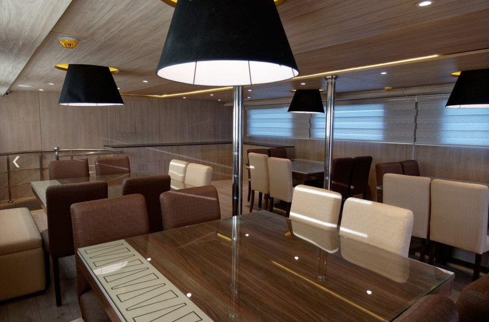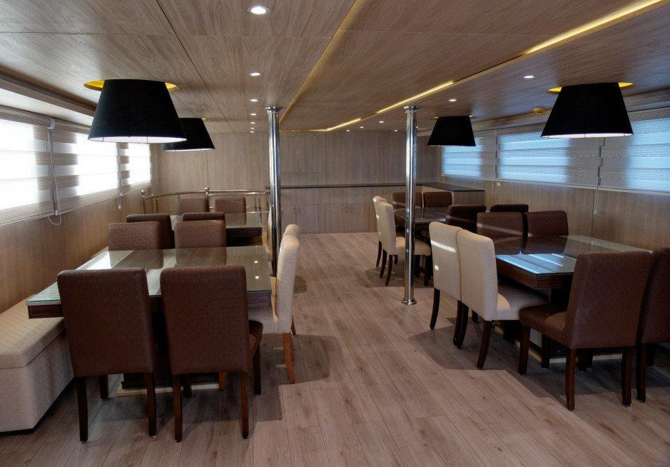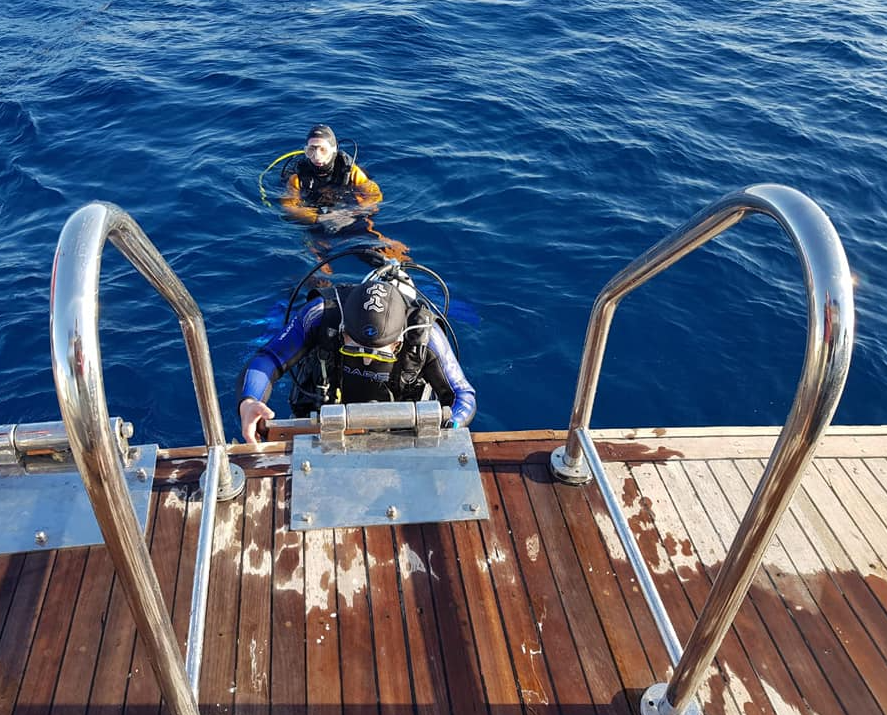 Length 43 meters Beam 8 meters Top speed 13 knots Cruising speed 11 knots Engines 2(MAN 1150 HP) Silent generators 2 (160 KW/H each) Air compressors 4 Aluminum 12 L.A. tanks 32 life rafts 2 (25 pax each) Guest cabins 14 Closed saloons 2 Dining room 1 Desalination water maker 10 tons/day Central marine air condition Speed boats 7m with 2 outboard 2