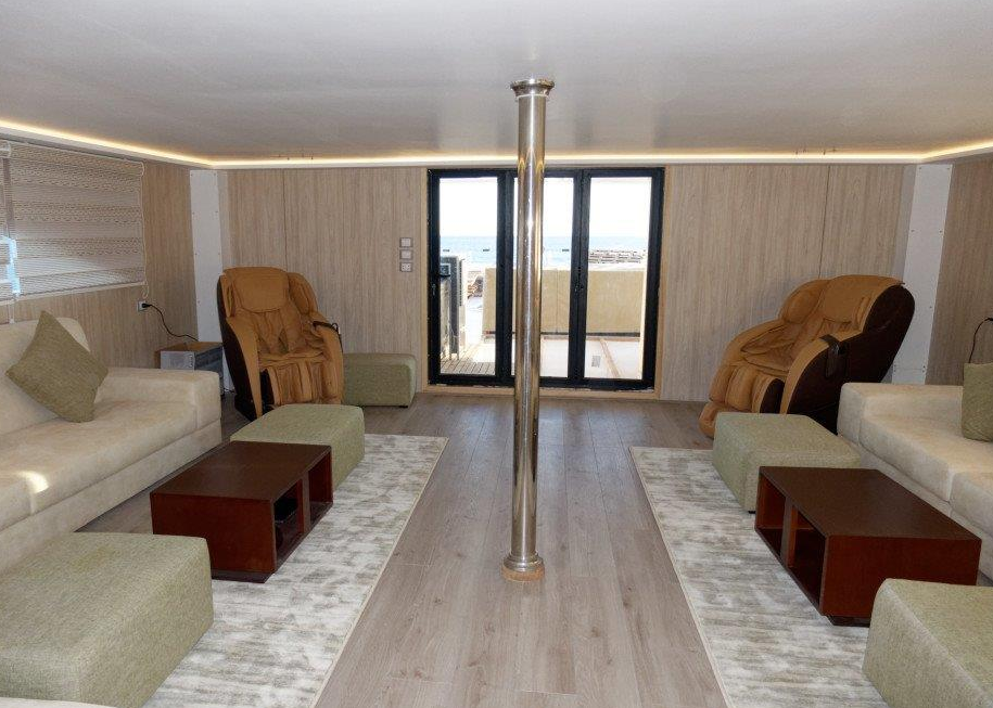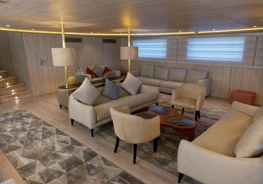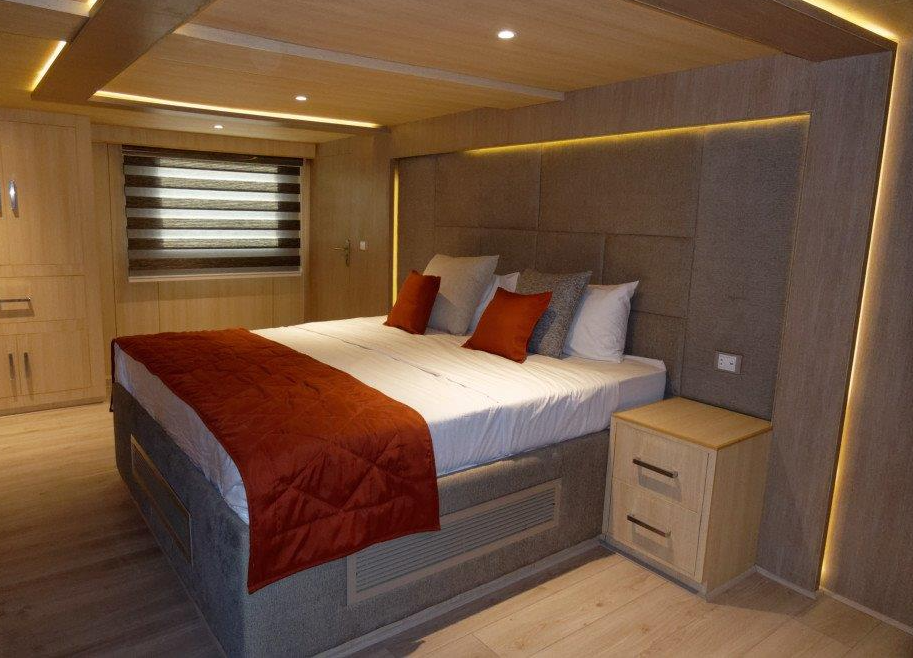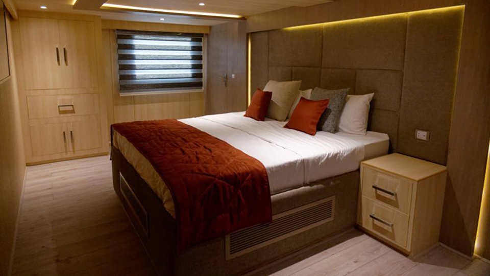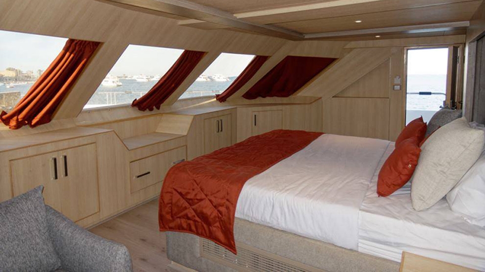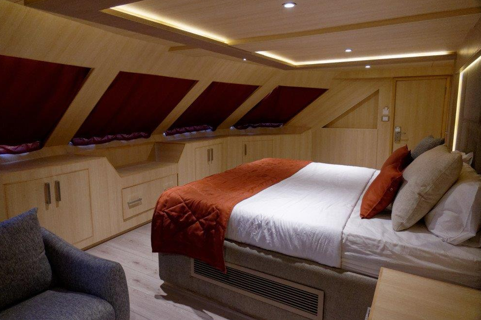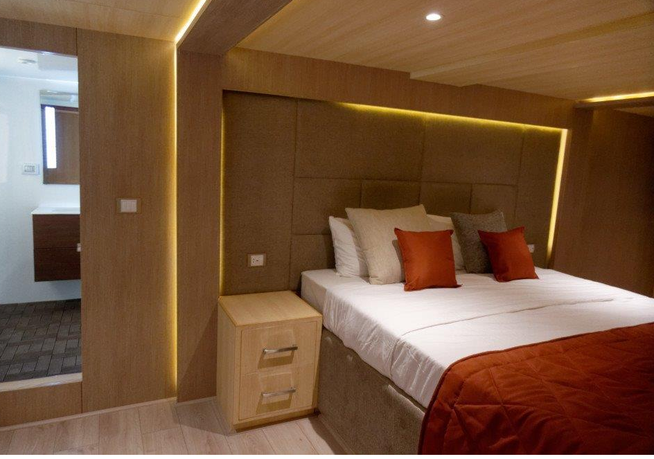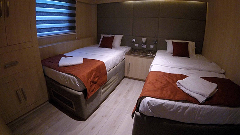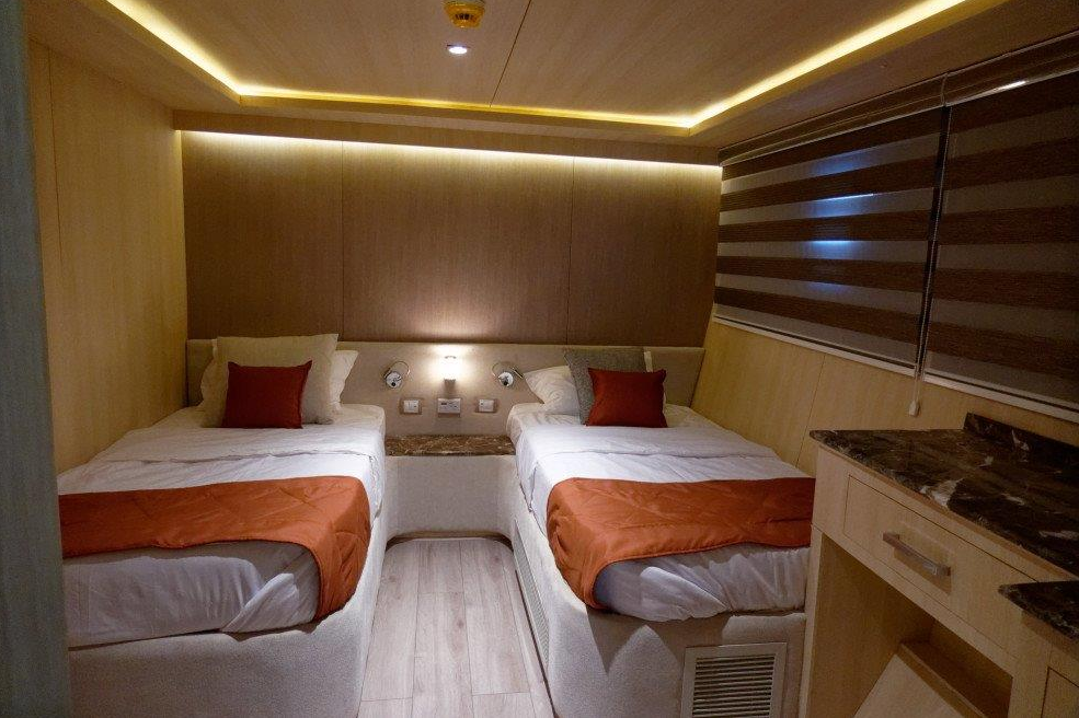 Lower Deck Cabin - On the lower deck, there are six cabins with two single beds (twins). Each cabin has a bathroom, air conditioning, a "marine sat" TV, a safe, Wi-Fi, and an electronic lock. Maximum Occupancy: 2 persons Bed Configuration: Twin (2 Single) Ensuite Bathroom: Yes Aircondition: Yes, with control in the room Main Deck Cabin - On the middle deck, there are six staterooms with twin/double (convertible) beds. Each cabin has a bathroom, air conditioning, a "marine sat" TV, a safe, Wi-Fi, and an electronic lock. Maximum Occupancy: 2 persons Bed Configuration: Double or Twin Ensuite Bathroom: Yes Aircondition: Yes, with control in the room Upper Deck Cabin - On the upper deck, there are two cabins, each with a double bed. Each cabin has a bathroom, air conditioning, a "marine sat" TV, a safe, Wi-Fi, and an electronic lock. Maximum Occupancy: 2 persons Bed Configuration: Double Ensuite Bathroom: Yes Aircondition: Yes, with control in the room