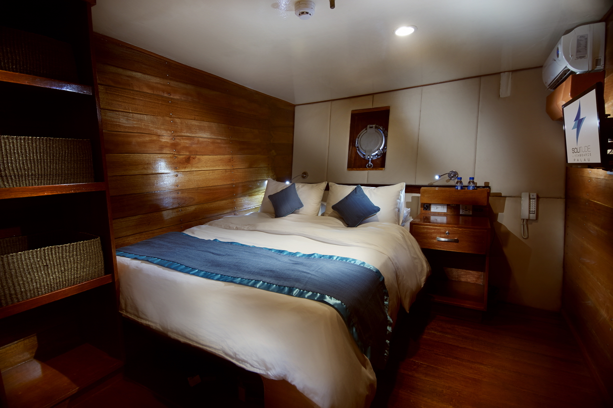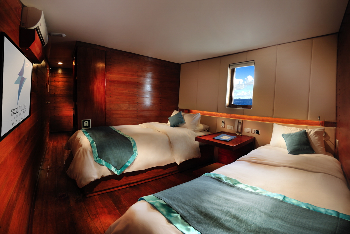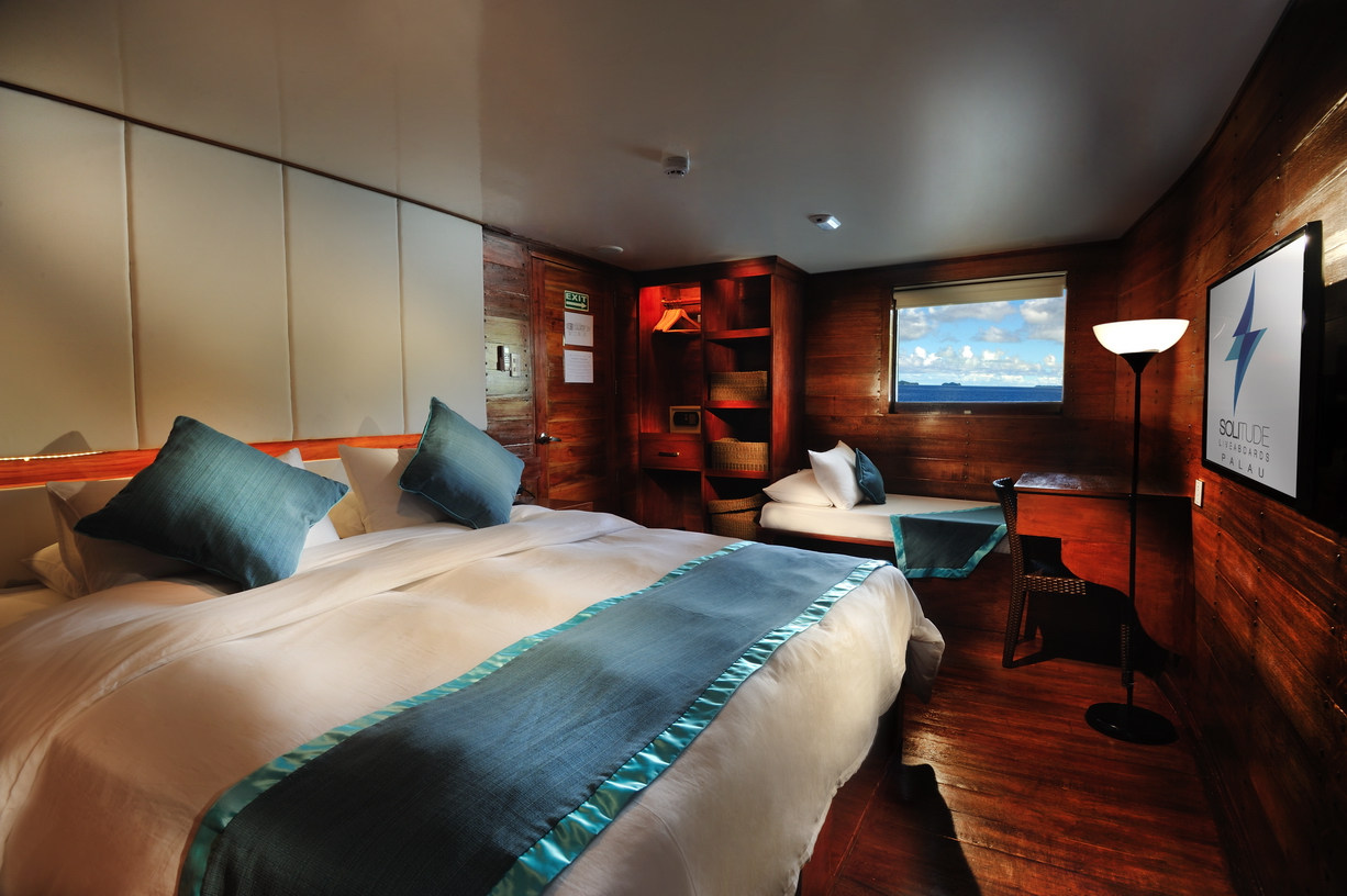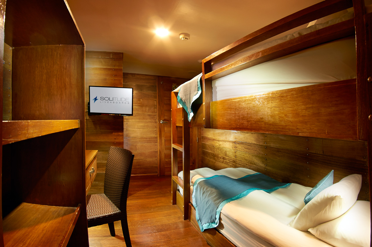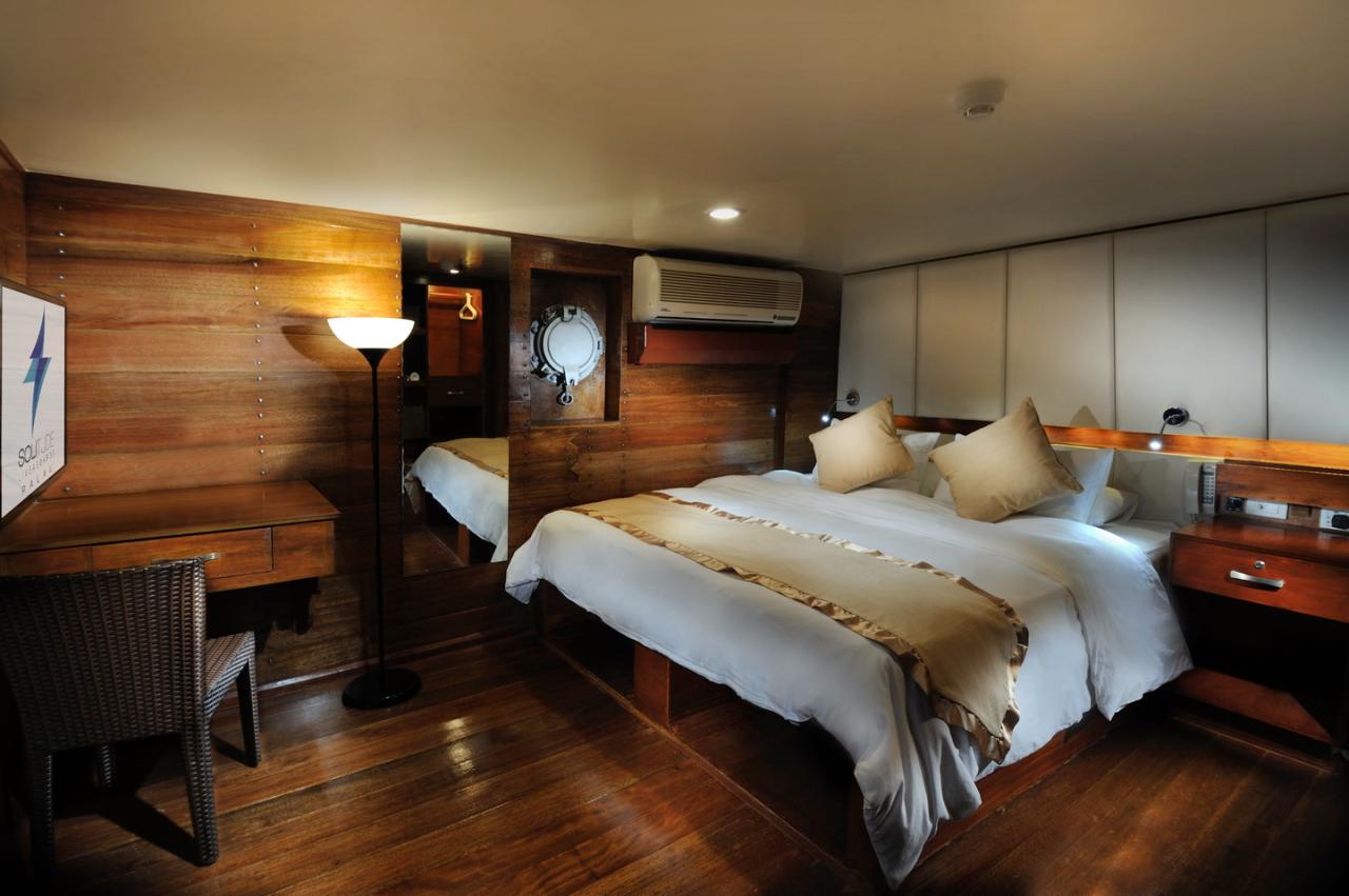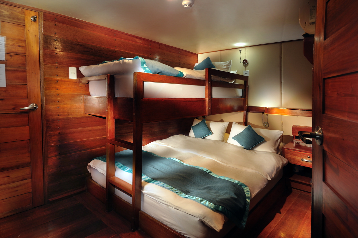 Stateroom - There are three available staterooms. A1 and A2 are on the top deck, while B6 is on the lower deck. Each cabin has an en-suite bathroom, individual climate control, bathrobes, towels, a hairdryer, toiletries, and plenty of storage. Every day, the cabins are cleaned. Cabins A1 and B6 each have one double bed, while cabin A2 has one twin bed (2 single beds). When making a reservation, please specify your preferred bedding configuration. Maximum Occupancy: 2 persons Bed Configuration: Double or Twin Ensuite: Yes Aircon: Aircon with control in the room Deluxe Twin Cabin - Cabins B3, B5, and B7 are available for twin or double occupancy. *Bunk Beds in Cabin B4: Twin Sharing All cabins are designed to accommodate two people in terms of living and storage space. Each cabin has an en-suite bathroom, individual climate control, bathrobes, towels, a hairdryer, toiletries, and plenty of storage. Every day, the cabins are cleaned. When making a reservation, please specify your preferred bedding configuration. Maximum Occupancy: 2 persons Bed Configuration: Double or Twin Ensuite: Yes Aircon: Aircon with control in the room Deluxe Double Cabin - One queen-sized bed is provided in the Deluxe cabins (Cabin B1 & B2). All cabins are designed to accommodate two people in terms of living and storage space. Each cabin has an en-suite bathroom, individual climate control, bathrobes, towels, a hairdryer, toiletries, and plenty of storage. Every day, the cabins are cleaned. Maximum Occupancy: 2 persons Bed Configuration: Double Ensuite: Yes Aircon: Aircon with control in the room Standard Quad - The Standard Quad-Sharing cabin was created for families, small groups of friends, or individuals who don't mind sharing with other divers. This cabin offers a better value package while still providing the same level of service and hospitality. There are two bunk beds and two single beds in the cabin. Each guest has his or her own wardrobe as well as personal electrical outlets to charge their own devices. Guests in this cabin will find the space and layout to be more than adequate, including an en-suite toilet designed for four people sharing. Maximum Occupancy: 4 persons Bed Configuration: Single bed Ensuite: Yes Aircon: Aircon with control in the room