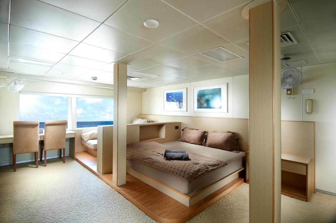 Stateroom - By far the largest cabin onboard is the one and only stateroom. Ideal for guests looking for maximum comfort on their cruise. Maximum Occupancy: 2 persons Bed Configuration: Double or Twin Ensuite: Yes Aircondition: Yes, with control in the room Deluxe Cabins - Furnished with big windows to let you enjoy the comforts of your own bed while taking in the breathtaking views of the surrounding islands and the ocean. Maximum Occupancy: 2 persons Bed Configuration: Twin (2 Single) Ensuite: Yes Aircondition: Yes, with control in the room Quad Cabin - The quad cabin, with its two bunk beds, is perfect for small parties, families, and lone travelers. Maximum Occupancy: 4 persons Bed Configuration: 4 Single Ensuite: Yes Aircondition: Yes, with control in the room