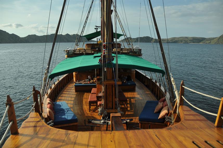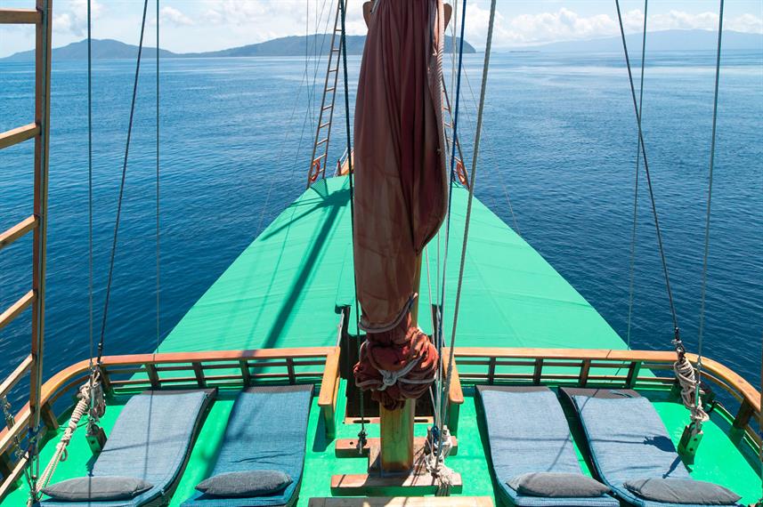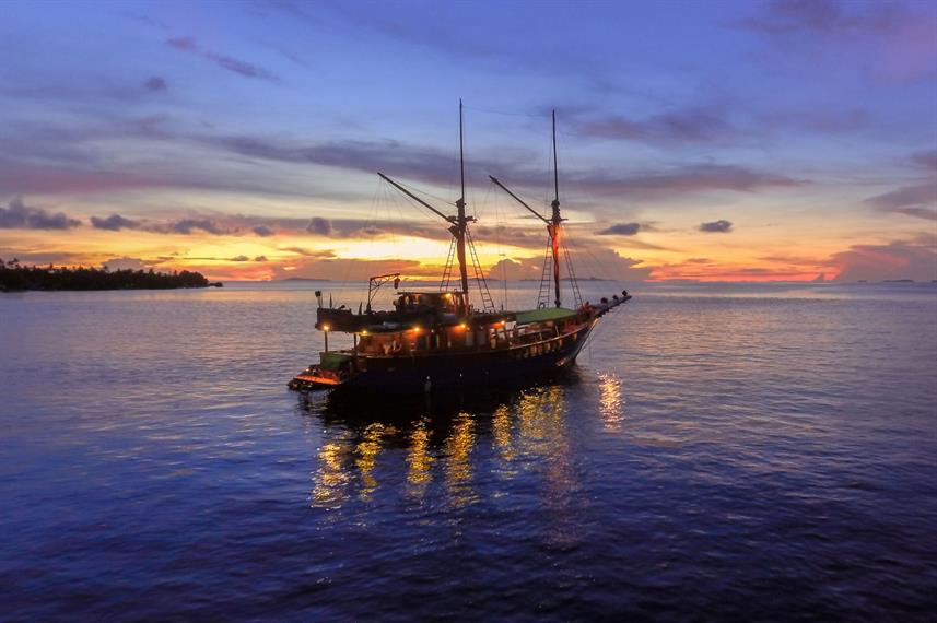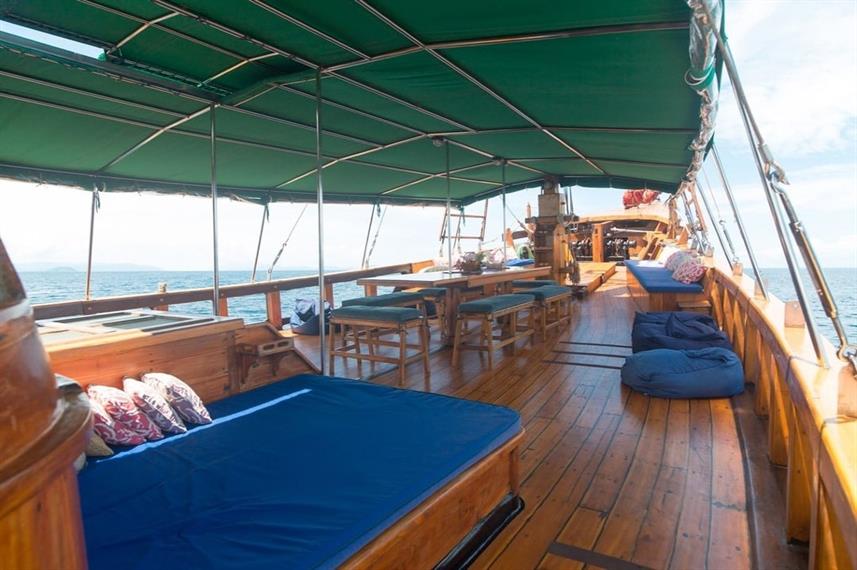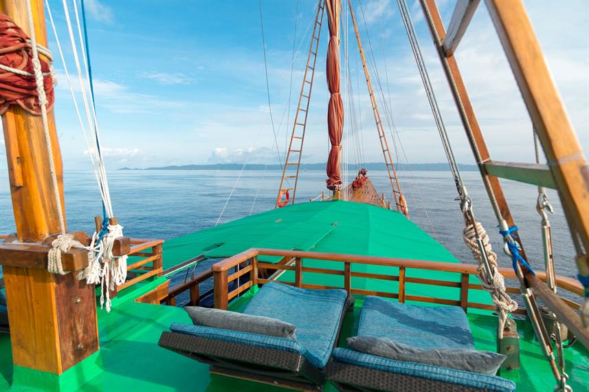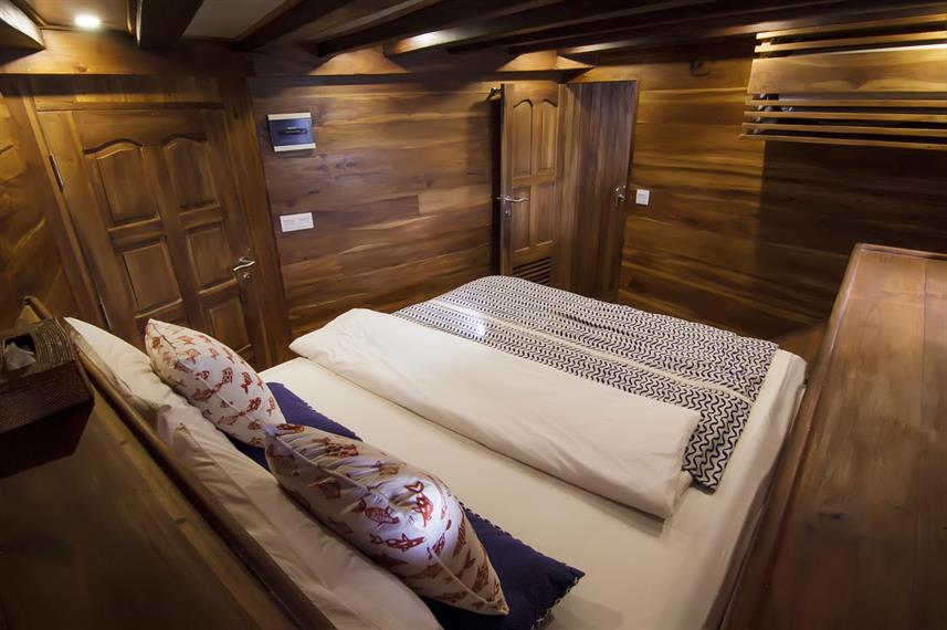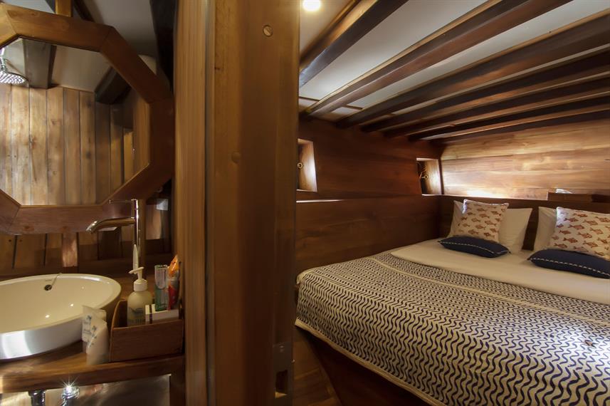 Build: Bira, Sulawesi, Indonesia in 2008 Type: Traditional gaft-rigged timber phinisi (ironwood & teak) Dimesions: Length: 34 m / 112 ft; Beam: 7.5 m / 25 ft, CRUSING SPEED: 8-10 knots Tenders: RIB 5.8m 4-stroke 150HP (10 man), RIB 3.8m 50HP (5 man) Watersports Equipment: 2 Sea Kayaks, Kneeboards, Wakeboards, Waterskis and Fishing Gear Water: 11 ton stock. Echotec fresh water maker, 2 fresh-water showers on dive platform Communication: VHF, SSB & satellite telephone Team: Captain, Cruise Director / Dive Master, 2 Housekeepers, Chef, Sous-chef, 2 Engineers & 2 Deckhands Cabins: 3 x Standard Cabins; 2 x Superior Cabins