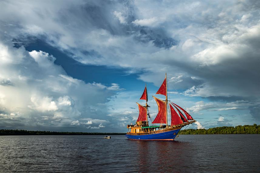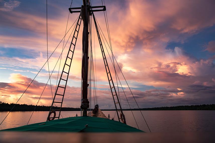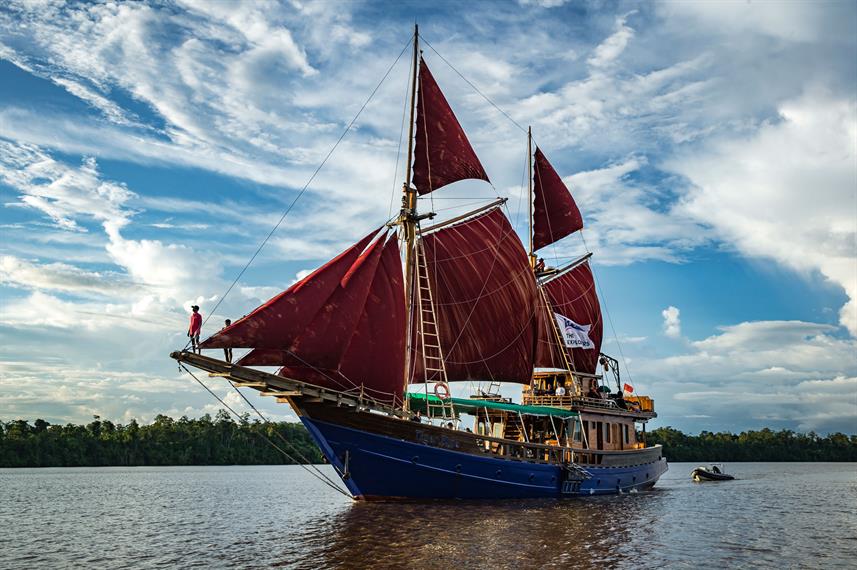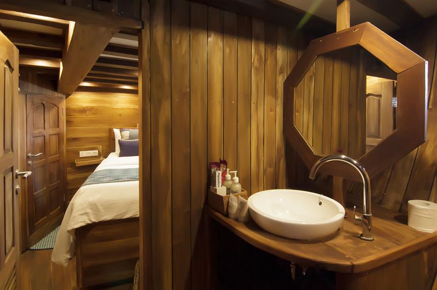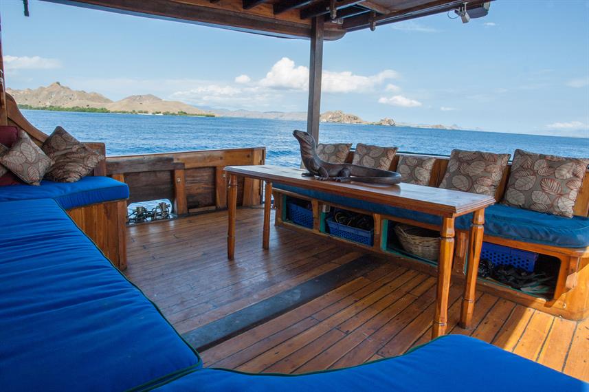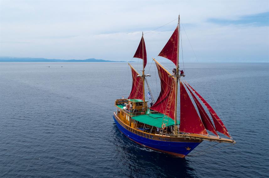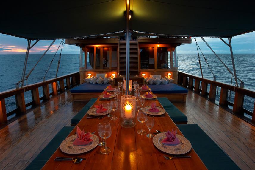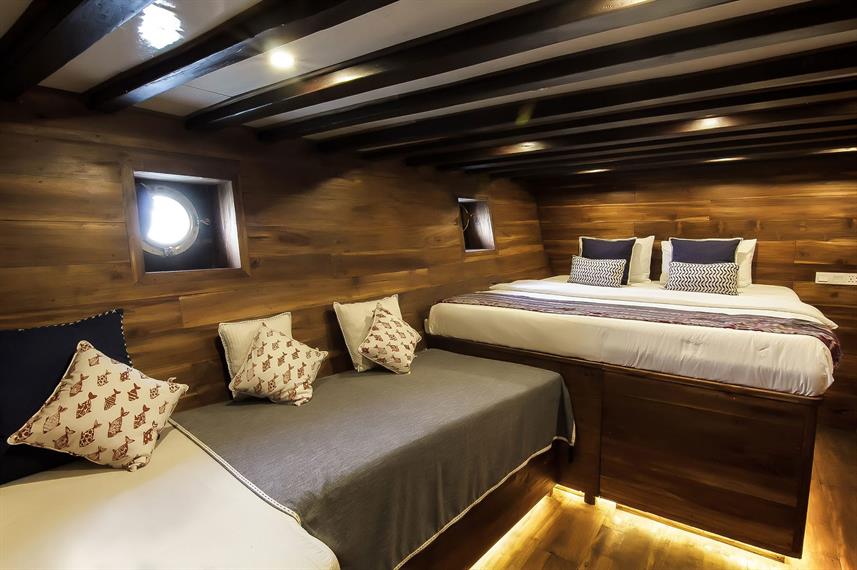 Build: Bira, Sulawesi, Indonesia in 2008 Type: Traditional gaft-rigged timber phinisi (ironwood & teak) Dimesions: Length: 34 m / 112 ft; Beam: 7.5 m / 25 ft, CRUSING SPEED: 8-10 knots Tenders: RIB 5.8m 4-stroke 150HP (10 man), RIB 3.8m 50HP (5 man) Watersports Equipment: 2 Sea Kayaks, Kneeboards, Wakeboards, Waterskis and Fishing Gear Water: 11 ton stock. Echotec fresh water maker, 2 fresh-water showers on dive platform Communication: VHF, SSB & satellite telephone Team: Captain, Cruise Director / Dive Master, 2 Housekeepers, Chef, Sous-chef, 2 Engineers & 2 Deckhands Cabins: 3 x Standard Cabins; 2 x Superior Cabins