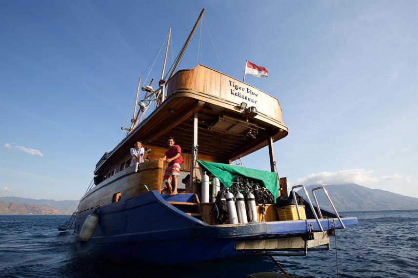 Tiger Blue is a traditional 34m timber phinisi yacht that sails around the stunning Eastern Indonesian islands. A journey on Tiger Blue is guaranteed to be packed with unforgettable moments, whether it's searching for dragons on Komodo, spotting birds of paradise in West Papua, or snorkeling with giant manta rays over the coral gardens of Raja Ampat. The sense of space is one of Tiger Blue's best features. Aside from the large dining table, the main deck has two double daybeds and a chill-out area at the back of the boat. On the upper deck, you can relax on our sunloungers while admiring the spectacular views and perhaps reading a good book.LIFE ON BOARD - Pure Escapism - The Tiger Blue team will look after you whether you are relaxing in the sun, exploring a nearby island, or diving or snorkeling in the warm waters. Enjoy sunset cocktails on the sun deck or around a beach bonfire at the end of each day, followed by dinner under a canopy of stars and tales of the day's adventures.FINE DINING, ON BOARD AND OFF - Except during a beach BBQ on a nearby island, meals are freshly prepared by Tiger Blue's onboard chef and served at the large dining table on the main deck.ADVENTURES & EXCURSIONS - Except for the hours of relaxation, no day on Tiger Blue is the same. You set the pace and activities, and their team will handle the rest.YOUR CREW - The crew of Tiger Blue is composed of Indonesian and European nationals: the cruise director/dive master, the captain, a chef and sous-chef, two housekeepers, two engineers, and two deckhands.