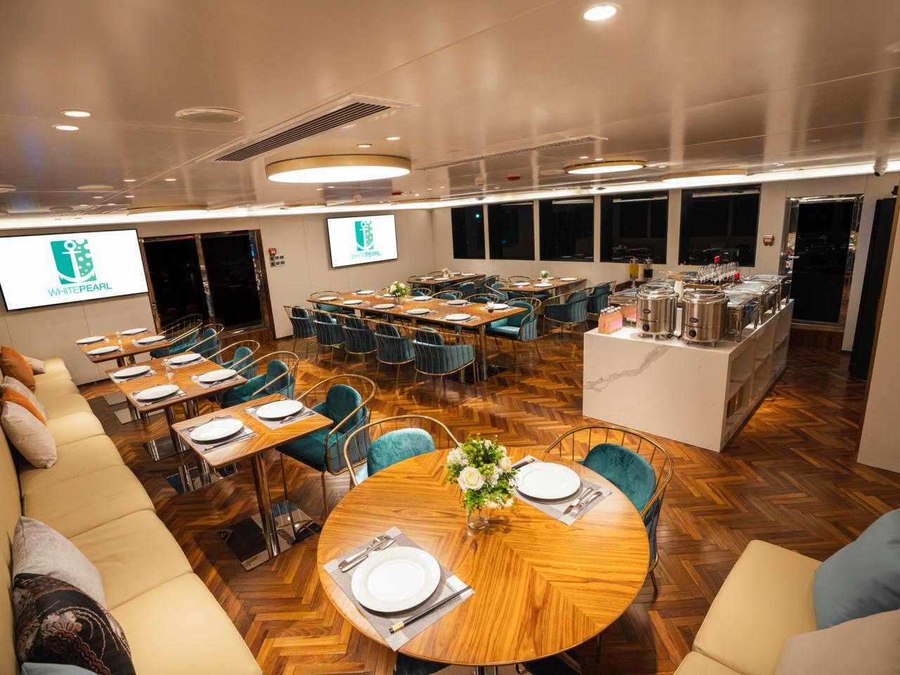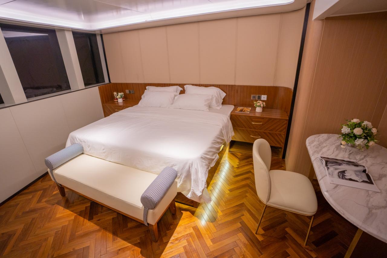 Suite - Located on the main deck, this cabin features a king/double-sized bed, ensuite bathroom with hot shower, high-definition television set with satellite television and Google cast, hassle-free keypad door lock system, and basic room amenities: 2-in-1 shampoo and bath gel, separate towel hangers for bath and face towels, clothes hooks, hair dryer, safety deposit box, USB ports for charging, inter-room communication system. Maximum Occupancy: 2 persons Bed Configuration: Double (King-sized) Ensuite: Yes Aircondition: Yes, with control in the room Master Cabin - Located on the main deck, each cabin features a king/double-sized bed, ensuite bathroom with hot shower, high-definition television set with satellite television and Google cast, hassle-free keypad door lock system, and basic room amenities: 2-in-1 shampoo and bath gel, separate towel hangers for bath and face towels, clothes hooks, hair dryer, safety deposit box, USB ports for charging, inter-room communication system. Maximum Occupancy: 2 persons Bed Configuration: Double (King-sized) Ensuite: Yes Aircondition: Yes, with control in the room Deluxe Double/Twin Cabin - Located on the upper deck, each cabin features a double/twin beds, ensuite bathroom with hot shower, high-definition television set with satellite television and Google cast, hassle-free keypad door lock system, and basic room amenities: 2-in-1 shampoo and bath gel, separate towel hangers for bath and face towels, clothes hooks, hair dryer, safety deposit box, USB ports for charging, inter-room communication system. Maximum Occupancy: 2 persons Bed Configuration: Double or Twin Ensuite: Yes Aircondition: Yes, with control in the room Deluxe Twin - Located on the upper deck, each cabin features a twin bed, ensuite bathroom with hot shower, high-definition television set with satellite television and Google cast, hassle-free keypad door lock system, and basic room amenities: 2-in-1 shampoo and bath gel, separate towel hangers for bath and face towels, clothes hooks, hair dryer, safety deposit box, USB ports for charging, inter-room communication system. Maximum Occupancy: 2 persons Bed Configuration: Twin (2 Single) Ensuite: Yes Aircondition: Yes, with control in the room