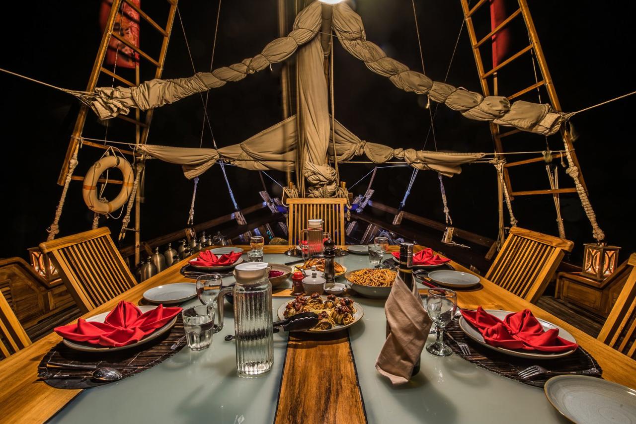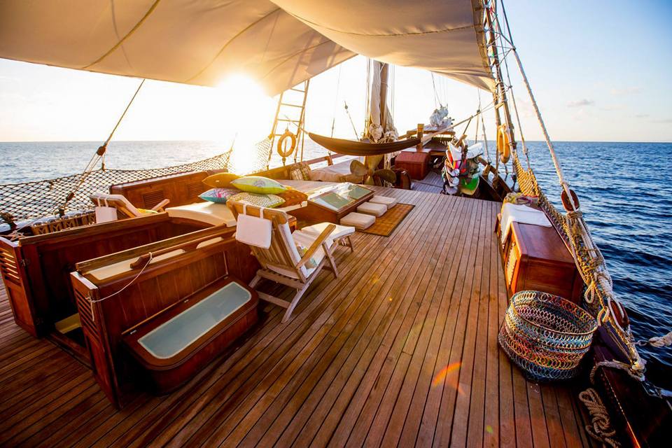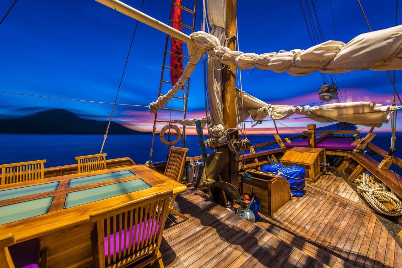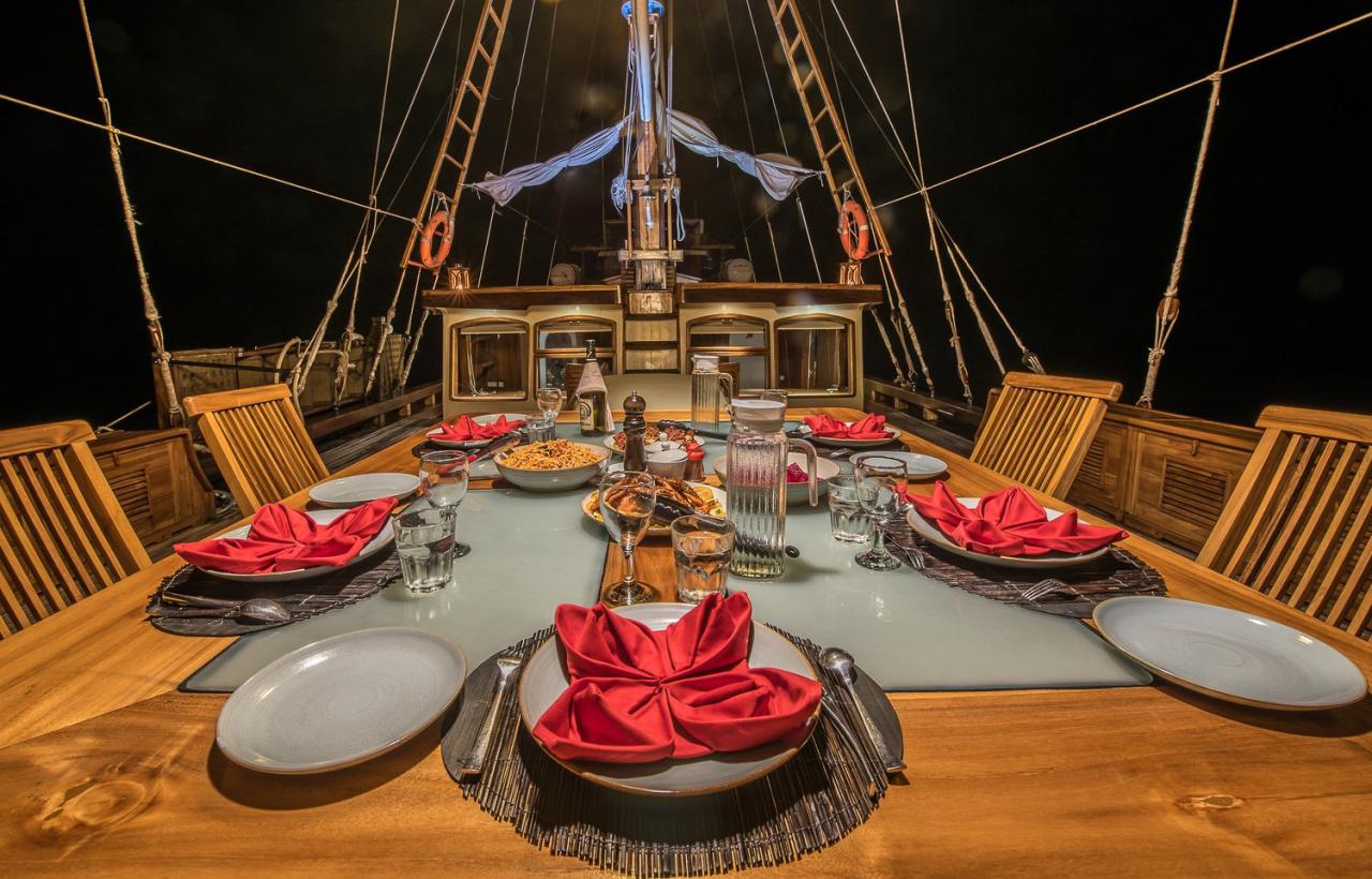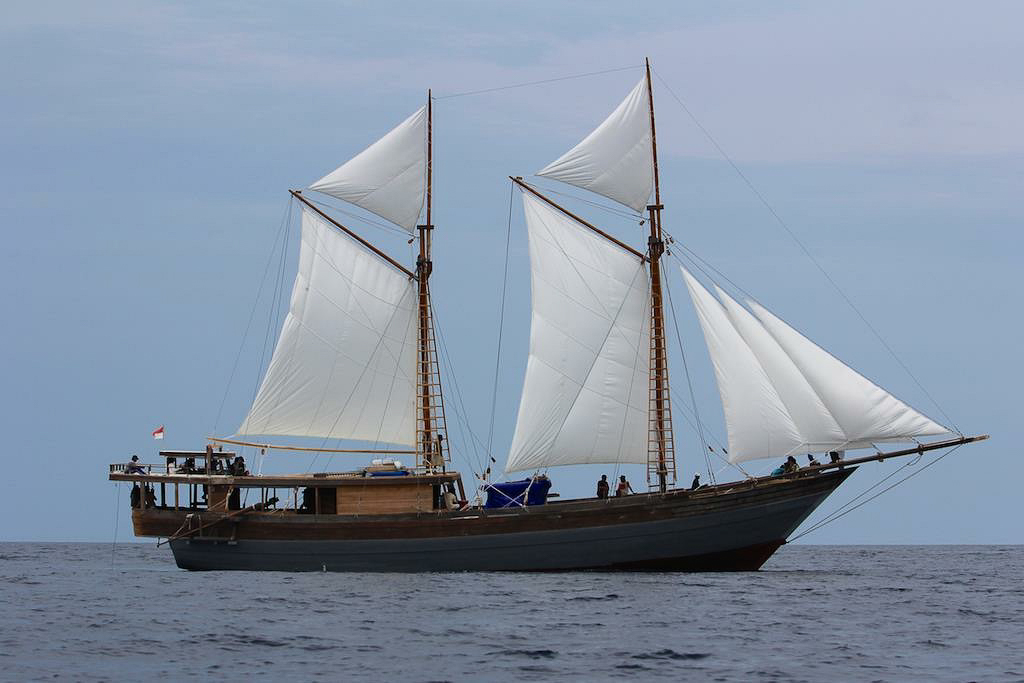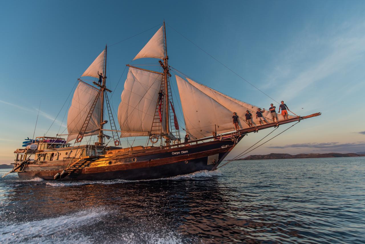 The Carpe Diem Phinisi offers year-round dive excursions in Raja Ampat and Komodo National Park and is ideal for small parties and individuals who seek a more personalized experience. Only four cabins are available, with a maximum of eight passengers. The Nutmeg cabin is a huge double that spans almost the full width of the yacht and is positioned on the main deck. It boasts a skylight wide forward-facing windows, and plenty of storage. The Clove cabin is located on the lower deck and includes two single beds that can be set up to one double bed upon request. Cabins Pandan and Cinnamon are also on the lower deck.There is one double and one single in this set, which can also be utilized as a triple. The lower deck staterooms have portholes and skylights for natural light and ventilation, and all cabins have en-suite bathrooms and individually controlled air conditioning.The well-appointed saloon in the main deckhouse, which can comfortably seat eight guests around the big table, is one of the social places. Delicious, locally sourced meals are served al fresco, and dietary restrictions can be accommodated with early notice.Raja Ampat from November to April, Komodo from May to September, and some amazing experiences in Ambon, the Banda Islands, and South Raja Ampat are included on the Carpe Diem Phinisi's dive itineraries. Dive groups are kept small, and each dive is conducted by a qualified dive guide with extensive local knowledge and a high level of service. The cost of the excursion also includes the use of diving equipment.