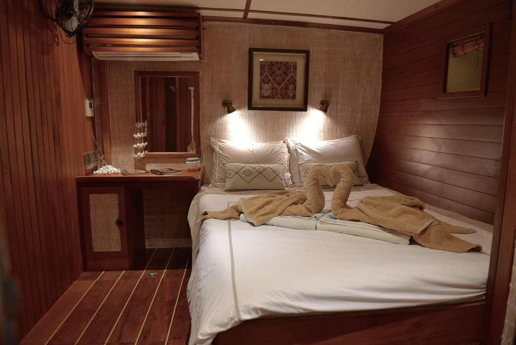 Lower Deck Twin - Twin cabins on the lower deck are about 12 square meters with portholes, two single bunk-style beds, individually controlled air conditioning, a fan, and a mini-safe. Each cabin has an ensuite bathroom with a shower, two cabin towels, and one sun deck towel, and hairdryers are available upon request. Maximum Occupancy: 2 persons Bed Configuration: Twin Ensuite: Yes Aircondition: Yes, with control in the room Lower Deck Double - Double cabins in the lower deck are about 9 square meters with portholes, queen-sized double beds, individually controlled air conditioning, a fan, and a mini-safe. Each cabin has an ensuite bathroom with shower, 2 cabin towels, and one sun deck towel, and hairdryers are available upon request. Maximum Occupancy: 2 persons Bed Configuration: Double Ensuite: Yes Aircondition: Yes, with control in the room