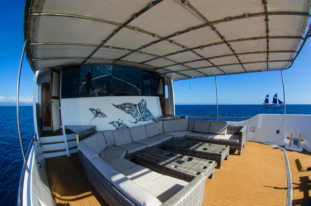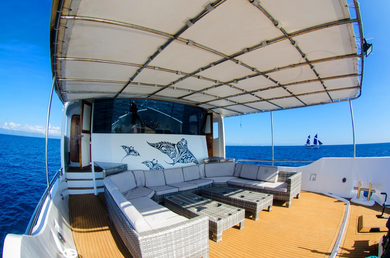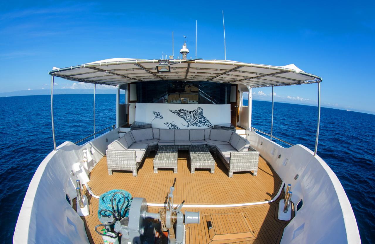 Nitrox and CCR friendly the SEADOORS, is a 25 meters steel vessel, powered by two Yanmar engines 6 cylinders, can easily accommodate 16 guests, Deck floors with teak design giving a great design, comfortable and not slippery on the sundeck, front deck, dinning deck and dive deck. The 8 large cabins have all a double bed plus an additional single bed. All the cabins have an elegant wooden finishing, are air conditioned and have private bathrooms with hot water. .The main facilities of the boat are on the lower deck providing guest with a spacious indoor air-conditioned living room with comfortable sofas, camera charging station, flatscreen and sound system. Dining is outdoors under a covered area with ocean view, a cocktail bar and sound system. . The dive deck provides good space for the divers. There are two decks, the one on the bow offers a shaded relaxation area, and the upper deck is for sun bathing lovers. Anti UV cover on the sundeck to enjoy the sundeck even during the day. Equipment on boardStandard equipment for 220VAC and 12VDCTwo solar panels for maintenanceTwo genset 80KVA and 65KVAWatermaker Technicomar 220V 200L/HElectronic instruments: Chart plotter raymarine AXIOM,Navionic chart, Raymarine RADAR, 3D echo sounder, deckcamera, AIS Raymarine, EPIRB ocean signal, and waterproofVHF, GPSCrewThere are ten crew members: the captain, chief mate, 2 mechanics, stewart, 2 Zodiac crew, 2 sailors, one cook. Staff CMAS and PADI, English French speaking 2 instructors and 2 dive masters.Diving equipmentDiving platform with teak design, giving more space and large rinsing tabs. It has personal drawers and shelves for each diver,to store their own equipment. Two high powered polyester dinghys 8 meters long each follow Seadoors to reach the different diving sites. The boat is equipped with a scuba air-filling station, with two air compressors, 18 cubic meters per hour, Nitrox blender, Oxygen booster, 45 Aluminium tanks 10, 12, 15 liters, and underwater scooters.Emergency EquipmentSeadoors is equiped with all the safety equipment needed. The crew is specially trained in all purposes of safety, including emergency and evacuation procedures. The emergency equipment on board includes: EPIRB Emergency Position Indicating Radio Beacon, AIS Raymarine class A (Automatic Identification System), Raymarine AXIOM chart plotter, Life raft -life jackets -fire extinguishers, Emergency long distance radios, Satellite phone Thuraya, 16 pure medical oxygen tanks, 50L each, 2 portable DAN wallets with oxygen tanks and resuscitator masks BAVU -Pharmacy.