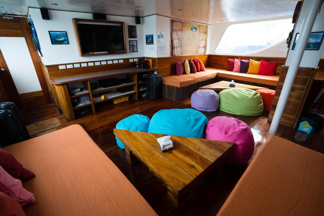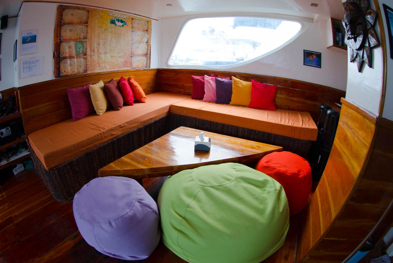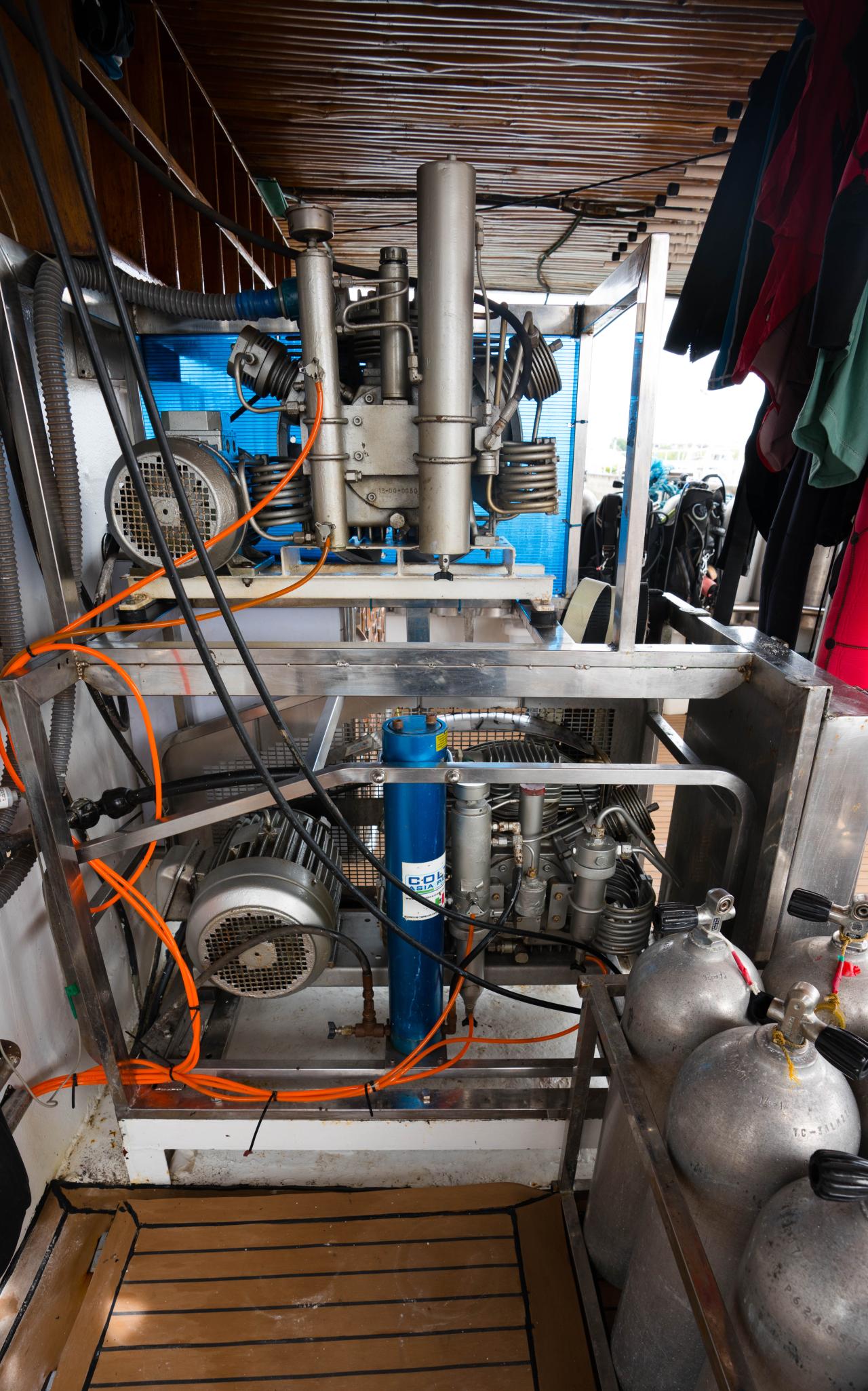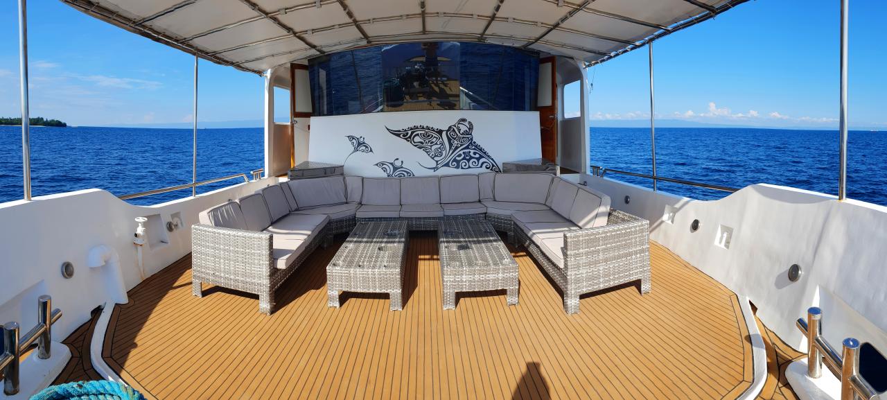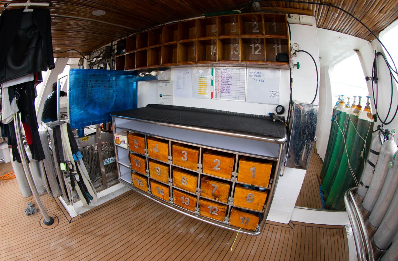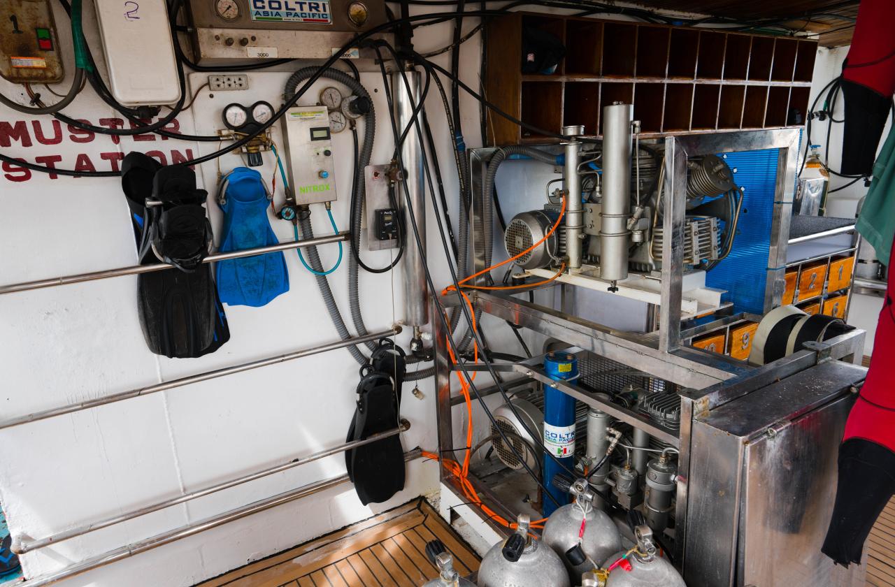Length overall: 27 meters Width: 6 meters Engine: 2 X Marine engine Yanmar 300 Hp. Cruising speed: 8 knots Generators: 2 Deutz generators: 80 KVA, 65 KVA Compressors: 2 air compressors, 2 nitrox Blender Freshwater: Freshwater tanks 27 tons, 2 x Watermakers 15020 lts / day Fuel tanks: 8 tons Passengers: 16 8 Cabins – 2 STANDARDS double bed + berth (main deck) – 2 DELUXE double bed + berth “Sea View” (main deck) – 4 STANDARDS double bed + berth (upper deck) Crew members: 16 crew including 2 dive guides + 1 western cruise director/ dive instructor Safety: Smoke detectors, Stern CCTV, 2 lift rafts, EPIRB. Navigation: GPS, chart plotter, Depth sounder, Radar Communication: Radio VHF, Radio UHF, sat phone number: +88-216645-04253 Dive boats: 2 fiberglass chaseboats with Yamaha 75 HP outboard engines Rebreathers: 2 x ISC Megalodons, 1 O2 Booster hazkel, Sofnolime, 4 sets CCR tanks