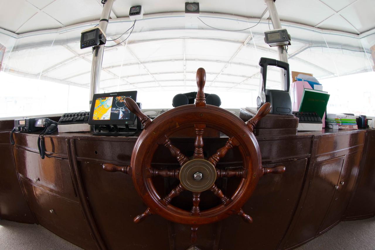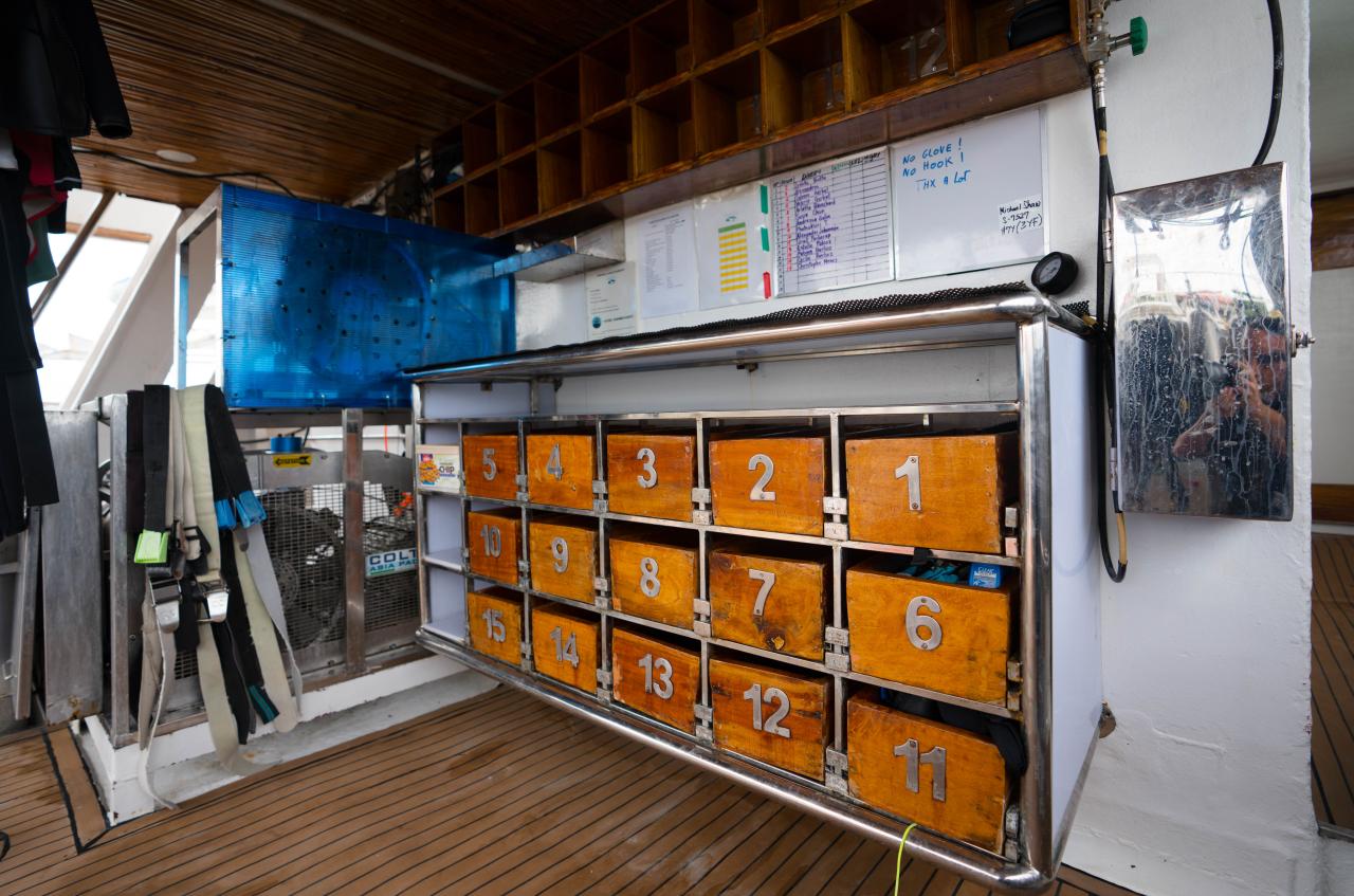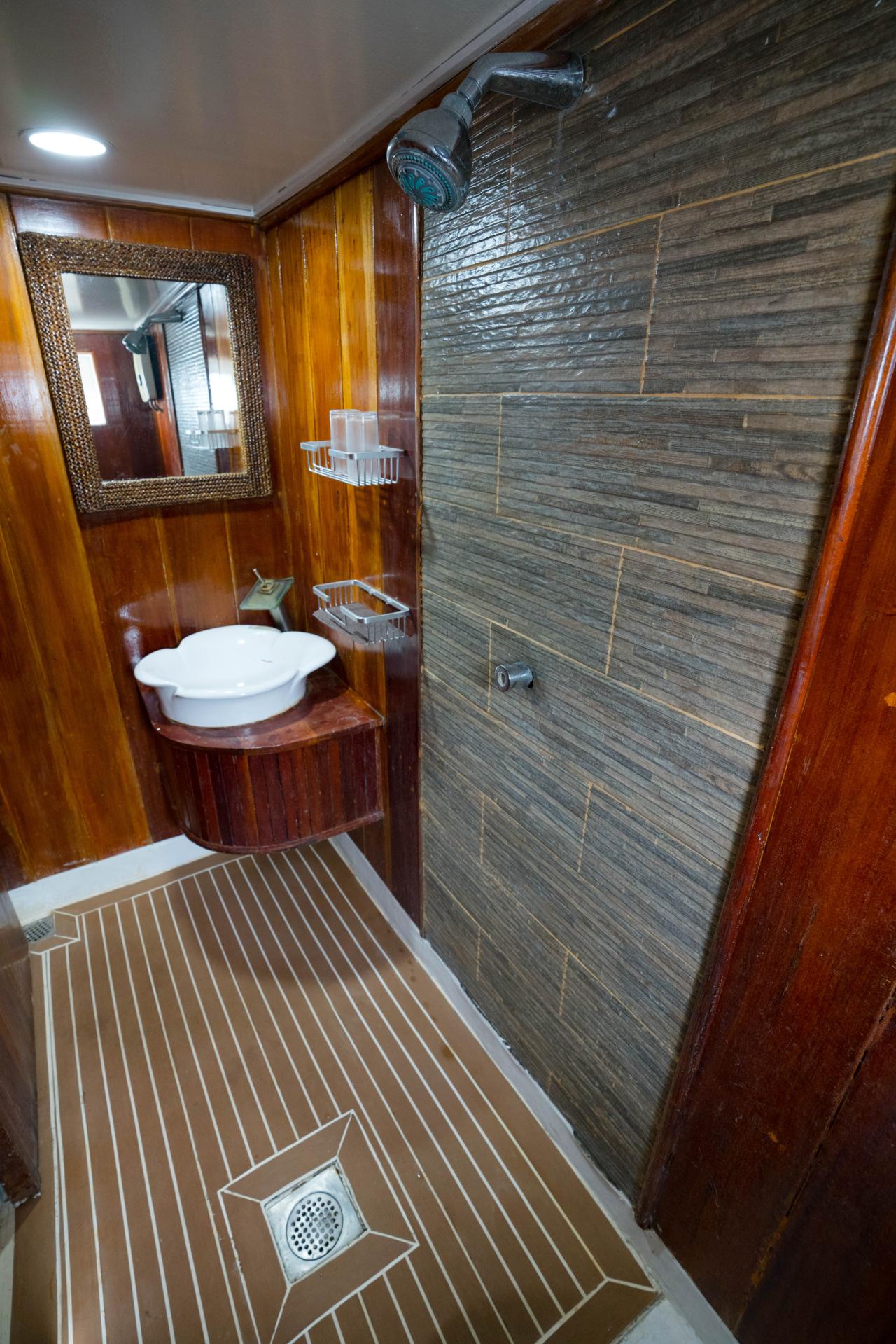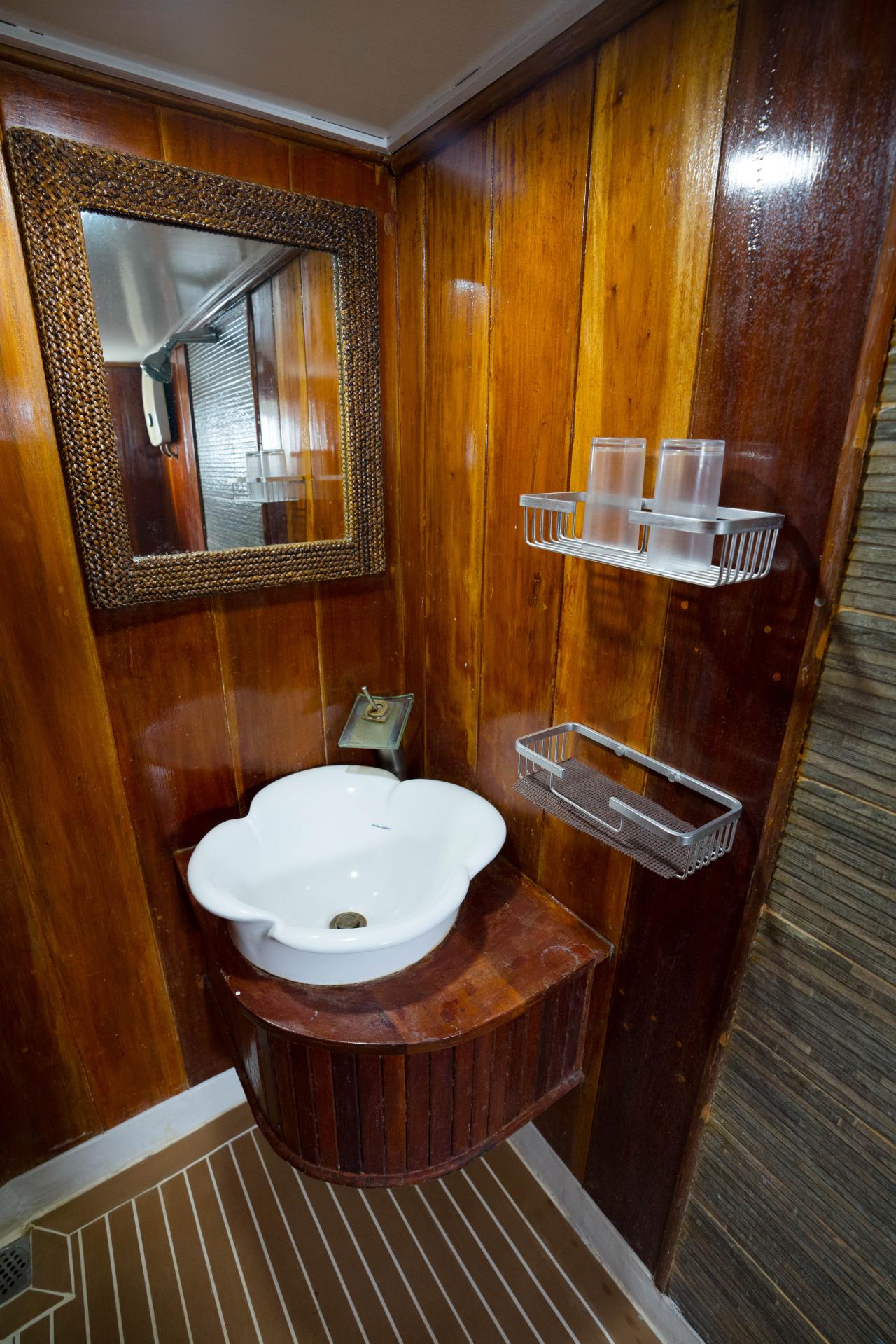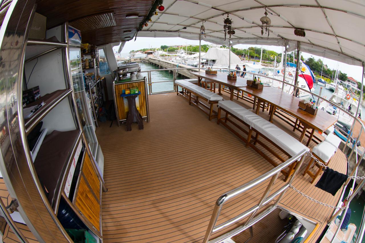 Length overall: 27 meters Width: 6 meters Engine: 2 X Marine engine Yanmar 300 Hp. Cruising speed: 8 knots Generators: 2 Deutz generators: 80 KVA, 65 KVA Compressors: 2 air compressors, 2 nitrox Blender Freshwater: Freshwater tanks 27 tons, 2 x Watermakers 15020 lts / day Fuel tanks: 8 tons Passengers: 16 8 Cabins – 2 STANDARDS double bed + berth (main deck) – 2 DELUXE double bed + berth “Sea View” (main deck) – 4 STANDARDS double bed + berth (upper deck) Crew members: 16 crew including 2 dive guides + 1 western cruise director/ dive instructor Safety: Smoke detectors, Stern CCTV, 2 lift rafts, EPIRB. Navigation: GPS, chart plotter, Depth sounder, Radar Communication: Radio VHF, Radio UHF, sat phone number: +88-216645-04253 Dive boats: 2 fiberglass chaseboats with Yamaha 75 HP outboard engines Rebreathers: 2 x ISC Megalodons, 1 O2 Booster hazkel, Sofnolime, 4 sets CCR tanks
