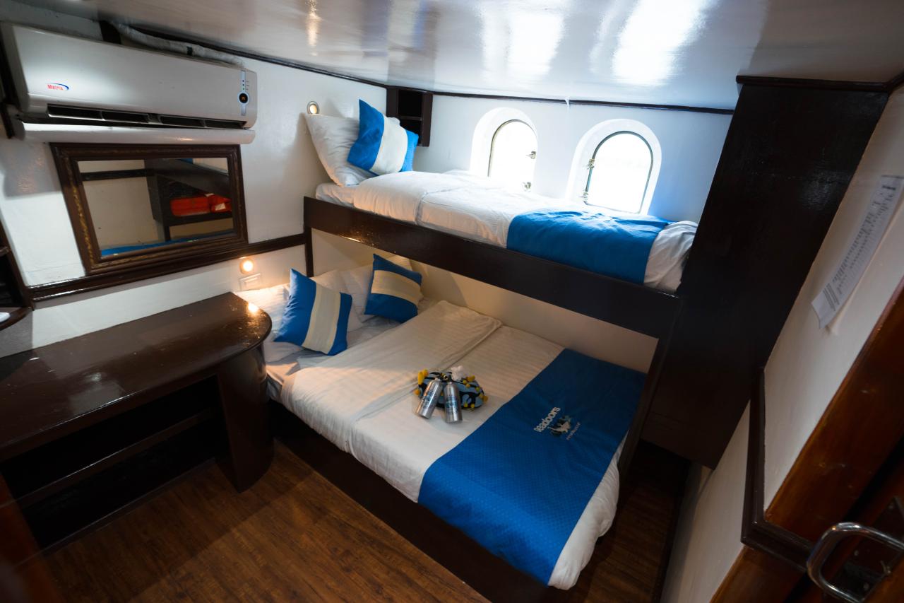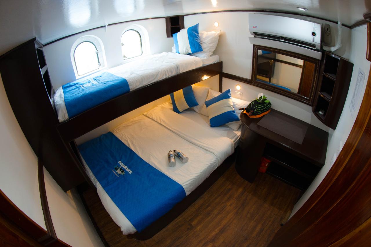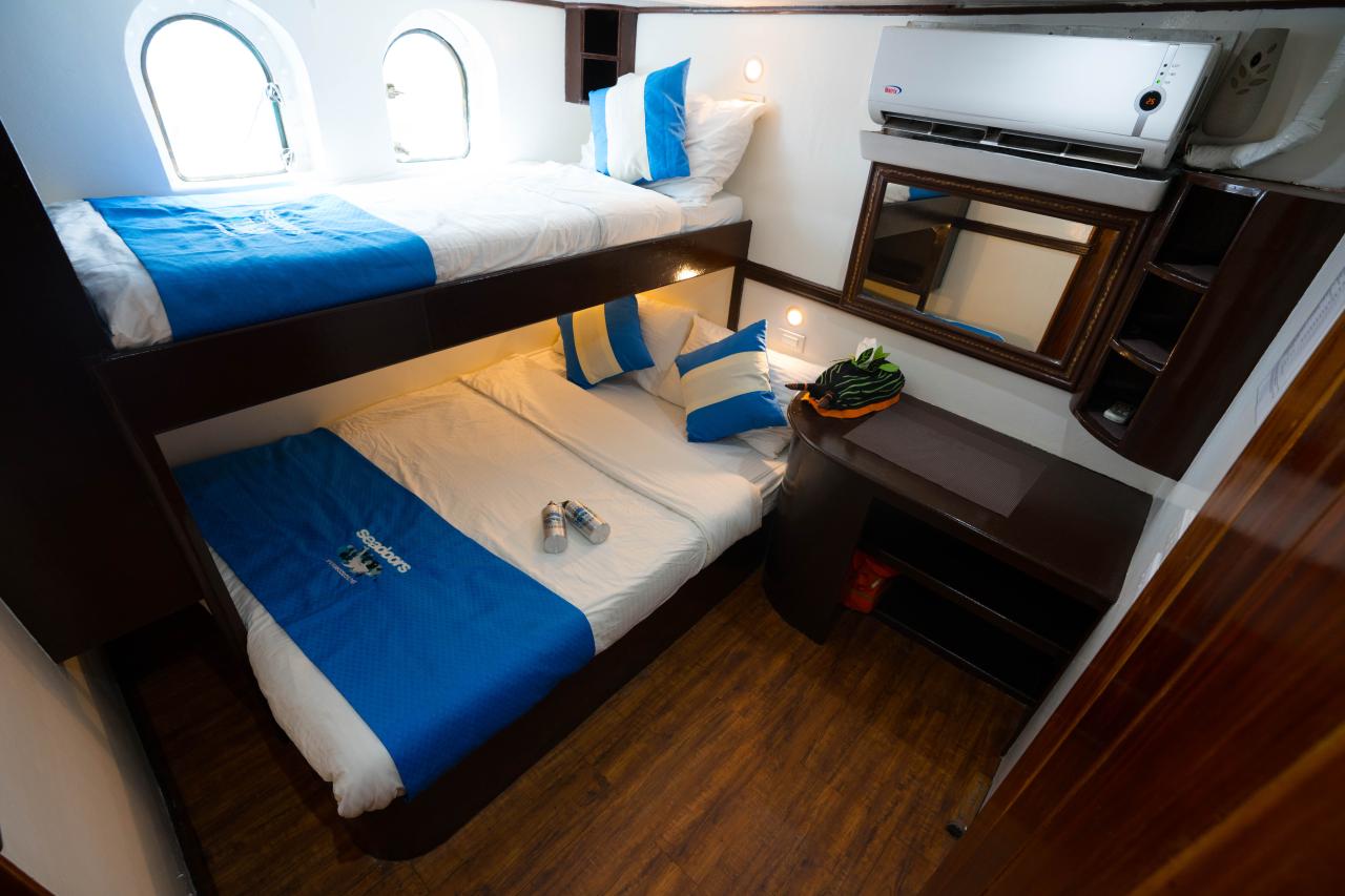 Maximum Occupancy: 2 persons Bed Configuration: Single and Double beds En suite: YesAircon: Aircon with control in the room Package Inclusions: • Transportation from a local airport or hotel to and from a boat. • Room (double bed + single bed) In-flight stay in shower room and private bathroom. • All in-flight meals, coffee pots, tea, fruit juice. • Non-alcoholic beverages (drinks, soda, water, etc.) • 3 to 4 diving, navigation and diving safety conditions including night diving • Tank 12L, Ballast and Belt