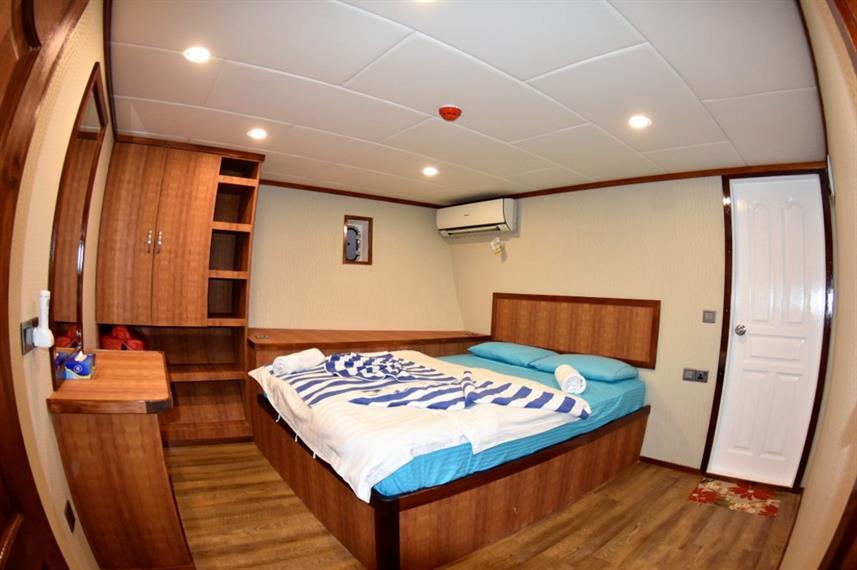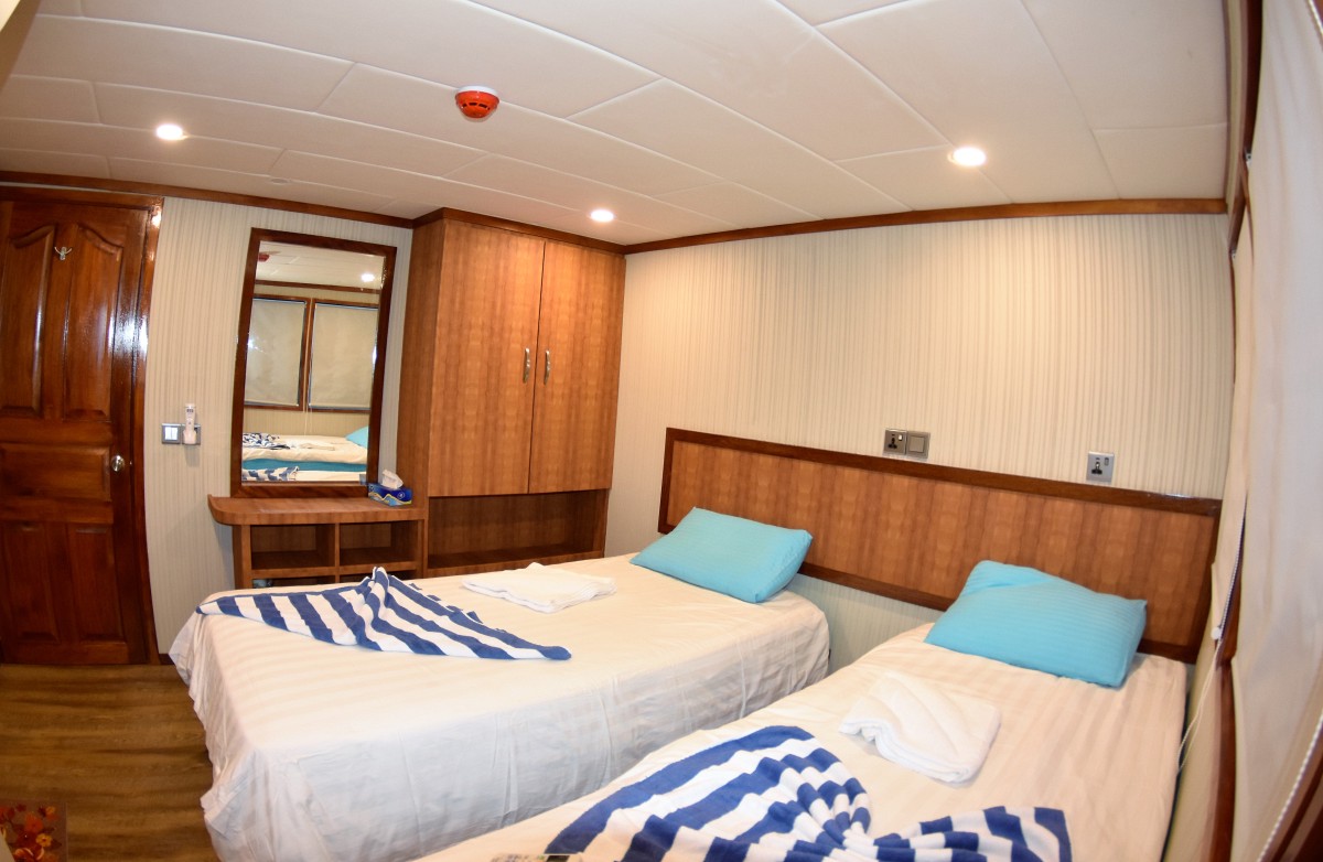 Lower Deck Twin - Lower deck twin cabins with portholes at approximately 9 square meters, each with an individually controlled air conditioner. Cabins 1 and 8 can be converted to doubles, on request. Each cabin has an ensuite bathroom at approximately 3 square meters and 2 cabin towels are provided per guest. Hairdryers are available upon request. Maximum Occupancy: 2 persons Bed Configuration: Twin Ensuite: Yes Aircondition: Yes, with control in the room Lower Deck Double - Lower deck double cabins with portholes at approximately 9 square meters, each with an individually controlled air conditioner. Each cabin has an ensuite bathroom at approximately 3 square meters and 2 cabin towels are provided per guest. Hairdryers are available upon request. Maximum Occupancy: 2 persons Bed Configuration: Double Ensuite: Yes Aircondition: Yes, with control in the room Upper Deck Suite Double - Upper deck suite double with windows at approximately 16 square meters, suitable for a family with a double bed and a sofa bed, and an individually controlled air conditioner. Each cabin has an ensuite bathroom at approximately 7 square meters and 2 cabin towels are provided per guest. Hairdryers are available upon request. Maximum Occupancy: 2 persons Bed Configuration: Double Ensuite: Yes Aircondition: Yes, with control in the room Upper Deck Twin - Upper deck twin cabins with windows at approximately 7 to 9 square meters with an individually controlled air conditioner. Cabins 10 and 11 can be converted to doubles, on request. Each cabin has an ensuite bathroom at approximately 1.5 to 3 square meters and 2 cabin towels are provided per guest. Hairdryers are available upon request. Maximum Occupancy: 2 persons Bed Configuration: Twin Ensuite: Yes Aircondition: Yes, with control in the room