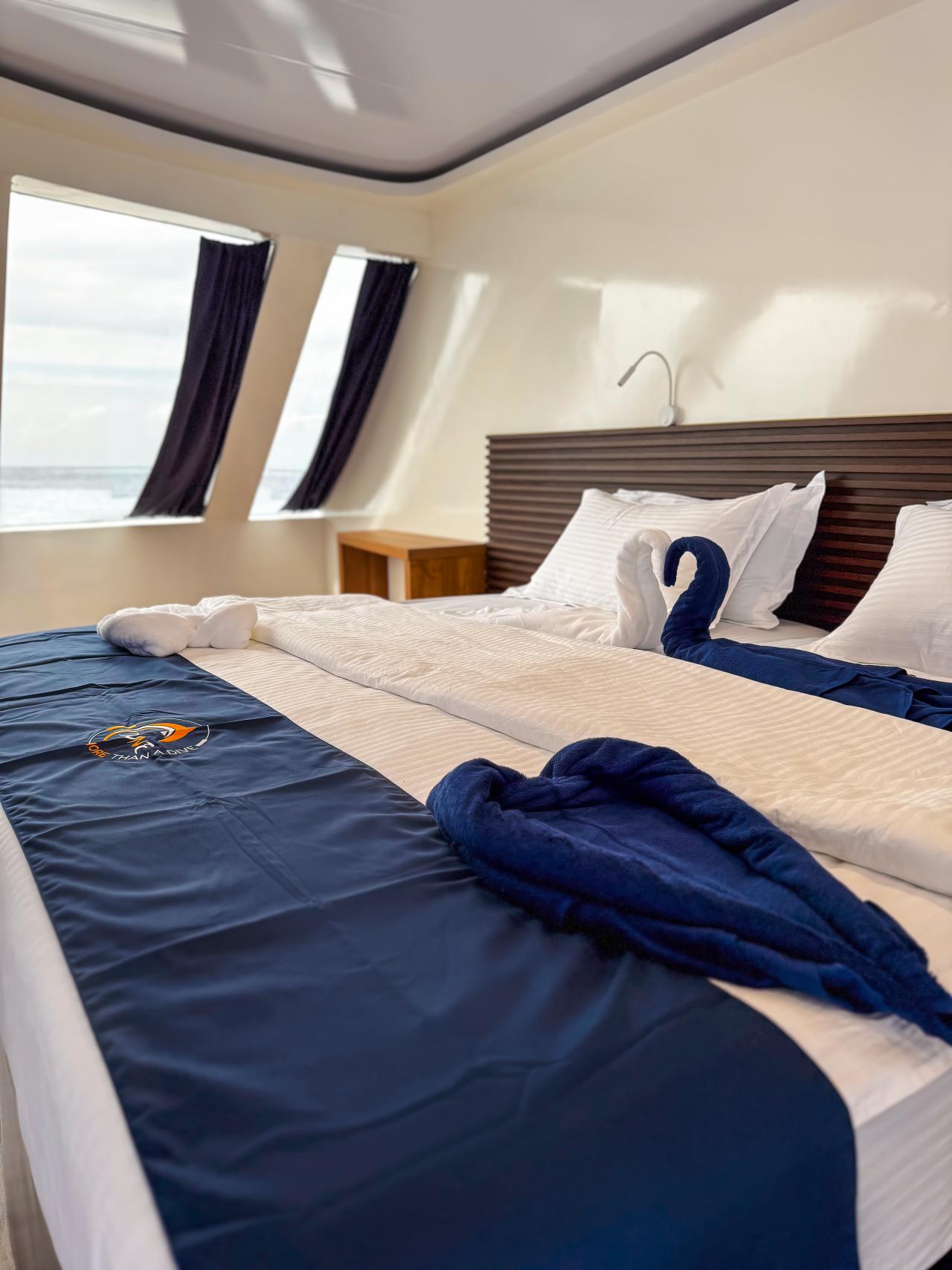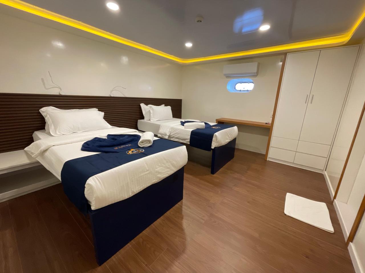 Situated on the upper deck, every cabin features an ensuite bathroom, individually adjustable air conditioning, generous storage space, and additional towels.Maximum Occupancy: 2 PersonsBed Configuration: Twin or DoubleEnsuite: YesAircondition: Yes, with control in the cabin