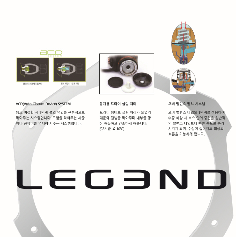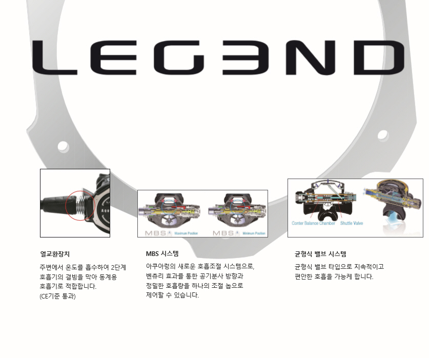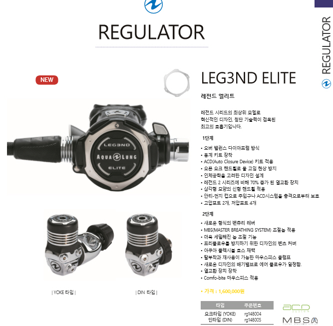 It is the best respiratory system for cost performance with innovative design and advanced technology as the top model of the Legend series. Cool for the price!Don't miss the best chance to buy respiratorsStep 1-Overbalance diaphragm method-Fitted with a winter kit-Apply ACD kit- Open yoke handwheel to prevent water ingestion-Design considering human airport- Heat exchanger increased by 70 per cent in flight during the Legend 2 period-Application of new triangle shaped handwheel- Anti-dust cam protects filler or ACD system from impact- 2 high pressure ports, 4 low pressure poinsStep 2-New type of venturi lever-Advanced knob control function- Benz cover designed to prevent free flow-Adopt Aqua Flexible Hose-Removable and reusable mouthpiece clamp- Airflow is constant with new design exhaust valves-Installation of heat exchanger-Compo-bite mouthpiece applicationPlease give me the information when ordering York type and Dean type