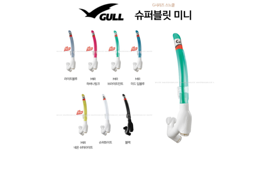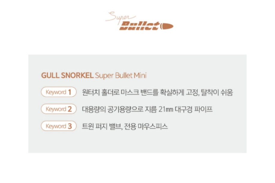 GULL Super Bullet Mini Snorkel GULL SNORKEL Super Bullet Mini Keyword 1-Keep mask band firmly fixed with one-touch holder, easy to attach and detach 2-large capacity 21mm diameter pipe with large capacity 3-Twin purge valve, dedicated mouthpiece Stabilizer pipe Resolve vibration and shaking caused by water resistance One-touch holder: To accentuate the function of mask band DX, use a mask band Only one outer mask band is recommended for installation a dedicated mouthpiece Men's upper and lower asymmetric designs are adopted to fit the teeth engagement Size divided for female models only and jaw doesn't get tired even after long use Length 405 mm | Volume 180 cc | Weight 186 g | Inner diameter 21Ø Twin purge valve During cleaning, the remaining water is effectively directed to a separate drain chamber to clear the air passage Ensure that the remaining water during cleansing is also difficult to flow back to the mouth Snorkel Clear Very Easy